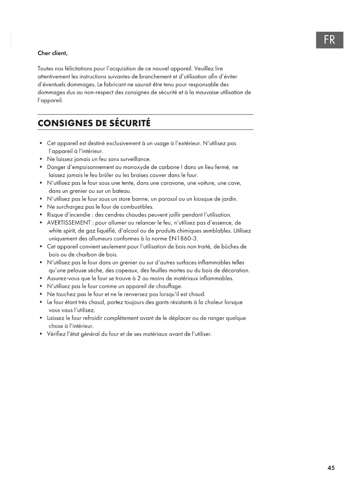- DANGER d'empoisonnement au monoxyde de carbone! Dans un lieu fermé, ne laissez jamais le feu brûler ou les braises couver dans le four.