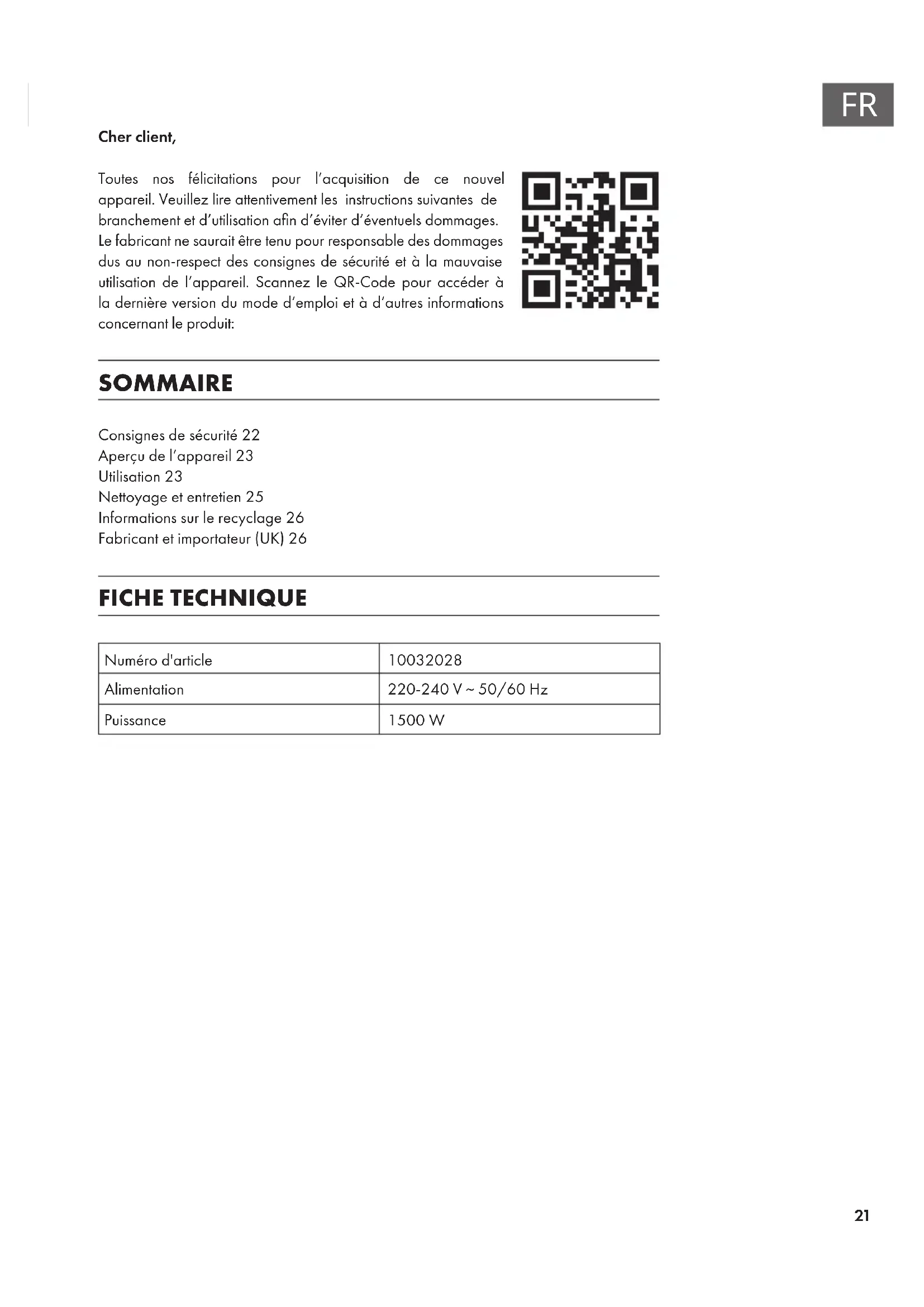 Cher client, Toutes nos félicitations pour l’acquisition de ce nouvel appareil. Veuillez lire attentivement les instructions suivantes de branchement et d’utilisation an d’éviter d’éventuels dommages. Le fabricant ne saurait être tenu pour responsable des dommages dus au non-respect des consignes de sécurité et à la mauvaise utilisation de l’appareil. Scannez le QR-Code pour accéder à la dernière version du mode d‘emploi et à d‘autres informations concernant le produit: SOMMAIRE Consignes de sécurité22 Aperçu de l’appareil23 Utilisation23 Nettoyage et entretien25 Informations sur le recyclage26 Fabricant et importateur (UK)26 FICHE TECHNIQUE Numéro d'article