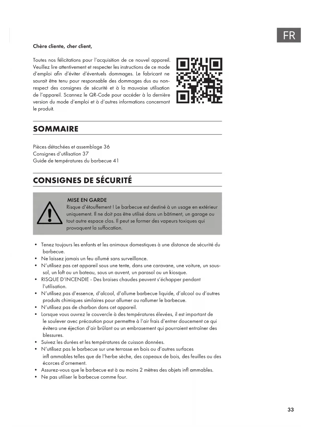 Chère cliente, cher client, Toutes nos félicitations pour l’acquisition de ce nouvel appareil. Veuillez lire attentivement et respecter les instructions de ce mode d’emploi a n d’éviter d’éventuels dommages. Le fabricant ne saurait être tenu pour responsable des dommages dus au non- respect des consignes de sécurité et à la mauvaise utilisation de l’appareil. Scannez le QR-Code pour accéder à la dernière version du mode d‘emploi et à d‘autres informations concernant le produit. SOMMAIRE Pièces détachées et assemblage36 Consignes d‘utilisation37 Guide de températures du barbecue41