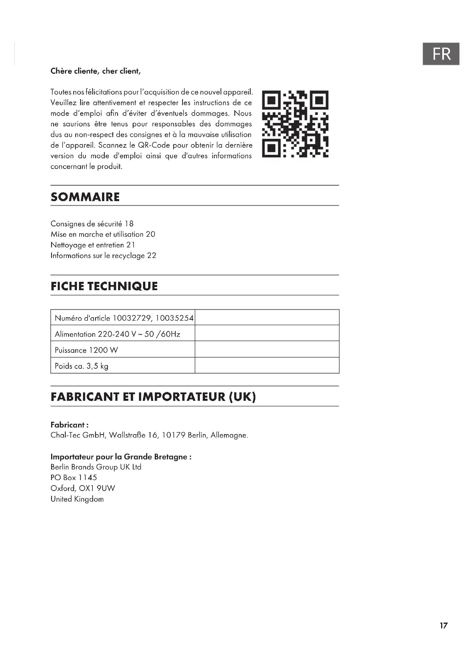 Chère cliente, cher client, Toutes nos félicitations pour l’acquisition de ce nouvel appareil. Veuillez lire attentivement et respecter les instructions de ce mode d’emploi an d’éviter d’éventuels dommages. Nous ne saurions être tenus pour responsables des dommages dus au non-respect des consignes et à la mauvaise utilisation de l’appareil. Scannez le QR-Code pour obtenir la dernière version du mode d'emploi ainsi que d'autres informations concernant le produit. SOMMAIRE Consignes de sécurité18 Mise en marche et utilisation20 Nettoyage et entretien21 Informations sur le recyclage22 FICHE TECHNIQUE Numéro d'article 10032729, 10035254 Alimentation 220-240 V ~ 50 /60Hz Puissance 1200 W Poids ca. 3,5 kg FABRICANT ET IMPORTATEUR (UK) Fabricant : Chal-Tec GmbH, Wallstraße 16, 10179 Berlin, Allemagne. Importateur pour la Grande Bretagne : Berlin Brands Group UK Ltd PO Box 1145 Oxford, OX1 9UW United Kingdom18