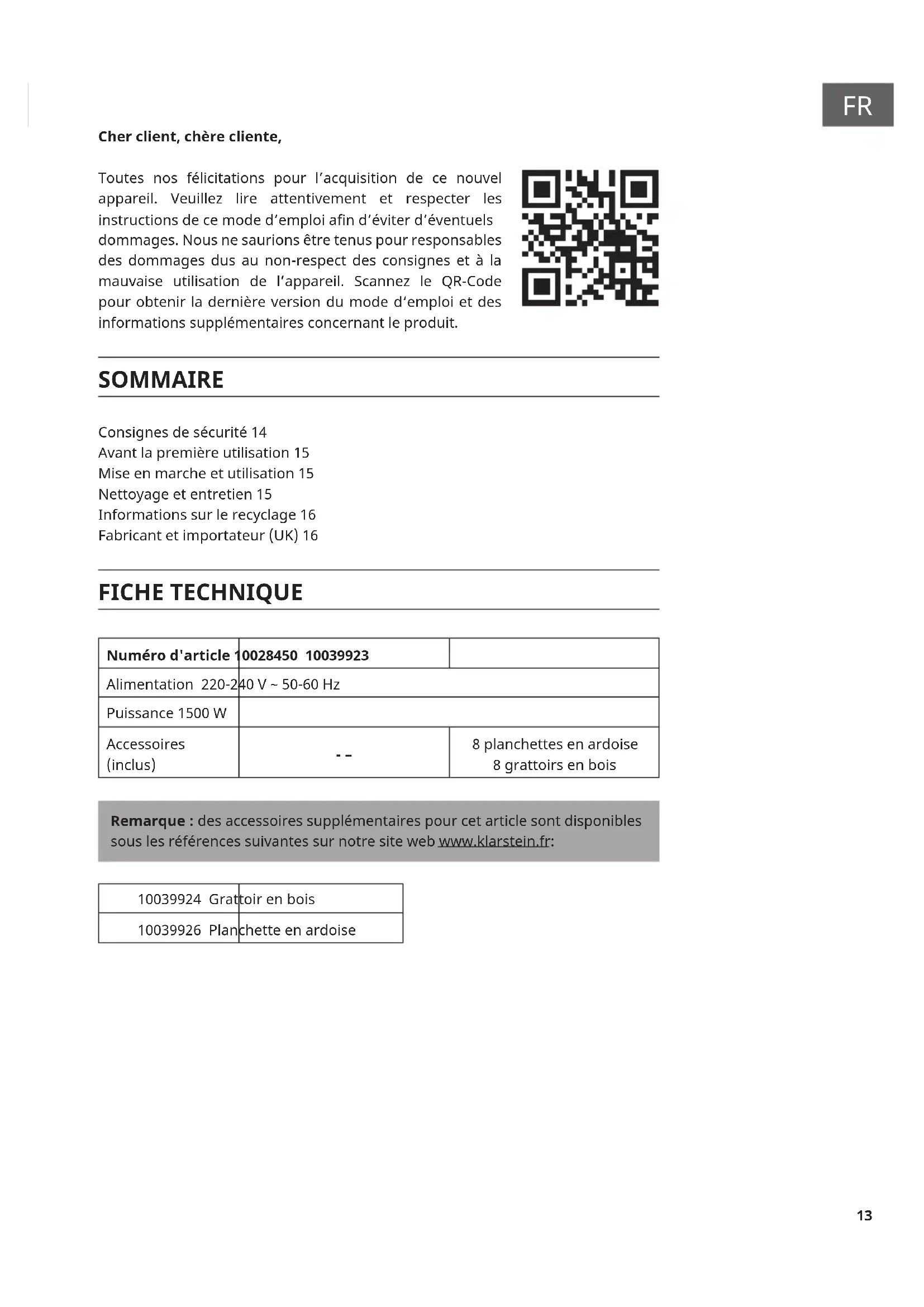 Cher client, chère cliente, Toutes nos félicitations pour l’acquisition de ce nouvel appareil. Veuillez lire attentivement et respecter les instructions de ce mode d’emploi an d’éviter d’éventuels dommages. Nous ne saurions être tenus pour responsables des dommages dus au non-respect des consignes et à la mauvaise utilisation de l’appareil. Scannez le QR-Code pour obtenir la dernière version du mode d‘emploi et des informations supplémentaires concernant le produit. SOMMAIRE Consignes de sécurité 14 Avant la première utilisation 15 Mise en marche et utilisation 15 Nettoyage et entretien 15 Informations sur le recyclage 16 Fabricant et importateur (UK) 16 FICHE TECHNIQUE Numéro d'article 10028450 10039923 Alimentation 220-240 V ~ 50-60 Hz Puissance 1500 W Accessoires (inclus)
