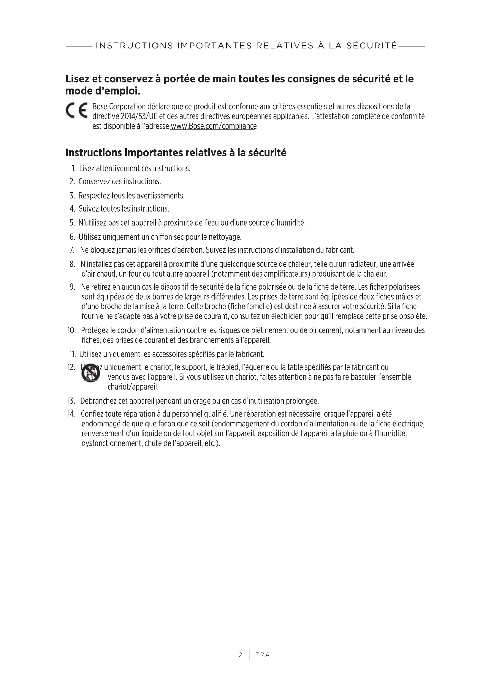 FRA Lisez et conservez à portée de main toutes les consignes de sécurité et le mode d’emploi. Bose Corporation déclare que ce produit est conforme aux critères essentiels et autres dispositions de la directive 2014/53/UE et des autres directives européennes applicables. L’attestation complète de conformité est disponible à l’adresse www.Bose.com/compliance Instructions importantes relatives à la sécurité