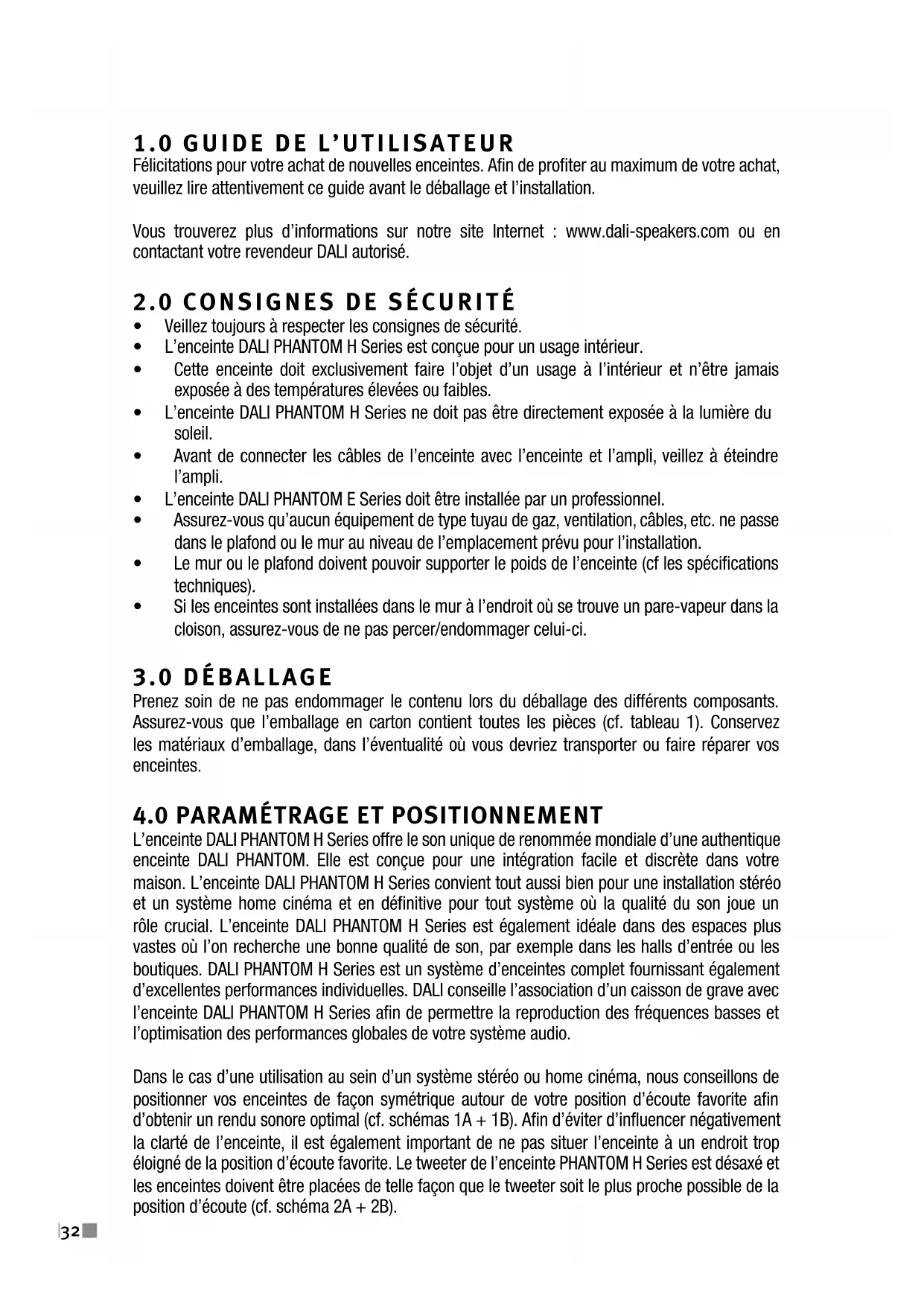 L’enceinte DALI PHANTOM H Series offre le son unique de renommée mondiale d’une authentique enceinte DALI PHANTOM. Elle est conçue pour une intégration facile et discrète dans votre maison. L’enceinte DALI PHANTOM H Series convient tout aussi bien pour une installation stéréo et un système home cinéma et en définitive pour tout système où la qualité du son joue un rôle crucial. L’enceinte DALI PHANTOM H Series est également idéale dans des espaces plus vastes où l’on recherche une bonne qualité de son, par exemple dans les halls d’entrée ou les boutiques. DALI PHANTOM H Series est un système d’enceintes complet fournissant également d’excellentes performances individuelles. DALI conseille l’association d’un caisson de grave avec l’enceinte DALI PHANTOM H Series afin de permettre la reproduction des fréquences basses et l’optimisation des performances globales de votre système audio. Dans le cas d’une utilisation au sein d’un système stéréo ou home cinéma, nous conseillons de positionner vos enceintes de façon symétrique autour de votre position d’écoute favorite afin d’obtenir un rendu sonore optimal (cf. schémas 1A + 1B). Afin d’éviter d’influencer négativement la clarté de l’enceinte, il est également important de ne pas situer l’enceinte à un endroit trop éloigné de la position d’écoute favorite. Le tweeter de l’enceinte PHANTOM H Series est désaxé et les enceintes doivent être placées de telle façon que le tweeter soit le plus proche possible de la position d’écoute (cf. schéma 2A + 2B).UK DE DK CN FR