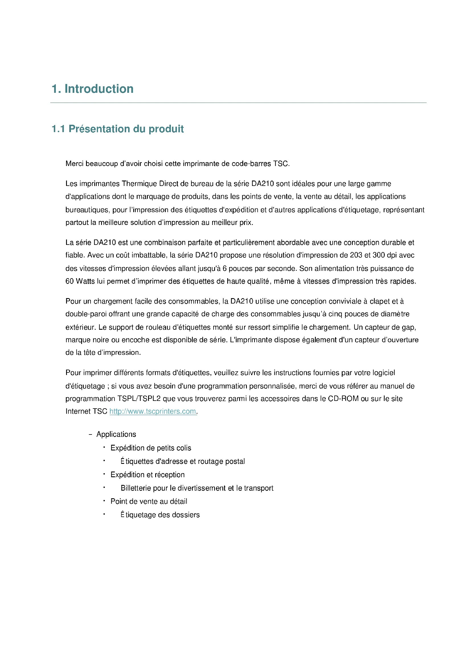 Merci beaucoup d’avoir choisi cette imprimante de code-barres TSC. Les imprimantes Thermique Direct de bureau de la série DA210 sont idéales pour une large gamme d'applications dont le marquage de produits, dans les points de vente, la vente au détail, les applications bureautiques, pour l’impression des étiquettes d'expédition et d'autres applications d'étiquetage, représentant partout la meilleure solution d’impression au meilleur prix. La série DA210 est une combinaison parfaite et particulièrement abordable avec une conception durable et fiable. Avec un coût imbattable, la série DA210 propose une résolution d'impression de 203 et 300 dpi avec des vitesses d'impression élevées allant jusqu'à 6 pouces par seconde. Son alimentation très puissance de 60 Watts lui permet d’imprimer des étiquettes de haute qualité, même à vitesses d'impression très rapides. Pour un chargement facile des consommables, la DA210 utilise une conception conviviale à clapet et à double-paroi offrant une grande capacité de charge des consommables jusqu’à cinq pouces de diamètre extérieur. Le support de rouleau d'étiquettes monté sur ressort simplifie le chargement. Un capteur de gap, marque noire ou encoche est disponible de série. L'imprimante dispose également d'un capteur d’ouverture de la tête d’impression. Pour imprimer différents formats d'étiquettes, veuillez suivre les instructions fournies par votre logiciel d'étiquetage ; si vous avez besoin d'une programmation personnalisée, merci de vous référer au manuel de programmation TSPL/TSPL2 que vous trouverez parmi les accessoires dans le CD-ROM ou sur le site Internet TSC http://www.tscprinters.com. − Applications Expédition de petits colis É tiquettes d'adresse et routage postal Expédition et réception Billetterie pour le divertissement et le transport Point de vente au détail É tiquetage des dossiers- 2 -