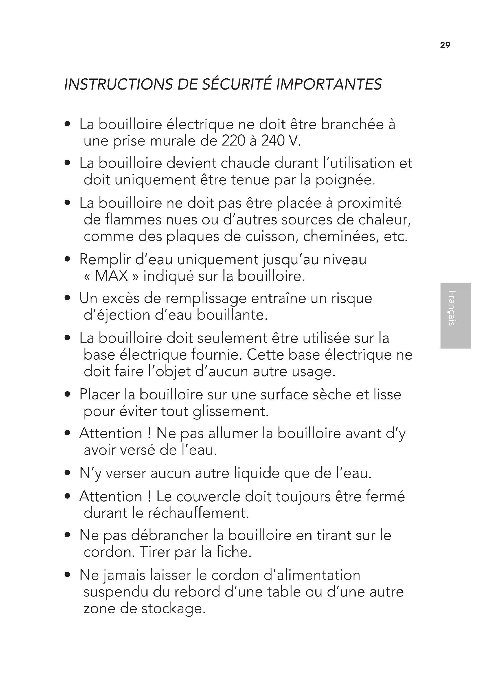 - La bouilloire électrique ne doit être branchée à une prise murale de 220à240V.