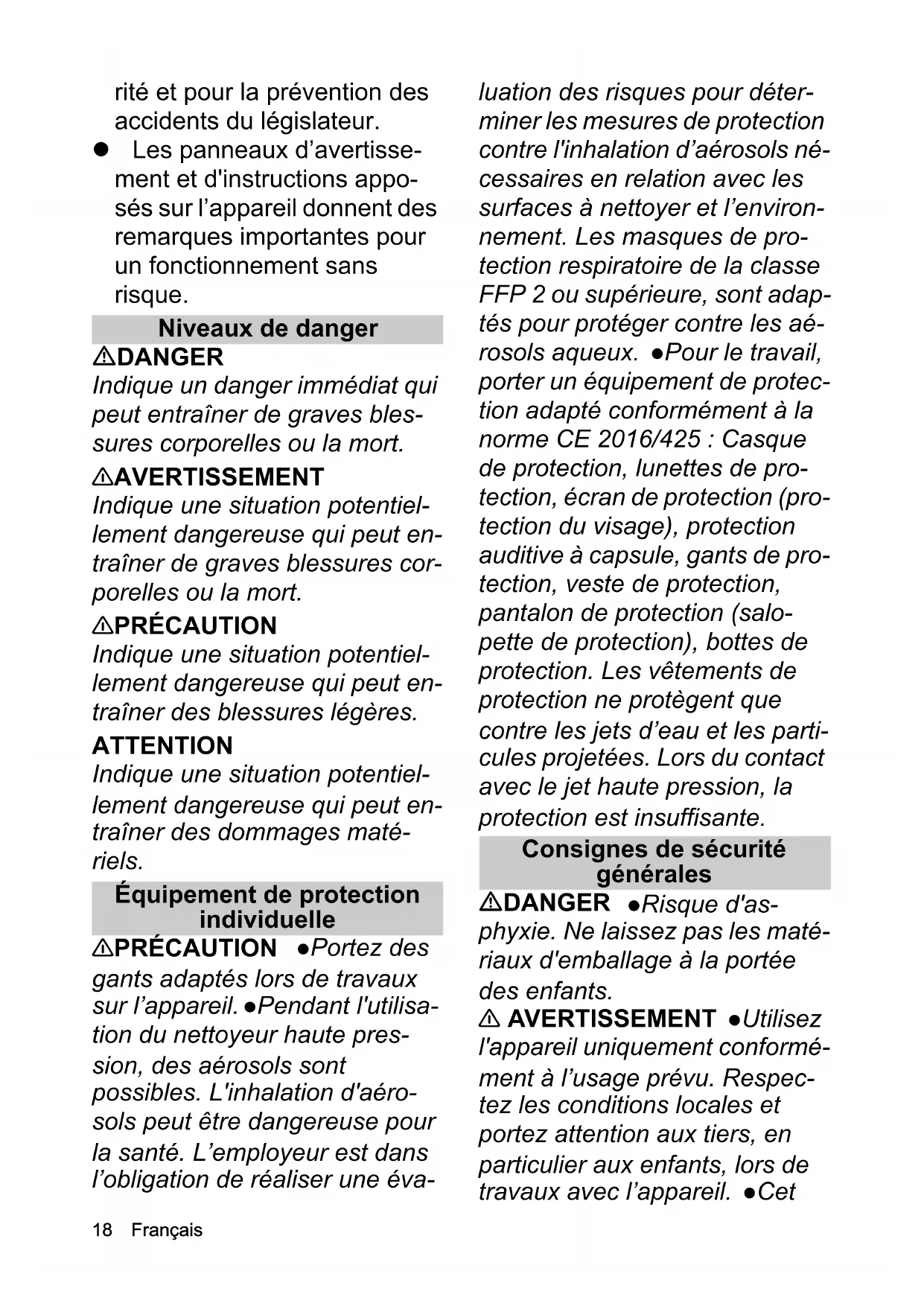 Use ropes, chains, tensioning devices and slinging gear equipped with retainers, con- forming to the applicable regula- tions. Consignes de sécurité Nettoyeur ultra-haute pression Veuillez lire ces consignes de sécurité et le manuel d'instructions origi- nal avant la première utilisation de l'appareil. Agissez en consé- quence. Conservez ces deux documents pour une utilisation ultérieure ou pour le propriétaire suivant. Outre les remarques dans ce manuel d'instructions, vous devez prendre en compte les directives générales de sécu-18 Français rité et pour la prévention des accidents du législateur. Les panneaux d’avertisse- ment et d'instructions appo- sés sur l’appareil donnent des remarques importantes pour un fonctionnement sans risque. Niveaux de danger DANGER Indique un danger immédiat qui peut entraîner de graves bles- sures corporelles ou la mort. 몇 AVERTISSEMENT Indique une situation potentiel- lement dangereuse qui peut en- traîner de graves blessures cor- porelles ou la mort. 몇 PRÉCAUTION Indique une situation potentiel- lement dangereuse qui peut en- traîner des blessures légères. ATTENTION Indique une situation potentiel- lement dangereuse qui peut en- traîner des dommages maté- riels. Équipement de protection individuelle 몇 PRÉCAUTION Portez des gants adaptés lors de travaux sur l’appareil. Pendant l'utilisa- tion du nettoyeur haute pres- sion, des aérosols sont possibles. L'inhalation d'aéro- sols peut être dangereuse pour la santé. L’employeur est dans l’obligation de réaliser une éva- luation des risques pour déter- miner les mesures de protection contre l'inhalation d’aérosols né- cessaires en relation avec les surfaces à nettoyer et l’environ- nement. Les masques de pro- tection respiratoire de la classe FFP 2 ou supérieure, sont adap- tés pour protéger contre les aé- rosols aqueux. Pour le travail, porter un équipement de protec- tion adapté conformément à la norme CE 2016/425 : Casque de protection, lunettes de pro- tection, écran de protection (pro- tection du visage), protection auditive à capsule, gants de pro- tection, veste de protection, pantalon de protection (salo- pette de protection), bottes de protection. Les vêtements de protection ne protègent que contre les jets d’eau et les parti- cules projetées. Lors du contact avec le jet haute pression, la protection est insuffisante. Consignes de sécurité générales DANGER Risque d'as- phyxie. Ne laissez pas les maté- riaux d'emballage à la portée des enfants. 몇 AVERTISSEMENT Utilisez l'appareil uniquement conformé- ment à l’usage prévu. Respec- tez les conditions locales et portez attention aux tiers, en particulier aux enfants, lors de travaux avec l’appareil. CetFrançais 19 appareil ne doit pas être utilisé par des personnes dont les ca- pacités physiques, sensorielles ou mentales sont réduites ou qui ne disposent pas de l’expé- rience et/ou des connaissances nécessaires. Seules les per- sonnes instruites dans la mani- pulation de l’appareil ou ayant prouvé leurs compétences pour la commande et étant expressé- ment en charge de son utilisa- tion sont habilitées à utiliser l’appareil. Surveillez les en- fants pour s'assurer qu'ils ne jouent pas avec l'appareil. Les enfants et les adolescents ne sont pas autorisés à utiliser l’ap- pareil. 몇 PRÉCAUTION Les disposi- tifs de sécurité servent à assurer votre sécurité. Ne modifiez ou ne dérivez jamais les dispositifs de sécurité. Risque d'électrocution DANGER Ne raccordez des appareils de la classe de protection I qu'à des sources de courant mises à la terre correc- tement. Les indication de la tension sur la plaque signalé- tique doivent correspondre à la tension de la source de courant. l Observez la protection mini- male de la prise de courant, voir chapitre Caractéristiques tech- niques dans le manuel d'utilisa- tion. N'utilisez l’appareil qu'avec un disjoncteur à courant de défaut (max. 30 mA). Re- lier l'appareil au secteur à l'aide d'une fiche. Toute liaison non isolante avec le secteur est in- terdite. La fiche sert à la coupure du secteur. Ne touchez jamais aux fiches secteur et prises de courant avec les mains mouil- lées. La prise murale et le couplage d'une rallonge élec- trique doivent être étanches à l'eau et ne doivent pas se trou- ver dans l'eau. Le couplage ne doit pas se trouver sur le sol. Uti- lisez des tambours de câbles garantissant que les prises se trouvent au moins à 60 mm au- dessus du sol. Toutes les pièces conductrices de courant dans la zone de travail doivent être protégées contre le jet d'eau. Utiliser exclusivement un câble de rallonge avec une protection contre les projections d'eau de la section minimale in- diquée dans le manuel d'utilisa- tion. Éviter que la liaison soit posée dans l’eau. Ne pas net- toyer l'appareil avec un flexible ou jet d’eau sous forte ou basse pression. 몇 AVERTISSEMENT Ne branchez l'appareil qu'à un rac- cord électrique ayant été réalisé par un électricien spécialisé se- lon IEC 60364-1. Avant chaque utilisation, vérifiez que le câble d'alimentation avec prise20 Français murale n'est pas endommagé. N'utilisez pas un appareil dont le câble d'alimentation est endom- magé. Faites immédiatement remplacer un câble d'alimenta- tion endommagé par le SAV au- torisé / un électricien spécialisé. l Veillez à ne pas endommager ou abîmer le câble d'alimenta- tion et la conduite de rallonge en passant dessus, en les écra- sant, les déformant, etc. Proté- gez le câble d'alimentation contre la chaleur, l'huile et les arêtes tranchantes. Utilisez ex- clusivement le câble d'alimenta- tion électrique prescrit par le fabricant, ceci vaut également en cas de remplacement du câble. N° de commande et type, voir le Manuel d'utilisation. Des conduites de rallonge élec- triques inappropriées peuvent être dangereuses. Utilisez, en extérieur, uniqu