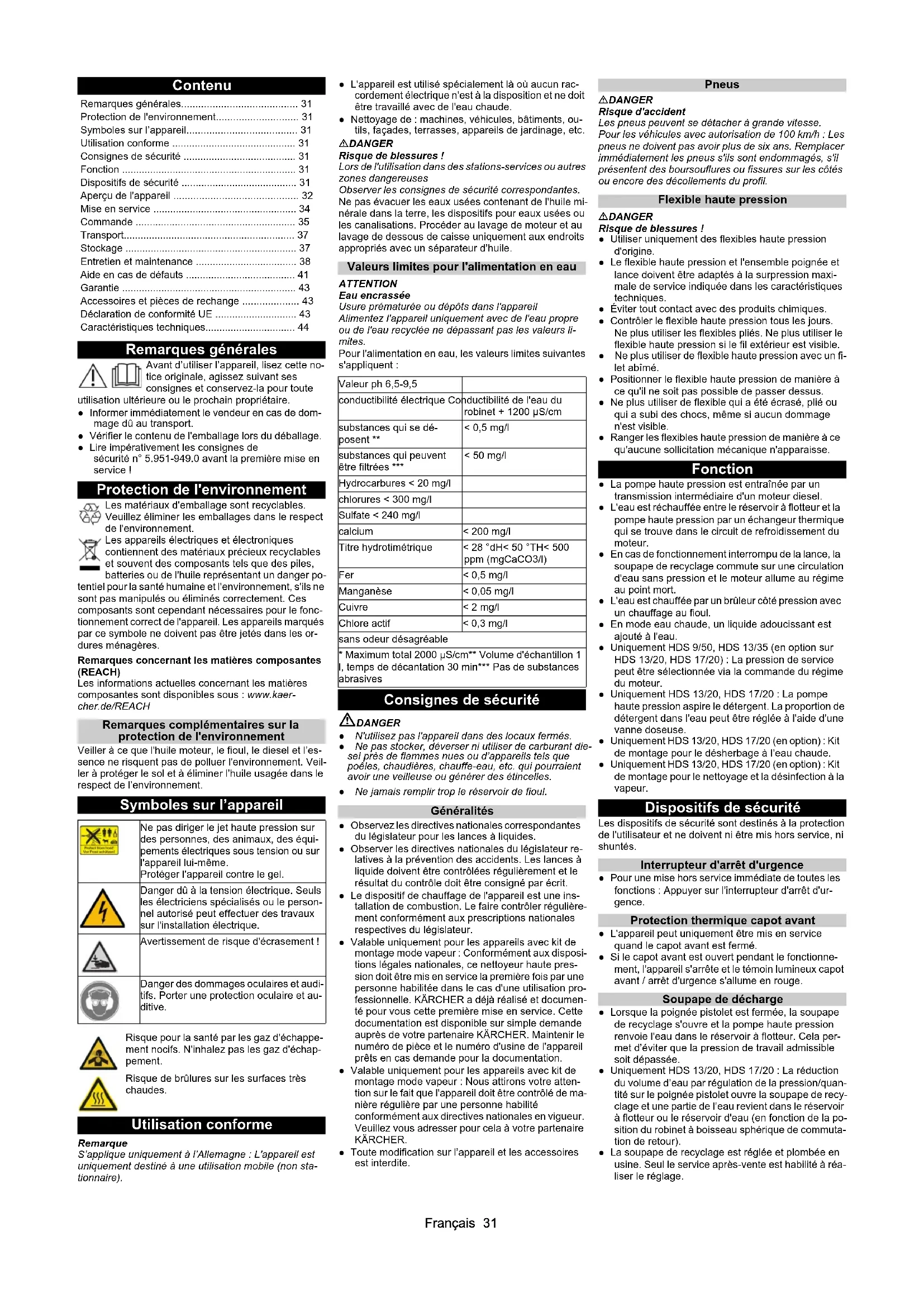 • 2,1 2,1 0,85 0,8Français 31 Contenu Remarques générales Avant d’utiliser l’appareil, lisez cette no- tice originale, agissez suivant ses consignes et conservez-la pour toute utilisation ultérieure ou le prochain propriétaire. ● Informer immédiatement le vendeur en cas de dom- mage dû au transport. ● Vérifier le contenu de l'emballage lors du déballage. ● Lire impérativement les consignes de sécurité n° 5.951-949.0 avant la première mise en service ! Protection de l'environnement Les matériaux d'emballage sont recyclables. Veuillez éliminer les emballages dans le respect de l'environnement. Les appareils électriques et électroniques contiennent des matériaux précieux recyclables et souvent des composants tels que des piles, batteries ou de l'huile représentant un danger po- tentiel pour la santé humaine et l'environnement, s'ils ne sont pas manipulés ou éliminés correctement. Ces composants sont cependant nécessaires pour le fonc- tionnement correct de l'appareil. Les appareils marqués par ce symbole ne doivent pas être jetés dans les or- dures ménagères. Remarques concernant les matières composantes (REACH) Les informations actuelles concernant les matières composantes sont disponibles sous : www.kaer- cher.de/REACH Remarques complémentaires sur la protection de l'environnement Veiller à ce que l'huile moteur, le fioul, le diesel et l’es- sence ne risquent pas de polluer l'environnement. Veil- ler à protéger le sol et à éliminer l’huile usagée dans le respect de l’environnement. Symboles sur l’appareil Utilisation conforme Remarque S’applique uniquement à l’Allemagne : L'appareil est uniquement destiné à une utilisation mobile (non sta- tionnaire). ● L'appareil est utilisé spécialement là où aucun rac- cordement électrique n'est à la disposition et ne doit être travaillé avec de l'eau chaude. ● Nettoyage de : machines, véhicules, bâtiments, ou- tils, façades, terrasses, appareils de jardinage, etc. DANGER Risque de blessures ! Lors de l'utilisation dans des stations-services ou autres zones dangereuses Observer les consignes de sécurité correspondantes. Ne pas évacuer les eaux usées contenant de l'huile mi- nérale dans la terre, les dispositifs pour eaux usées ou les canalisations. Procéder au lavage de moteur et au lavage de dessous de caisse uniquement aux endroits appropriés avec un séparateur d’huile. Valeurs limites pour l'alimentation en eau ATTENTION Eau encrassée Usure prématurée ou dépôts dans l'appareil Alimentez l'appareil uniquement avec de l'eau propre ou de l'eau recyclée ne dépassant pas les valeurs li- mites. Pour l'alimentation en eau, les valeurs limites suivantes s'appliquent : Consignes de sécurité DANGER ● N'utilisez pas l'appareil dans des locaux fermés. ● Ne pas stocker, déverser ni utiliser de carburant die- sel près de flammes nues ou d’appareils tels que poêles, chaudières, chauffe-eau, etc. qui pourraient avoir une veilleuse ou générer des étincelles. ● Ne jamais remplir trop le réservoir de fioul. Généralités ● Observez les directives nationales correspondantes du législateur pour les lances à liquides. ● Observer les directives nationales du législateur re- latives à la prévention des accidents. Les lances à liquide doivent être contrôlées régulièrement et le résultat du contrôle doit être consigné par écrit. ● Le dispositif de chauffage de l'appareil est une ins- tallation de combustion. Le faire contrôler régulière- ment conformément aux prescriptions nationales respectives du législateur. ● Valable uniquement pour les appareils avec kit de montage mode vapeur : Conformément aux disposi- tions légales nationales, ce nettoyeur haute pres- sion doit être mis en service la première fois par une personne habilitée dans le cas d'une utilisation pro- fessionnelle. KÄRCHER a déjà réalisé et documen- té pour vous cette première mise en service. Cette documentation est disponible sur simple demande auprès de votre partenaire KÄRCHER. Maintenir le numéro de pièce et le numéro d'usine de l'appareil prêts en cas demande pour la documentation. ● Valable uniquement pour les appareils avec kit de montage mode vapeur : Nous attirons votre atten- tion sur le fait que l'appareil doit être contrôlé de ma- nière régulière par une personne habilité conformément aux directives nationales en vigueur. Veuillez vous adresser pour cela à votre partenaire KÄRCHER. ● Toute modification sur l’appareil et les accessoires est interdite. Pneus DANGER Risque d'accident Les pneus peuvent se détacher à grande vitesse. Pour les véhicules avec autorisation de 100 km/h : Les pneus ne doivent pas avoir plus de six ans. Remplacer immédiatement les pneus s'ils sont endommagés, s'il présentent des boursouflures ou fissures sur les côtés ou encore des décollements du profil. Flexible haute pression DANGER Risque de blessures ! ● Utiliser uniquement des flexibles haute pression d'origine. ● Le flexible haute pression et l'ensemble poignée et lance doivent être adaptés à la surpression maxi- male de service indiquée dans les caractéristiques techniques. ● Éviter tout contact avec des produits chimiques. ● Contrôler le flexible haute pression tous les jours. Ne plus utiliser les flexibles pliés. Ne plus utiliser le flexible haute pression si le fil extérieur est visible. ● Ne plus utiliser de flexible haute pression avec un fi- let abîmé. ● Positionner le flexible haute pression de manière à ce qu'il ne soit pas possible de passer dessus. ● Ne plus utiliser de flexible qui a été écrasé, plié ou qui a subi des chocs, même si aucun dommage n'est visible. ● Ranger les flexibles haute pression de manière à ce qu'aucune sollicitation mécanique n'apparaisse. Fonction ● La pompe haute pression est entraînée par un transmission intermédiaire d'un moteur diesel. ● L'eau est