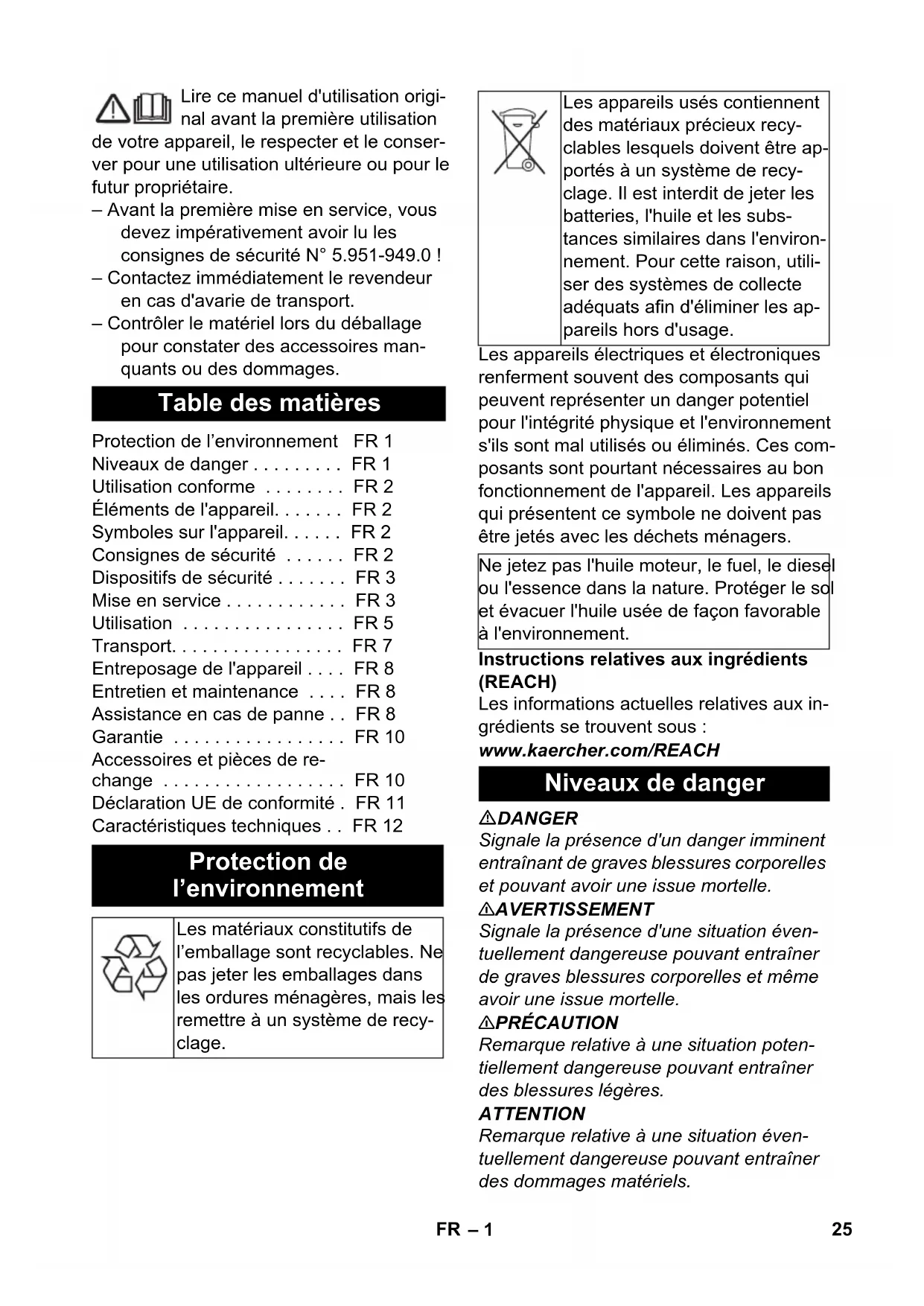 Protection de l'environnement FR 1 Niveau de danger. FR 1 Utilisation conforme FR 2 Éléments de l'appareil. FR 2 Symboles sur I'appareil. FR 2 Consignes de sécurité FR 2 Dispositifs de sécurité. FR 3 Mise en service FR 3 Utilisation FR5 Transport. FR 7 Entreposage de l'appareil... FR 8 Entretien et maintenance... FR 8 Assistance en cas de panne.. FR 8 Garantie FR 10 Accessoires et pieces de rechange FR 10 Déclaration UE de conformité. FR 11 Caracteristiques techniques.. FR 12