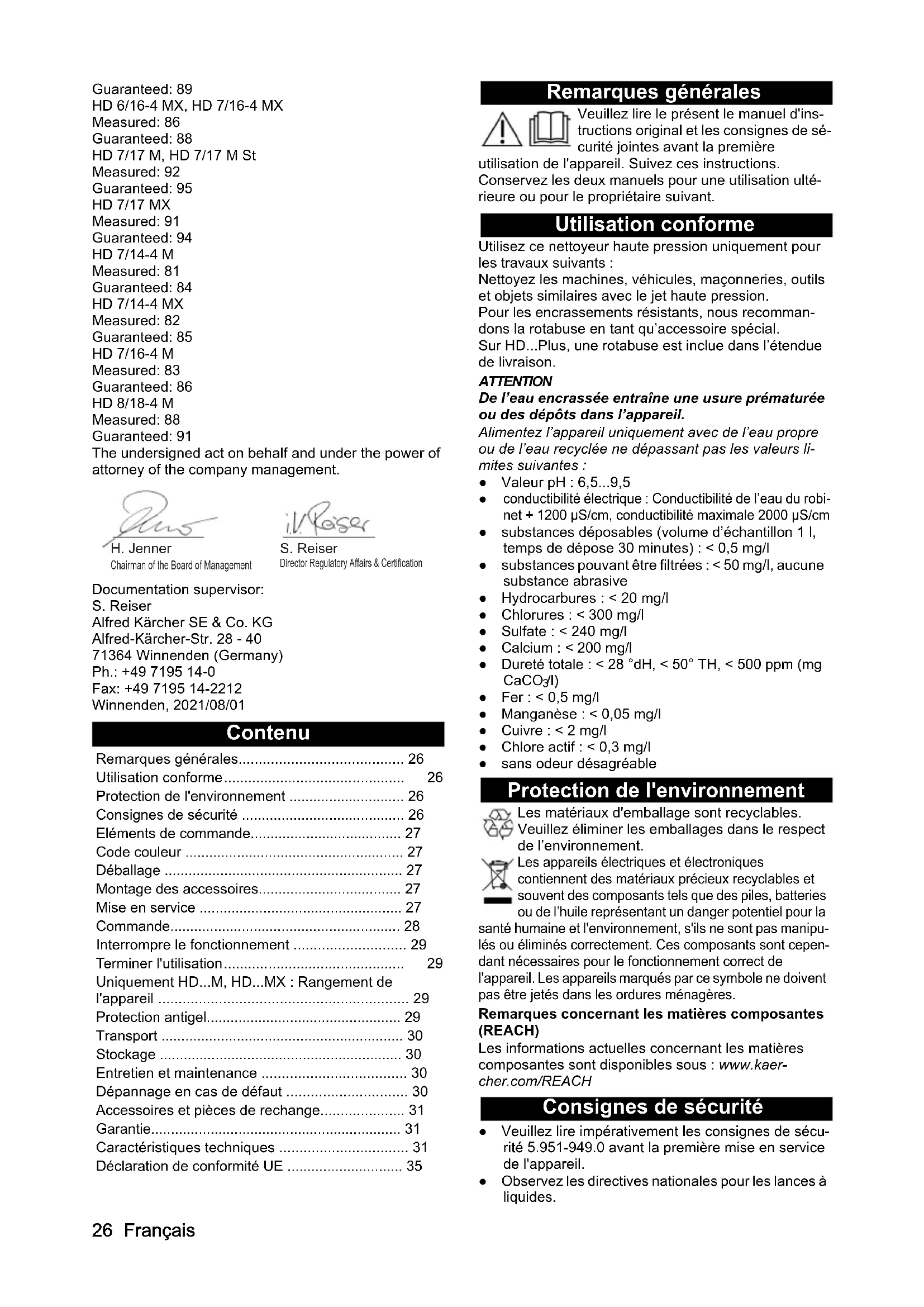 - /l) ● Fer : < 0,5 mg/l ● Manganèse : < 0,05 mg/l ● Cuivre : < 2 mg/l ● Chlore actif : < 0,3 mg/l ● sans odeur désagréable Protection de l'environnement Les matériaux d'emballage sont recyclables. Veuillez éliminer les emballages dans le respect de l’environnement. Les appareils électriques et électroniques contiennent des matériaux précieux recyclables et souvent des composants tels que des piles, batteries ou de l’huile représentant un danger potentiel pour la santé humaine et l'environnement, s'ils ne sont pas manipu- lés ou éliminés correctement. Ces composants sont cepen- dant nécessaires pour le fonctionnement correct de l'appareil. Les appareils marqués par ce symbole ne doivent pas être jetés dans les ordures ménagères. Remarques concernant les matières composantes (REACH) Les informations actuelles concernant les matières composantes sont disponibles sous : www.kaer- cher.com/REACH Consignes de sécurité ● Veuillez lire impérativement les consignes de sécu- rité 5.951-949.0 avant la première mise en service de l'appareil. ● Observez les directives nationales pour les lances à liquides. Remarques générales p. 26
