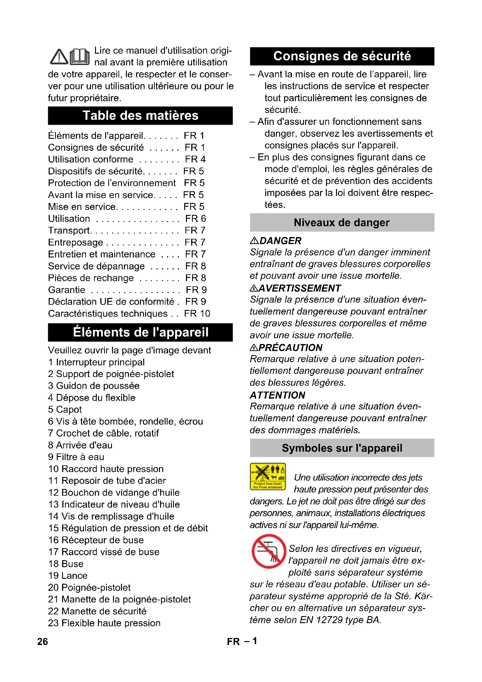 • dB(A) 95 93 Fuel Amount of oil l 0,4 Oil grade -- 15W40 Dimensions and weights Length mm 700 Width mm 455 Height mm 1010 Weight kg 55,4 60,9 Exception according to Regulation (EU) 2019/1781 Annex I Section 2 (12): j) 25EN– 1 Lire ce manuel d'utilisation origi- nal avant la première utilisation de votre appareil, le respecter et le conser- ver pour une utilisation ultérieure ou pour le futur propriétaire. Veuillez ouvrir la page d'image devant 1 Interrupteur principal 2 Support de poignée-pistolet 3 Guidon de poussée 4 Dépose du flexible 5 Capot 6 Vis à tête bombée, rondelle, écrou 7 Crochet de câble, rotatif 8 Arrivée d'eau 9 Filtre à eau 10 Raccord haute pression 11 Reposoir de tube d'acier 12 Bouchon de vidange d'huile 13 Indicateur de niveau d'huile 14 Vis de remplissage d'huile 15 Régulation de pression et de débit 16 Récepteur de buse 17 Raccord vissé de buse 18 Buse 19 Lance 20 Poignée-pistolet 21 Manette de la poignée-pistolet 22 Manette de sécurité 23 Flexible haute pression – Avant la mise en route de l’appareil, lire les instructions de service et respecter tout particulièrement les consignes de sécurité. – Afin d'assurer un fonctionnement sans danger, observez les avertissements et consignes placés sur l'appareil. – En plus des consignes figurant dans ce mode d'emploi, les règles générales de sécurité et de prévention des accidents imposées par la loi doivent être respec- tées. DANGER Signale la présence d'un danger imminent entraînant de graves blessures corporelles et pouvant avoir une issue mortelle. 몇 AVERTISSEMENT Signale la présence d'une situation éven- tuellement dangereuse pouvant entraîner de graves blessures corporelles et même avoir une issue mortelle. 몇 PRÉCAUTION Remarque relative à une situation poten- tiellement dangereuse pouvant entraîner des blessures légères. ATTENTION Remarque relative à une situation éven- tuellement dangereuse pouvant entraîner des dommages matériels. Une utilisation incorrecte des jets haute pression peut présenter des dangers. Le jet ne doit pas être dirigé sur des personnes, animaux, installations électriques actives ni sur l'appareil lui-même. Selon les directives en vigueur, l'appareil ne doit jamais être ex- ploité sans séparateur système sur le réseau d'eau potable. Utiliser un sé- parateur système approprié de la Sté. Kär- cher ou en alternative un séparateur sys- tème selon EN 12729 type BA. Table des matières Éléments de l'appareil FR 1 Consignes de sécurité FR 1 Utilisation conforme FR 4 Dispositifs de sécurité FR 5 Protection de l’environnement FR 5 Avant la mise en service FR 5 Mise en service FR 5 Utilisation FR 6 Transport FR 7 Entreposage FR 7 Entretien et maintenance FR 7 Service de dépannage FR 8 Pièces de rechange FR 8 Garantie FR 9 Déclaration UE de conformité . FR 9 Caractéristiques techniques