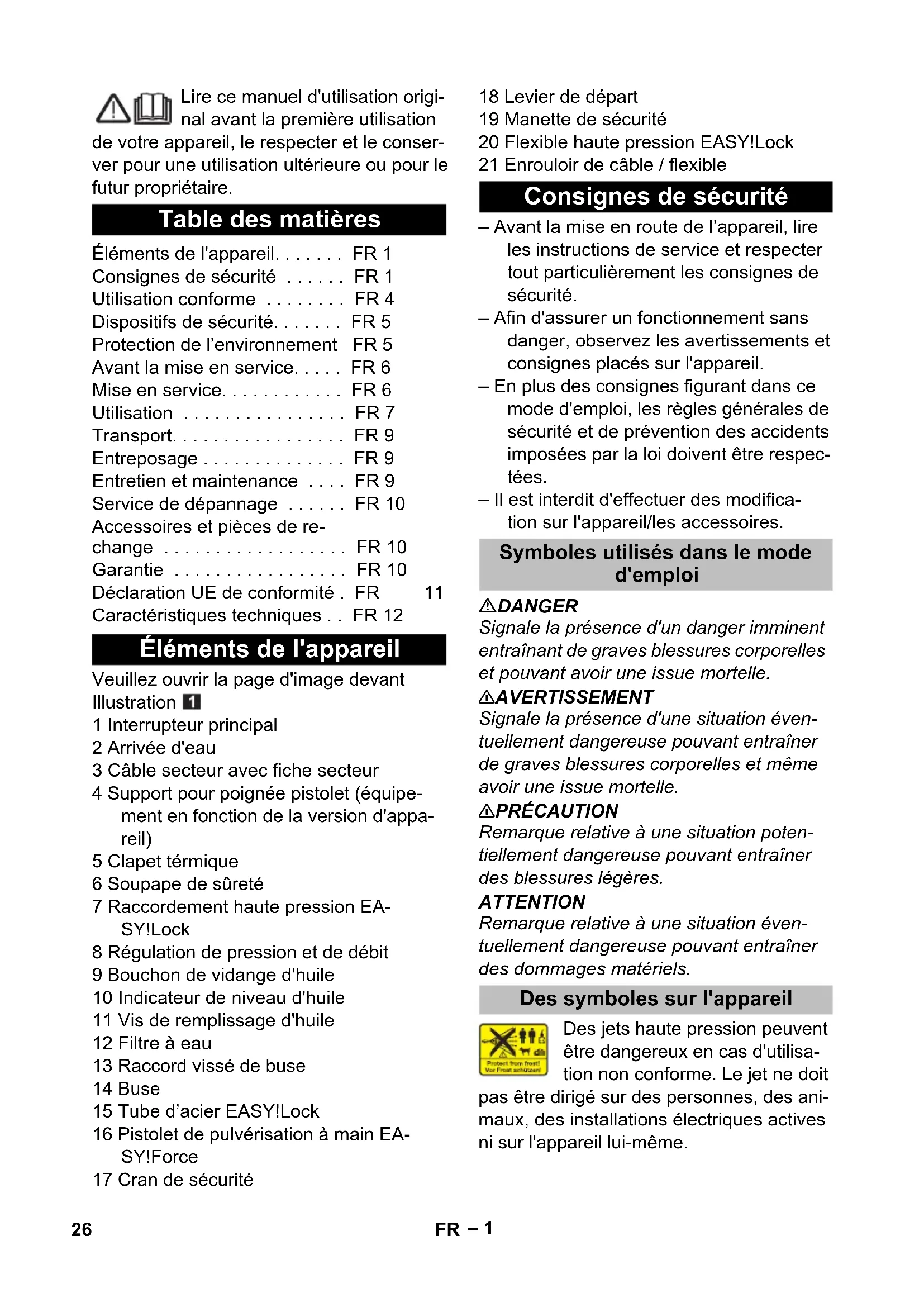dB(A) 90 Fuel Amount of oil l 0.4 Oil grade -- 15W40 Dimensions and weights Length mm 780 Width mm 360 Height mm 500 Weight, ready to operate with accessories kg 56.5 25EN– 1 Lire ce manuel d'utilisation origi- nal avant la première utilisation de votre appareil, le respecter et le conser- ver pour une utilisation ultérieure ou pour le futur propriétaire. Veuillez ouvrir la page d'image devant Illustration 1 Interrupteur principal 2 Arrivée d'eau 3 Câble secteur avec fiche secteur 4 Support pour poignée pistolet (équipe- ment en fonction de la version d'appa- reil) 5 Clapet térmique 6 Soupape de sûreté 7 Raccordement haute pression EA- SY!Lock 8 Régulation de pression et de débit 9 Bouchon de vidange d'huile 10 Indicateur de niveau d'huile 11 Vis de remplissage d'huile 12 Filtre à eau 13 Raccord vissé de buse 14 Buse 15 Tube d’acier EASY!Lock 16 Pistolet de pulvérisation à main EA- SY!Force 17 Cran de sécurité 18 Levier de départ 19 Manette de sécurité 20 Flexible haute pression EASY!Lock 21 Enrouloir de câble / flexible – Avant la mise en route de l’appareil, lire les instructions de service et respecter tout particulièrement les consignes de sécurité. – Afin d'assurer un fonctionnement sans danger, observez les avertissements et consignes placés sur l'appareil. – En plus des consignes figurant dans ce mode d'emploi, les règles générales de sécurité et de prévention des accidents imposées par la loi doivent être respec- tées. – Il est interdit d'effectuer des modifica- tion sur l'appareil/les accessoires. DANGER Signale la présence d'un danger imminent entraînant de graves blessures corporelles et pouvant avoir une issue mortelle. 몇 AVERTISSEMENT Signale la présence d'une situation éven- tuellement dangereuse pouvant entraîner de graves blessures corporelles et même avoir une issue mortelle. 몇 PRÉCAUTION Remarque relative à une situation poten- tiellement dangereuse pouvant entraîner des blessures légères. ATTENTION Remarque relative à une situation éven- tuellement dangereuse pouvant entraîner des dommages matériels. Des jets haute pression peuvent être dangereux en cas d'utilisa- tion non conforme. Le jet ne doit pas être dirigé sur des personnes, des ani- maux, des installations électriques actives ni sur l'appareil lui-même. Table des matières Éléments de l'appareil... FR 1 Consignes de sécurité ... FR 1 Utilisation conforme ... FR 4 Dispositifs de sécurité... FR 5 Protection de l’environnement FR 5 Avant la mise en service... FR 6 Mise en service... FR 6 Utilisation ... FR 7 Transport... FR 9 Entreposage ... FR 9 Entretien et maintenance ... FR 9 Service de dépannage ... FR 10 Accessoires et pièces de re- change ... FR 10 Garantie ... FR 10 Déclaration UE de conformité . FR 11 Caractéristiques techniques ... FR 12 Éléments de l'appareil Consignes de sécurité Symboles utilisés dans le mode d'emploi Des symboles sur l'appareil 26 FR– 2 Selon les directives en vigueur, l'appareil ne doit jamais être ex- ploité sans séparateur de sys- tème sur le réseau d'eau potable. Utiliser un séparateur système approprié de la société Kärcher ou en alternative un séparateur système selon EN 12729 type BA. L'eau qui s'est écoulée à travers un sépara- teur système est classifiée comme non po- table. L'appareil contient des surfaces très chaudes pouvant provoquer des brûlures. Risque d'électrocution. Le boîtier ne doit être ouvert que par des électriciens spécialisés. – La tension indiquée sur la plaque signa- létique de l'appareil doit correspondre à celle de la prise. – Protection minimale par fusible de la prise de courant (voir les données tech- niques) – Classe de protection I - Brancher les appareils uniquement aux sources d'électricité dûment mises à la terre. – Il est recommandé de brancher cet ap- pareil seulement à une prise de courant qui est assurée avec un commutateur de protection de courant d'erreur de 30 mA. – Utiliser la ligne d'accès au réseau pres- crite par le fabricant, cela est aussi va- lable en cas du remplacement de la ligne. N° de commande et type, voir le mode d'emploi. – Vérifier avant chaque utilisation que le câble et la fiche mâle ne sont pas défec- tueux. Un câble d’alimentation endom- magé doit immédiatement être rempla- cé par le service après-vente ou un électricien agréé. – L’appareil doit uniquement être raccor- dé à un branchement électrique mis en service par un électricien conformé- ment à la norme IEC 60364-1. – Les procédures de mises en marche peut conduire à des baisses de tension de courte durée. – Si le circuit électrique n'est pas appro- prié, d'autres appareils peuvent subir des endommagements. – Ne jamais saisir le câble d’alimentation avec des mains mouillées. – Veiller à ne pas abîmer ni endommager le câble d’alimentation ni le câble de ral- longe en roulant dessus, en les coin- çant ni en tirant violemment dessus. Protéger le câble d’alimentation contre la chaleur, l’huile et les arêtes tran- chantes. – Le câble de prolongation doit avoir la coupe transversale mentionnée dans le mode d'emploi et être protégé contre l'eau. La liaison ne doit jamais se trou- ver dans l’eau. – La fiche secteur et le couplage d'une conduite de rallonge doivent être étanches et ne doivent pas reposer dans l'eau. Le raccord ne doit pas se si- tuer sur le sol. Il est recommandé d'uti- liser des enrouleurs de câble qui garan- tissent le fait que les prises se trouvent à au moins 60 mm au-dessus du sol. – Des rallonges électriques non adaptées peuvent présenter des risques. Utiliser à l’air libre uniquement des câbles de rallonge électriques autorisés et mar- qués de façon adéquate avec une sec- tion suffisante du conducteur. – Contrôler régulièrement que le câble d'alimentation secteur n'est pas endom- magé, par exemple par formation de f