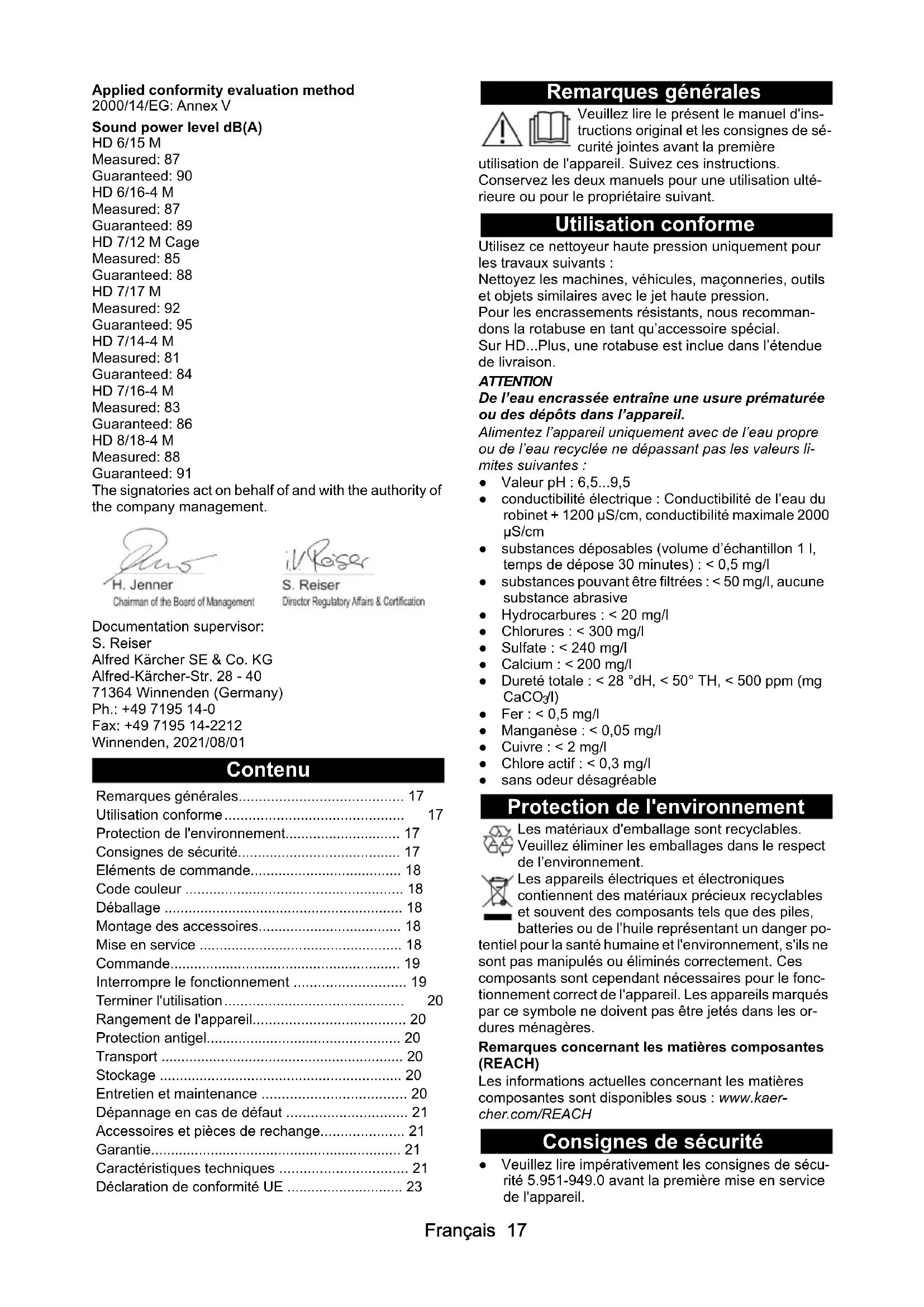 dB(A)84869592Français 17 Applied conformity evaluation method 2000/14/EG: Annex V Sound power level dB(A) HD 6/15 M Measured: 87 Guaranteed: 90 HD 6/16-4 M Measured: 87 Guaranteed: 89 HD 7/12 M Cage Measured: 85 Guaranteed: 88 HD 7/17 M Measured: 92 Guaranteed: 95 HD 7/14-4 M Measured: 81 Guaranteed: 84 HD 7/16-4 M Measured: 83 Guaranteed: 86 HD 8/18-4 M Measured: 88 Guaranteed: 91 The signatories act on behalf of and with the authority of the company management. Documentation supervisor: S. Reiser Alfred Kärcher SE & Co. KG Alfred-Kärcher-Str. 28 - 40 71364 Winnenden (Germany) Ph.: +49 7195 14-0 Fax: +49 7195 14-2212 Winnenden, 2021/08/01 Contenu Remarques générales Veuillez lire le présent le manuel d'ins- tructions original et les consignes de sé- curité jointes avant la première utilisation de l'appareil. Suivez ces instructions. Conservez les deux manuels pour une utilisation ulté- rieure ou pour le propriétaire suivant. Utilisation conforme Utilisez ce nettoyeur haute pression uniquement pour les travaux suivants : Nettoyez les machines, véhicules, maçonneries, outils et objets similaires avec le jet haute pression. Pour les encrassements résistants, nous recomman- dons la rotabuse en tant qu’accessoire spécial. Sur HD...Plus, une rotabuse est inclue dans l’étendue de livraison. ATTENTION De l’eau encrassée entraîne une usure prématurée ou des dépôts dans l’appareil. Alimentez l’appareil uniquement avec de l’eau propre ou de l’eau recyclée ne dépassant pas les valeurs li- mites suivantes : ● Valeur pH : 6,5...9,5 ● conductibilité électrique : Conductibilité de l’eau du robinet + 1200 µS/cm, conductibilité maximale 2000 µS/cm ● substances déposables (volume d’échantillon 1 l, temps de dépose 30 minutes) : < 0,5 mg/l ● substances pouvant être filtrées : < 50 mg/l, aucune substance abrasive ● Hydrocarbures : < 20 mg/l ● Chlorures : < 300 mg/l ● Sulfate : < 240 mg/l ● Calcium : < 200 mg/l ● Dureté totale : < 28 °dH, < 50° TH, < 500 ppm (mg CaCO