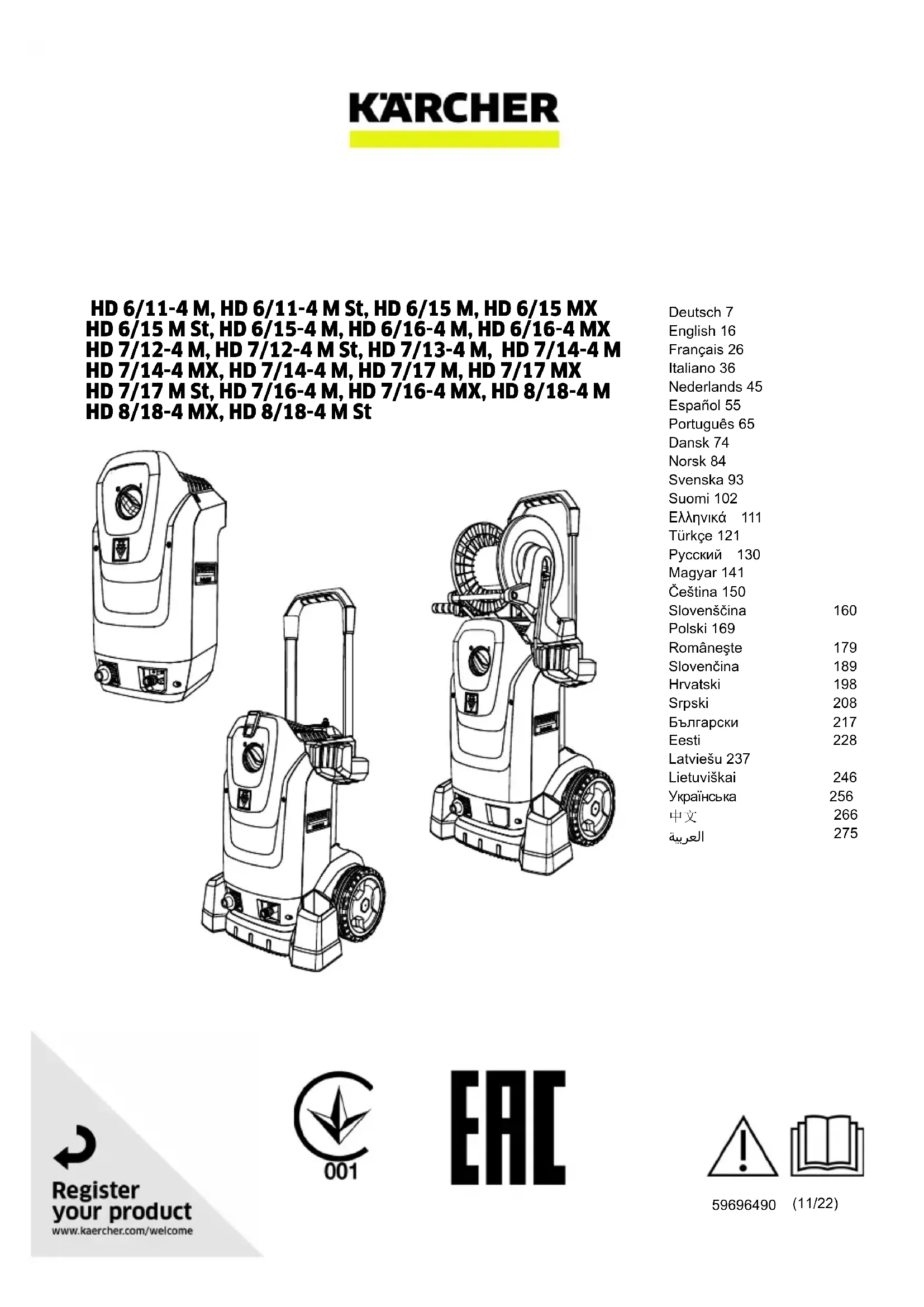 - Câble de rallonge du secteur au transformateur/du transformateur à l'appareil Déclaration de conformité UE Nous déclarons par la présente que la machine dési- gnée ci-après ainsi que la version que nous avons mise en circulation, est conforme, de par sa conception et son type, aux exigences fondamentales de sécurité et de santé en vigueur des normes UE. Toute modification de la machine sans notre accord annule cette déclara- tion. Produit : Nettoyeur haute pression Type : 1.150-xxx Type : 1.151-xxx Type : 1.524-xxx Normes UE en vigueur 2000/14/CE 2006/42/CE (+2009/127/CE) 2011/65/UE 2014/30/UE 2009/125/CE Ordonnance(s) appliquée(s) (UE) 2009/1781 Normes harmonisées appliquées EN 60335-1 EN 60335-2-79 EN IEC 63000: 2018 EN 55014-1: 2017 + A11: 2020 EN 55014-2: 2015 EN 62233: 2008 EN 61000-3-2: 2014 HD 6/15, HD 6/16, HD 7/16, HD 7/17, HD 8/18 EN 61000-3-3: 2013 HD 7/14 EN 61000-3-11: 2000 Méthode d'évaluation de conformité appliquée 2000/14/CE : Annexe V Niveau de puissance acoustique dB(A) HD 6/15 M, HD 6/15 MX Mesuré : 87 Garanti : 90 HD 6/15 M St, HD 8/18-4 M St Mesuré : 90 Garanti : 92 HD 6/16-4 M, HD 8/18-4 MX Mesuré : 87 Garanti : 89 HD 6/16-4 MX, HD 7/16-4 MX Mesuré : 86 Garanti : 88 HD 7/17 M, HD 7/17 M St Mesuré : 92 Garanti : 95 HD 7/17 MX Mesuré : 91 Garanti : 94 HD 7/14-4 M Mesuré : 81 Garanti : 84 HD 7/14-4 MX Mesuré : 82 Garanti : 85 HD 7/16-4 M Mesuré : 83 Garanti : 86 HD 8/18-4 M Mesuré : 88 Garanti : 91 Les signataires agissent sous ordre et avec le pouvoir de la direction. Responsable de la documentation : S. Reiser Alfred Kärcher SE & Co. KG Alfred-Kärcher-Str. 28 - 40 71364 Winnenden (Germany) Tél. : +49 7195 14-0 Télécopie : +49 7195 14-2212 Winnenden, le 01/08/2021 Indice Quantité d’huile l 0,25 0,35 0,35 0,35 0,35 0,35 Type d’huile Type SAE 90 SAE 90 SAE 90 SAE 90 SAE 90 SAE 90 Valeurs déterminées selon EN 60335-2-79 Valeur de vibrations main-bras m/s
