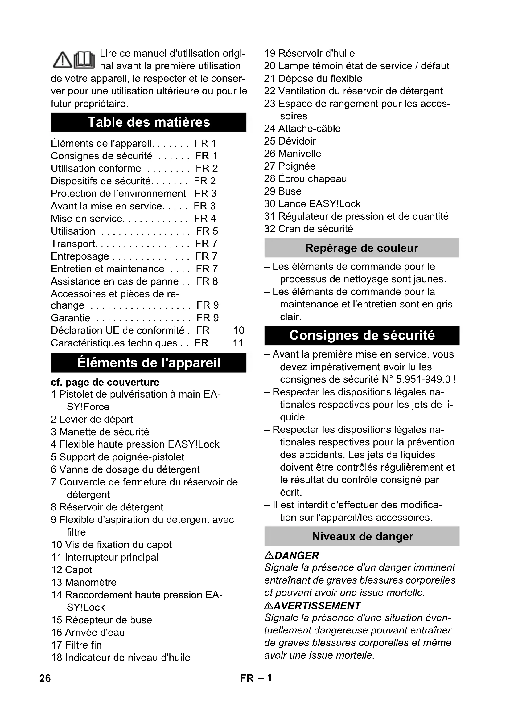 - 1.286-902.0: 75,5 kg; 1.286-903.0: 75,7 kg; 1.286-913.0: 69,1 kg; 1.286-927: 82,5 kg ** 1.286-914.0: 77,5 kg; 1.286-928.0: 86 kg 25EN– 1 Lire ce manuel d'utilisation origi- nal avant la première utilisation de votre appareil, le respecter et le conser- ver pour une utilisation ultérieure ou pour le futur propriétaire. cf. page de couverture 1 Pistolet de pulvérisation à main EA- SY!Force 2 Levier de départ 3 Manette de sécurité 4 Flexible haute pression EASY!Lock 5 Support de poignée-pistolet 6 Vanne de dosage du détergent 7 Couvercle de fermeture du réservoir de détergent 8 Réservoir de détergent 9 Flexible d'aspiration du détergent avec filtre 10 Vis de fixation du capot 11 Interrupteur principal 12 Capot 13 Manomètre 14 Raccordement haute pression EA- SY!Lock 15 Récepteur de buse 16 Arrivée d'eau 17 Filtre fin 18 Indicateur de niveau d'huile 19 Réservoir d'huile 20 Lampe témoin état de service / défaut 21 Dépose du flexible 22 Ventilation du réservoir de détergent 23 Espace de rangement pour les acces- soires 24 Attache-câble 25 Dévidoir 26 Manivelle 27 Poignée 28 Écrou chapeau 29 Buse 30 Lance EASY!Lock 31 Régulateur de pression et de quantité 32 Cran de sécurité – Les éléments de commande pour le processus de nettoyage sont jaunes. – Les éléments de commande pour la maintenance et l'entretien sont en gris clair. – Avant la première mise en service, vous devez impérativement avoir lu les consignes de sécurité N° 5.951-949.0 ! – Respecter les dispositions légales na- tionales respectives pour les jets de li- quide. – Respecter les dispositions légales na- tionales respectives pour la prévention des accidents. Les jets de liquides doivent être contrôlés régulièrement et le résultat du contrôle consigné par écrit. – Il est interdit d'effectuer des modifica- tion sur l'appareil/les accessoires. DANGER Signale la présence d'un danger imminent entraînant de graves blessures corporelles et pouvant avoir une issue mortelle. 몇 AVERTISSEMENT Signale la présence d'une situation éven- tuellement dangereuse pouvant entraîner de graves blessures corporelles et même avoir une issue mortelle. Table des matières Éléments de l'appareil. . . . . . . FR 1 Consignes de sécurité . . . . . . FR 1 Utilisation conforme . . . . . . . . FR 2 Dispositifs de sécurité. . . . . . . FR 2 Protection de l’environnement FR 3 Avant la mise en service. . . . . FR 3 Mise en service. . . . . . . . . . . . FR 4 Utilisation . . . . . . . . . . . . . . . . FR 5 Transport. . . . . . . . . . . . . . . . . FR 7 Entreposage . . . . . . . . . . . . . . FR 7 Entretien et maintenance . . . . FR 7 Assistance en cas de panne . . FR 8 Accessoires et pièces de re- change . . . . . . . . . . . . . . . . . . FR 9 Garantie . . . . . . . . . . . . . . . . . FR 9 Déclaration UE de conformité . FR 10 Caractéristiques techniques . . FR 11 Éléments de l'appareil Repérage de couleur Consignes de sécurité Niveaux de danger 26 FR– 2 몇 PRÉCAUTION Remarque relative à une situation poten- tiellement dangereuse pouvant entraîner des blessures légères. ATTENTION Remarque relative à une situation éven- tuellement dangereuse pouvant entraîner des dommages matériels. Une utilisation incorrecte des jets haute pression peut présen- ter des dangers. Le jet ne doit pas être diri- gé sur des personnes, animaux, installa- tions électriques actives ni sur l'appareil lui- même. Selon les directives en vigueur, l'appareil ne doit jamais être ex- ploité sans séparateur de système sur le réseau d'eau potable. Utili- ser un séparateur de système approprié de la société KÄRCHER ou en alternative un séparateur système selon EN 12729 type BA. L'eau qui s'est écoulée à travers un sépara- teur système est classifiée comme non po- table. 몇 PRÉCAUTION Toujours connecter le séparateur de sys- tème à l'alimentation en eau, et jamais di- rectement à l'appareil. Utiliser exclusivement ce nettoyeur haute pression – pour nettoyer au jet basse pression et avec du détergent (par exemple pour le nettoyage de machines, véhicules, bâti- ments, outils), – pour nettoyer au jet haute pression sans détergent (par ex. nettoyage de façades, de terrasses, d'appareils de jardinage). Pour des salissures tenaces nos recom- mandons le fraiseur de saleté comme ac- cessoire en option. Exigences à la qualité d'eau : ATTENTION Utiliser uniquement de l'eau propre comme fluide haute pression. Des saletés en- traînent une usure prématurée ou des dé- pôts dans l'appareil. Si de l'eau de recyclage est utilisée, les va- leurs limites suivantes ne doivent pas être dépassées. Les dispositifs de sécurité ont pour but de protéger l'utilisateur et ils ne doivent donc jamais être désactivés ni évités. En cas de réduction de la quantité d'eau avec le réglage de pression/quantité, la cla- pet de décharge s'ouvre et une partie de l'eau est évacuée vers le côté aspiration de la pompe. Symboles sur l'appareil Utilisation conforme Valeur de pH 6,5...9,5 conductivité électrique * Conductivité de l'eau du ro- binet +1200 µS/cm substances qui se dé- posent ** < 0,5 mg/l substances qui peuvent être filtrées *** < 50 mg/l Hydrocarbures < 20 mg/l Chlorure < 300 mg/l Sulfate < 240 mg/l calcium < 200 mg/l Dureté globale < 28 °dH < 50 °TH < 500 ppm (mg CaCO
