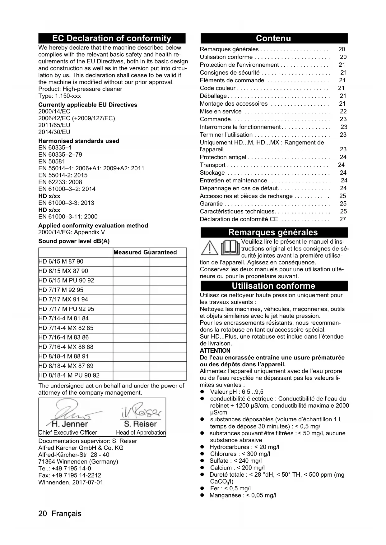 dB(A)85868891899220 Français EC Declaration of conformity We hereby declare that the machine described below complies with the relevant basic safety and health re- quirements of the EU Directives, both in its basic design and construction as well as in the version put into circu- lation by us. This declaration shall cease to be valid if the machine is modified without our prior approval. Product: High-pressure cleaner Type: 1.150-xxx Currently applicable EU Directives 2000/14/EC 2006/42/EC (+2009/127/EC) 2011/65/EU 2014/30/EU Harmonised standards used EN 60335–1 EN 60335–2–79 EN 50581 EN 55014–1: 2006+A1: 2009+A2: 2011 EN 55014-2: 2015 EN 62233: 2008 EN 61000–3–2: 2014 HD x/xx EN 61000–3-3: 2013 HD x/xx EN 61000–3-11: 2000 Applied conformity evaluation method 2000/14/EG: Appendix V Sound power level dB(A) The undersigned act on behalf and under the power of attorney of the company management. Documentation supervisor: S. Reiser Alfred Kärcher GmbH & Co. KG Alfred-Kärcher-Str. 28 - 40 71364 Winnenden (Germany) Tel.: +49 7195 14-0 Fax: +49 7195 14-2212 Winnenden, 2017-07-01 Contenu Remarques générales Veuillez lire le présent le manuel d'ins- tructions original et les consignes de sé- curité jointes avant la première utilisa- tion de l'appareil. Agissez en conséquence. Conservez les deux manuels pour une utilisation ulté- rieure ou pour le propriétaire suivant. Utilisation conforme Utilisez ce nettoyeur haute pression uniquement pour les travaux suivants : Nettoyez les machines, véhicules, maçonneries, outils et objets similaires avec le jet haute pression. Pour les encrassements résistants, nous recomman- dons la rotabuse en tant qu’accessoire spécial. Sur HD...Plus, une rotabuse est inclue dans l’étendue de livraison. ATTENTION De l’eau encrassée entraîne une usure prématurée ou des dépôts dans l’appareil. Alimentez l’appareil uniquement avec de l’eau propre ou de l’eau recyclée ne dépassant pas les valeurs li- mites suivantes : Valeur pH : 6,5...9,5 conductibilité électrique : Conductibilité de l’eau du robinet + 1200 µS/cm, conductibilité maximale 2000 µS/cm substances déposables (volume d’échantillon 1 l, temps de dépose 30 minutes) : < 0,5 mg/l substances pouvant être filtrées : < 50 mg/l, aucune substance abrasive Hydrocarbures : < 20 mg/l Chlorures : < 300 mg/l Sulfate : < 240 mg/l Calcium : < 200 mg/l Dureté totale : < 28 °dH, < 50° TH, < 500 ppm (mg CaCO