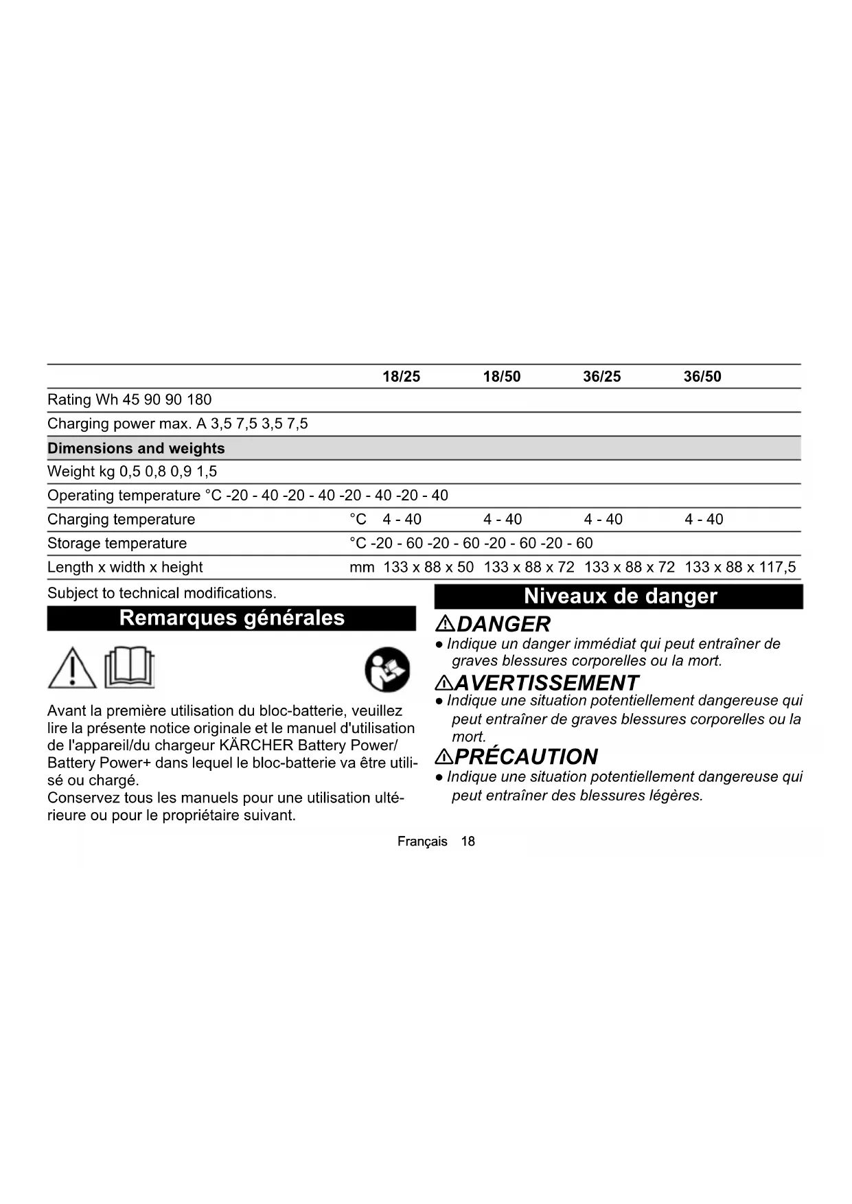 Battery Power Compatible with battery platform Battery Pow- er + Battery Pow- er + Battery Pow- er + Battery Power + Battery pack type Li-ION Li-ION Li-ION Li-ION Rated capacity (according to IEC/EN 61960) Ah 2,5 5,0 2,5 5,0Français 18 Subject to technical modifications. Remarques générales Avant la première utilisation du bloc-batterie, veuillez lire la présente notice originale et le manuel d'utilisation de l'appareil/du chargeur KÄRCHER Battery Power/ Battery Power+ dans lequel le bloc-batterie va être utili- sé ou chargé. Conservez tous les manuels pour une utilisation ulté- rieure ou pour le propriétaire suivant. Niveaux de danger DANGER ● Indique un danger immédiat qui peut entraîner de graves blessures corporelles ou la mort. 몇 AVERTISSEMENT ● Indique une situation potentiellement dangereuse qui peut entraîner de graves blessures corporelles ou la mort. 몇 PRÉCAUTION ● Indique une situation potentiellement dangereuse qui peut entraîner des blessures légères. Rating Wh 45 90 90 180 Charging power max. A 3,5 7,5 3,5 7,5 Dimensions and weights Weight kg 0,5 0,8 0,9 1,5 Operating temperature °C -20 - 40 -20 - 40 -20 - 40 -20 - 40 Charging temperature °C 4 - 40 4 - 40 4 - 40 4 - 40 Storage temperature °C -20 - 60 -20 - 60 -20 - 60 -20 - 60 Length x width x height mm 133 x 88 x 50 133 x 88 x 72 133 x 88 x 72 133 x 88 x 117,5 18/25 18/50 36/25 36/5019 Français ATTENTION ● Indique une situation potentiellement dangereuse qui peut entraîner des dommages matériels. Consignes de sécurité ● Vérifiez l'absence de dommages sur le bloc de bat- terie avant chaque utilisation. N'utilisez pas un bloc de batterie endommagé. ● Sortez le bloc de batterie de l'appareil avant tous les travaux de maintenance et d'entretien. ● Ne soumettez pas le bloc de batterie à des charges mécaniques. ● Ne pas laisser tomber le bloc-batterie. ● Ne pas plonger le bloc-batterie dans l'eau et ne pas le tenir sous un jet d'eau. ● Ne pas utiliser le blocs-batterie lorsqu'il est mouillé ou sale. ● Si le bloc-batterie est mouillé, le sécher immédiate- ment. S’assurer qu'aucune humidité ne reste sur les contacts. ● Ne pas stocker et ne pas charger le bloc-batterie dans un environnement humide ou mouillé. ● Chargez le bloc de batterie exclusivement avec les chargeurs autorisés. ● Ne pas charger le bloc-batterie sans surveillance. Vérifier régulièrement l'état du bloc-batterie et du chargeur pendant le processus de charge. ● Si un défaut, une odeur inhabituelle ou un dévelop- pement de chaleur sont remarqués pendant la charge, débrancher le chargeur du secteur et le bloc-batterie du chargeur. Jeter immédiatement le bloc-batterie et le chargeur et respecter les régle- mentations en vigueur en matière de transport et d'élimination. ● Ne pas utiliser, ne pas charger et ne pas stocker le bloc-batterie dans un environnement explosif ou à proximité d'objets inflammables. ● Ne pas jeter de blocs-batterie dans le feu. ● Protégez le bloc-batterie contre la chaleur, les bords vifs, l'huile, les solvants, les détergents et les pièces mobiles de l'appareil. ● Risque de court-circuit. Protéger les contacts du bloc-batterie des pièces métalliques et ne pas le stocker avec des pièces métalliques. ● N'ouvrez pas le bloc de batterie. Faites exécuter les réparations uniquement par du personnel qualifié. ● Evitez le contact avec le liquide s'échappant des batteries défectueuses. En cas de contact, rincez immédiatement le liquide avec de l'eau et consultez un médecin en cas de contact avec les yeux.Français 20 ● Éliminer le bloc-batterie à la fin de sa durée de vie conformément aux réglementations applicables. Consignes de sécurité pour le transport La batterie lithium-ion est soumise aux exigences du droit sur les marchandises dangereuses. Un bloc-batterie non endommagé et opérationnel peut être transporté par l'utilisateur, sans autres exigences, dans un espace de circulation public. En cas d’expédition par des tiers (entreprises de trans- port), observez les exigences particulières sur l’embal- lage ainsi que la désignation. Utilisez le bloc de batterie uniquement si son boîtier est intact. Collez les contacts apparents. Emballez solidement le bloc de batterie. Le bloc de bat- terie ne doit pas pouvoir bouger dans l'emballage. DANGER ● Un bloc-batterie défectueux ou non fonctionnel ne doit pas être expédié et doit être éliminé sur place confor- mément à la réglementation en vigueur. Observez les directives nationales. Utilisation conforme 몇 PRÉCAUTION Risque d'explosion ! Risque de blessures et de dommages matériels en cas d'explosion du bloc-batterie. Charger, utiliser et stocker uniquement des blocs-batte- ries non endommagés et entièrement fonctionnels. Les changements et les modifications non autorisées par le fabricant sont interdits. Toute autre utilisation est interdite. L'utilisateur est seul responsable des risques découlant d'une utilisation non autorisée. Charger et utiliser les blocs-batteries uniquement avec les appareils du système KÄRCHER 18 V/36 V Battery Power/Battery Power+. ATTENTION Les batteries ne peuvent être utilisées qu'avec des ap- pareils du même type de tension (18 V ou 36 V) ! Ne pas utiliser et ne pas charger des blocs-batteries avec des appareils dont le type de tension est différent. Avant utilisation, vérifier que le type de tension (18 V/36