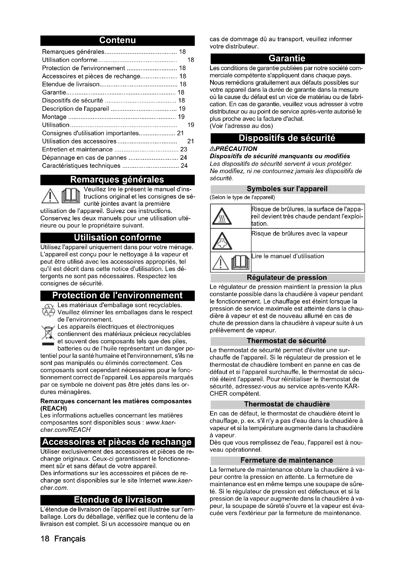 - it locks into place. The steam lever cannot be pressed The steam lever is locked with the child lock. Set the child lock (selector switch for steam volume) to the front. The steam lever is released. Long heating-up time The steam boiler is scaled. Descale the steam boiler. High water output The steam boiler is scaled. Descale the steam boiler. The steam pressure iron “spits” water Rinse or descale the steam boiler of the steam cleaner; see Chapter Descaling the steam boiler After ironing breaks, water droplets come out of the steam pressure iron During longer ironing breaks, steam can condense in the steam line. After pauses in the ironing process, direct the blast of steam onto a cloth until the steam flows evenly. Technical data Subject to technical modifications. Electrical connection Voltag e V 220-240 Phase ~ 1 Frequency Hz 50-60 Degree of protection IPX4 Protection class I Device performance data Heating capacity W 2000 Heating capacity of iron W 700 Maximum operating pressure MPa 0.35 Heating-up time Minutes 4 Continuous steaming g/min 50 Maximum steam blast g/min 110 Filling quantity Water reservoir l 0.8 Steam boiler l 0.5 Dimensions and weights Weight without accessories kg 4 Length mm 350 Width mm 280 Height mm 27018 Français Contenu Remarques générales Veuillez lire le présent le manuel d'ins- tructions original et les consignes de sé- curité jointes avant la première utilisation de l'appareil. Suivez ces instructions. Conservez les deux manuels pour une utilisation ulté- rieure ou pour le propriétaire suivant. Utilisation conforme Utilisez l'appareil uniquement dans pour votre ménage. L'appareil est conçu pour le nettoyage à la vapeur et peut être utilisé avec les accessoires appropriés, tel qu'il est décrit dans cette notice d'utilisation. Les dé- tergents ne sont pas nécessaires. Respectez les consignes de sécurité. Protection de l'environnement Les matériaux d'emballage sont recyclables. Veuillez éliminer les emballages dans le respect de l’environnement. Les appareils électriques et électroniques contiennent des matériaux précieux recyclables et souvent des composants tels que des piles, batteries ou de l’huile représentant un danger po- tentiel pour la santé humaine et l'environnement, s'ils ne sont pas manipulés ou éliminés correctement. Ces composants sont cependant nécessaires pour le fonc- tionnement correct de l'appareil. Les appareils marqués par ce symbole ne doivent pas être jetés dans les or- dures ménagères. Remarques concernant les matières composantes (REACH) Les informations actuelles concernant les matières composantes sont disponibles sous : www.kaer- cher.com/REACH Accessoires et pièces de rechange Utiliser exclusivement des accessoires et pièces de re- change originaux. Ceux-ci garantissent le fonctionne- ment sûr et sans défaut de votre appareil. Des informations sur les accessoires et pièces de re- change sont disponibles sur le site Internet www.kaer- cher.com. Etendue de livraison L’étendue de livraison de l’appareil est illustrée sur l'em- ballage. Lors du déballage, vérifiez que le contenu de la livraison est complet. Si un accessoire manque ou en cas de dommage dû au transport, veuillez informer votre distributeur. Garantie Les conditions de garantie publiées par notre société com- merciale compétente s'appliquent dans chaque pays. Nous remédions gratuitement aux défauts possibles sur votre appareil dans la durée de garantie dans la mesure où la cause du défaut est un vice de matériau ou de fabri- cation. En cas de garantie, veuillez vous adresser à votre distributeur ou au point de service après-vente autorisé le plus proche avec la facture d'achat. (Voir l'adresse au dos) Dispositifs de sécurité 몇 PRÉCAUTION Dispositifs de sécurité manquants ou modifiés Les dispositifs de sécurité servent à vous protéger. Ne modifiez, ni ne contournez jamais les dispositifs de sécurité. Symboles sur l'appareil (Selon le type de l'appareil) Régulateur de pression Le régulateur de pression maintient la pression la plus constante possible dans la chaudière à vapeur pendant le fonctionnement. Le chauffage est éteint lorsque la pression de service maximale est atteinte dans la chau- dière à vapeur et est de nouveau allumé en cas de chute de pression dans la chaudière à vapeur suite à un prélèvement de vapeur. Thermostat de sécurité Le thermostat de sécurité permet d'éviter une sur- chauffe de l'appareil. Si le régulateur de pression et le thermostat de chaudière tombent en panne en cas de défaut et si l'appareil surchauffe, le thermostat de sécu- rité éteint l'appareil. Pour réinitialiser le thermostat de sécurité, adressez-vous au service après-vente KÄR- CHER compétent. Thermostat de chaudière En cas de défaut, le thermostat de chaudière éteint le chauffage, p. ex. s'il n'y a pas d'eau dans la chaudière à vapeur et si la température augmente dans la chaudière à vapeur. Dès que vous remplissez de l'eau, l'appareil est à nou- veau opérationnel. Fermeture de maintenance La fermeture de maintenance obture la chaudière à va- peur contre la pression en attente. La fermeture de maintenance est en même temps une soupape de sûre- té. Si le régulateur de pression est défectueux et si la pression de la vapeur augmente dans la chaudière à va- peur, la soupape de sûreté s'ouvre et la vapeur est éva- cuée vers l'extérieur par la fermeture de maintenance. Remarques générales p. 18