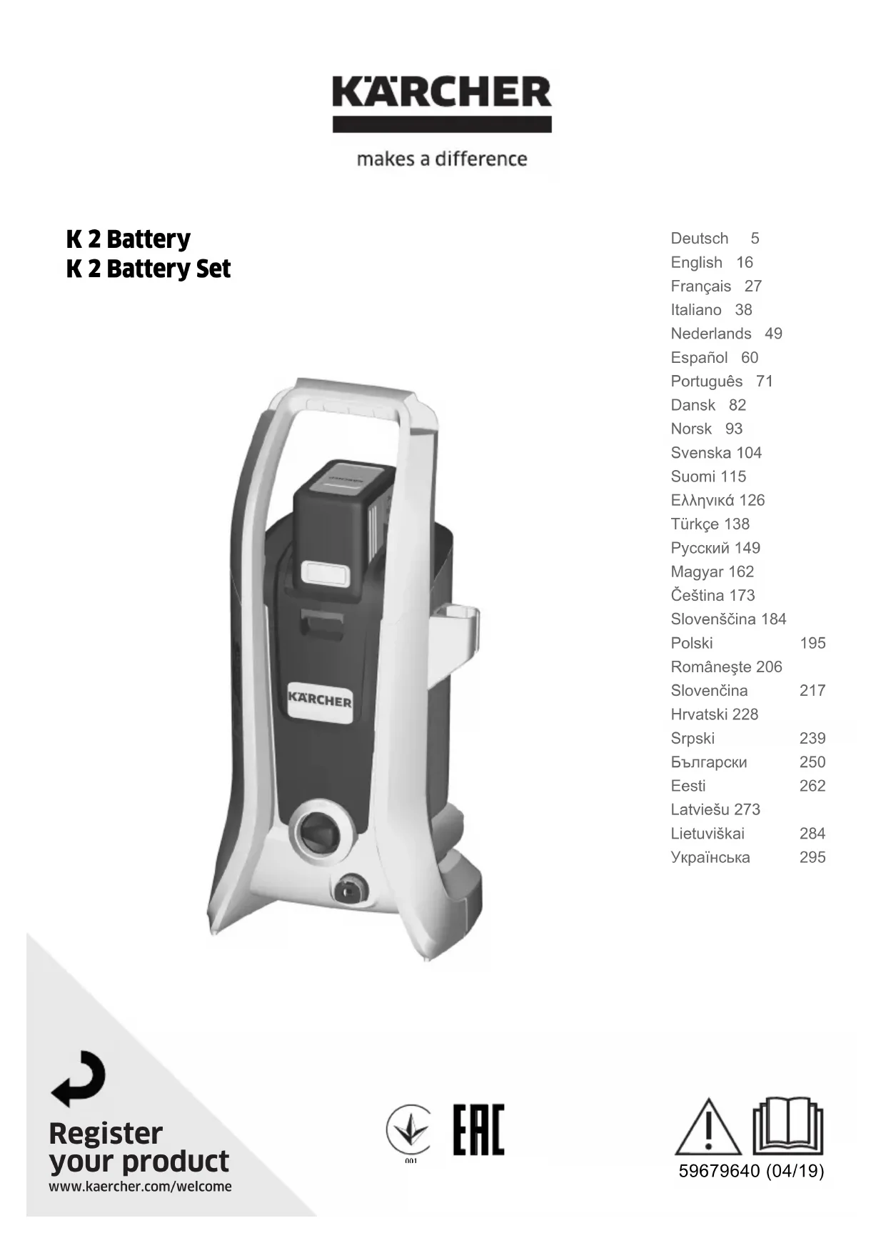 Retrouvez gratuitement la notice de l'appareil K 2 Battery Set Kärcher au format PDF.