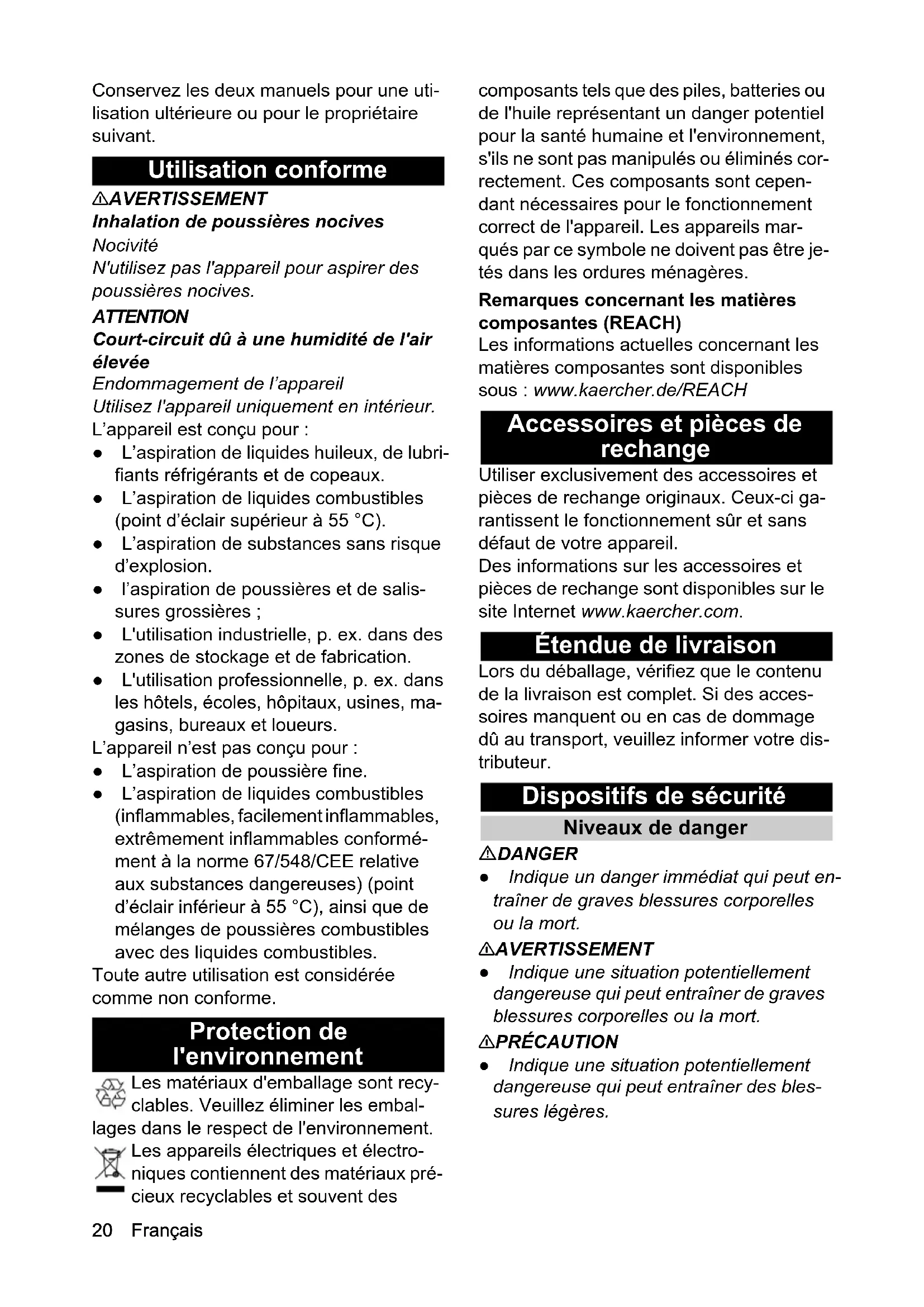 - Déclaration de conformité UE Français Conservez les deux manuels pour une uti- lisation ultérieure ou pour le propriétaire suivant. Utilisation conforme 몇 AVERTISSEMENT Inhalation de poussières nocives Nocivité N'utilisez pas l'appareil pour aspirer des poussières nocives. ATTENTION Court-circuit dû à une humidité de l'air élevée Endommagement de l’appareil Utilisez l'appareil uniquement en intérieur. L’appareil est conçu pour : ● L’aspiration de liquides huileux, de lubri- fiants réfrigérants et de copeaux. ● L’aspiration de liquides combustibles (point d’éclair supérieur à 55 °C). ● L’aspiration de substances sans risque d’explosion. ● l’aspiration de poussières et de salis- sures grossières ; ● L'utilisation industrielle, p. ex. dans des zones de stockage et de fabrication. ● L'utilisation professionnelle, p. ex. dans les hôtels, écoles, hôpitaux, usines, ma- gasins, bureaux et loueurs. L’appareil n’est pas conçu pour : ● L’aspiration de poussière fine. ● L’aspiration de liquides combustibles (inflammables, facilement inflammables, extrêmement inflammables conformé- ment à la norme 67/548/CEE relative aux substances dangereuses) (point d’éclair inférieur à 55 °C), ainsi que de mélanges de poussières combustibles avec des liquides combustibles. Toute autre utilisation est considérée comme non conforme. Protection de l'environnement Les matériaux d'emballage sont recy- clables. Veuillez éliminer les embal- lages dans le respect de l'environnement. Les appareils électriques et électro- niques contiennent des matériaux pré- cieux recyclables et souvent des composants tels que des piles, batteries ou de l'huile représentant un danger potentiel pour la santé humaine et l'environnement, s'ils ne sont pas manipulés ou éliminés cor- rectement. Ces composants sont cepen- dant nécessaires pour le fonctionnement correct de l'appareil. Les appareils mar- qués par ce symbole ne doivent pas être je- tés dans les ordures ménagères. Remarques concernant les matières composantes (REACH) Les informations actuelles concernant les matières composantes sont disponibles sous : www.kaercher.de/REACH Accessoires et pièces de rechange Utiliser exclusivement des accessoires et pièces de rechange originaux. Ceux-ci ga- rantissent le fonctionnement sûr et sans défaut de votre appareil. Des informations sur les accessoires et pièces de rechange sont disponibles sur le site Internet www.kaercher.com. Étendue de livraison Lors du déballage, vérifiez que le contenu de la livraison est complet. Si des acces- soires manquent ou en cas de dommage dû au transport, veuillez informer votre dis- tributeur. Dispositifs de sécurité Niveaux de danger DANGER ● Indique un danger immédiat qui peut en- traîner de graves blessures corporelles ou la mort. 몇 AVERTISSEMENT ● Indique une situation potentiellement dangereuse qui peut entraîner de graves blessures corporelles ou la mort. 몇 PRÉCAUTION ● Indique une situation potentiellement dangereuse qui peut entraîner des bles- sures légères.Français 21 ATTENTION ● Indique une situation potentiellement dangereuse qui peut entraîner des dom- mages matériels. Consignes de sécurité 몇 AVERTISSEMENT ● L’appareil n’est pas adapté pour l’aspira- tion de poussières nocives. ● Protégez l’appareil contre la pluie. Ne stockez pas l'appareil à l’extérieur. ● Avant chaque mise en service, vérifiez si les liaisons équipotentielles (conducteurs de terre) sont raccordées. 몇 PRÉCAUTION ● Coupez l'appareil et débranchez la fiche secteur après chaque utilisation. ATTENTION ● Utilisez l'appareil uniquement en inté- rieur. ● Risque d’écrasement ! Portez des gants lorsque vous retirez ou placez la tête d’aspiration, l’unité de filtration ou le col- lecteur. ● Risque d’endommagement ! N’aspirez ja- mais sans filtre ou avec un filtre endom- magé. ● Portez des chaussures de sécurité lorsque vous utilisez l’appareil. ● Ne déplacez l’appareil qu’à la vitesse de marche et éventuellement à deux si le sol est en pente. ● Veillez à ce que de la poussière ne s’échappe pas lors du remplacement des accessoires. Appareils avec châssis basculant (Tc) ATTENTION Risque de blessures Risque d’écrasement par le basculement du réservoir de liquide Laissez le verrouillage s’enclencher après le basculement. Comportement en cas d’urgence DANGER Risque de blessure et d'endommage- ment lors de l’aspiration de matériaux inflammables, en cas de court-circuit ou d’autres défauts électriques Risque d’inhalation de gaz nocifs, risque d’électrocution, risque dû à des brûlures. Coupez et débranchez la fiche secteur de l’appareil en cas d’urgence. Raccordement électrique Raccordez l’appareil uniquement à un rac- cordement électrique réalisé par un instal- lateur électricien selon la norme CEI 60364. Puissance raccordée, voir Caractéristiques techniques et plaque signalétique. Il est interdit d’utiliser un câble de rallonge. DANGER Risque d’électrocution Danger de mort N’endommagez pas les câbles de raccor- dement électrique en roulant dessus, les écrasant ou les étirant, p.ex. Protégez les câbles de la chaleur, de l'huile et des bords vifs. Vérifiez le câble d'alimentation électrique de l’appareil avant chaque utilisation. Ne mettez pas l’appareil en service si le câble est endommagé. Faites remplacer le câble endommagé par un électricien. Symboles sur l’appareil Marquage du niveau de remplissage de liquide maximal admissible Voir chapitre Vérifier l’indicateur de niveau. ATTENTION Risque d’endommagement de l’appareil Ecoulement d’eau en raison du dépasse- ment du niveau de remplissage maximal de liquide. Videz l’appareil avant que le niveau de remplissage maximal de liquide soit atteint.22 Français Description de l'appareil Pour la figure, voir pa