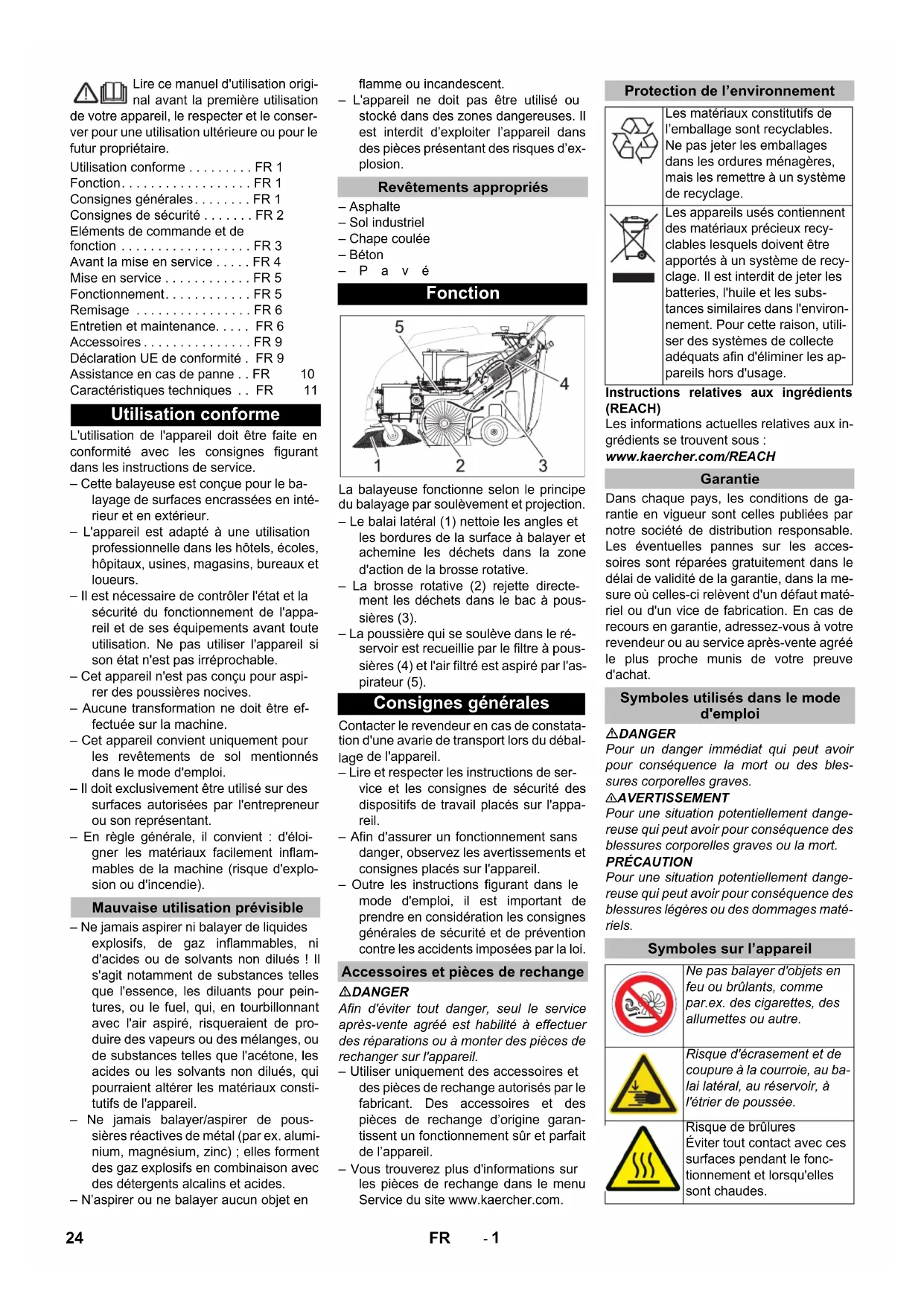 0,2 0,2 23EN- 1 Lire ce manuel d'utilisation origi- nal avant la première utilisation de votre appareil, le respecter et le conser- ver pour une utilisation ultérieure ou pour le futur propriétaire. L'utilisation de l'appareil doit être faite en conformité avec les consignes figurant dans les instructions de service. – Cette balayeuse est conçue pour le ba- layage de surfaces encrassées en inté- rieur et en extérieur. – L'appareil est adapté à une utilisation professionnelle dans les hôtels, écoles, hôpitaux, usines, magasins, bureaux et loueurs. – Il est nécessaire de contrôler l'état et la sécurité du fonctionnement de l'appa- reil et de ses équipements avant toute utilisation. Ne pas utiliser l'appareil si son état n'est pas irréprochable. – Cet appareil n'est pas conçu pour aspi- rer des poussières nocives. – Aucune transformation ne doit être ef- fectuée sur la machine. – Cet appareil convient uniquement pour les revêtements de sol mentionnés dans le mode d'emploi. – Il doit exclusivement être utilisé sur des surfaces autorisées par l'entrepreneur ou son représentant. – En règle générale, il convient : d'éloi- gner les matériaux facilement inflam- mables de la machine (risque d'explo- sion ou d'incendie). – Ne jamais aspirer ni balayer de liquides explosifs, de gaz inflammables, ni d'acides ou de solvants non dilués ! Il s'agit notamment de substances telles que l'essence, les diluants pour pein- tures, ou le fuel, qui, en tourbillonnant avec l'air aspiré, risqueraient de pro- duire des vapeurs ou des mélanges, ou de substances telles que l'acétone, les acides ou les solvants non dilués, qui pourraient altérer les matériaux consti- tutifs de l'appareil. – Ne jamais balayer/aspirer de pous- sières réactives de métal (par ex. alumi- nium, magnésium, zinc) ; elles forment des gaz explosifs en combinaison avec des détergents alcalins et acides. – N’aspirer ou ne balayer aucun objet en flamme ou incandescent. – L'appareil ne doit pas être utilisé ou stocké dans des zones dangereuses. Il est interdit d’exploiter l’appareil dans des pièces présentant des risques d’ex- plosion. – Asphalte – Sol industriel – Chape coulée – Béton –Pavé La balayeuse fonctionne selon le principe du balayage par soulèvement et projection. – Le balai latéral (1) nettoie les angles et les bordures de la surface à balayer et achemine les déchets dans la zone d'action de la brosse rotative. – La brosse rotative (2) rejette directe- ment les déchets dans le bac à pous- sières (3). – La poussière qui se soulève dans le ré- servoir est recueillie par le filtre à pous- sières (4) et l'air filtré est aspiré par l'as- pirateur (5). Contacter le revendeur en cas de constata- tion d'une avarie de transport lors du débal- lag e de l'appareil. – Lire et respecter les instructions de ser- vice et les consignes de sécurité des dispositifs de travail placés sur l'appa- reil. – Afin d'assurer un fonctionnement sans danger, observez les avertissements et consignes placés sur l'appareil. – Outre les instructions figurant dans le mode d'emploi, il est important de prendre en considération les consignes générales de sécurité et de prévention contre les accidents imposées par la loi. DANGER Afin d'éviter tout danger, seul le service après-vente agréé est habilité à effectuer des réparations ou à monter des pièces de rechanger sur l'appareil. – Utiliser uniquement des accessoires et des pièces de rechange autorisés par le fabricant. Des accessoires et des pièces de rechange d’origine garan- tissent un fonctionnement sûr et parfait de l’appareil. – Vous trouverez plus d'informations sur les pièces de rechange dans le menu Service du site www.kaercher.com. Instructions relatives aux ingrédients (REACH) Les informations actuelles relatives aux in- grédients se trouvent sous : www.kaercher.com/REACH Dans chaque pays, les conditions de ga- rantie en vigueur sont celles publiées par notre société de distribution responsable. Les éventuelles pannes sur les acces- soires sont réparées gratuitement dans le délai de validité de la garantie, dans la me- sure où celles-ci relèvent d'un défaut maté- riel ou d'un vice de fabrication. En cas de recours en garantie, adressez-vous à votre revendeur ou au service après-vente agréé le plus proche munis de votre preuve d'achat. DANGER Pour un danger immédiat qui peut avoir pour conséquence la mort ou des bles- sures corporelles graves. 몇 AVERTISSEMENT Pour une situation potentiellement dange- reuse qui peut avoir pour conséquence des blessures corporelles graves ou la mort. PRÉCAUTION Pour une situation potentiellement dange- reuse qui peut avoir pour conséquence des blessures légères ou des dommages maté- riels. Utilisation conforme . . . . . . . . . FR 1 Fonction. . . . . . . . . . . . . . . . . . FR 1 Consignes générales. . . . . . . . FR 1 Consignes de sécurité . . . . . . . FR 2 Eléments de commande et de fonction . . . . . . . . . . . . . . . . . . FR 3 Avant la mise en service . . . . . FR 4 Mise en service . . . . . . . . . . . . FR 5 Fonctionnement. . . . . . . . . . . . FR 5 Remisage . . . . . . . . . . . . . . . . FR 6 Entretien et maintenance. . . . . FR 6 Accessoires . . . . . . . . . . . . . . . FR 9 Déclaration UE de conformité . FR 9 Assistance en cas de panne . . FR 10 Caractéristiques techniques . . FR 11 Utilisation conforme Mauvaise utilisation prévisible Revêtements appropriés Fonction Consignes générales Accessoires et pièces de rechange Protection de l’environnement Les matériaux constitutifs de l’emballage sont recyclables. Ne pas jeter les emballages dans les ordures ménagères, mais les remettre à un système de recyclage. Les appareils usés contiennent des matériaux précieux recy- clables lesquels doivent être apportés à un système de recy- clage. Il est interdit de j