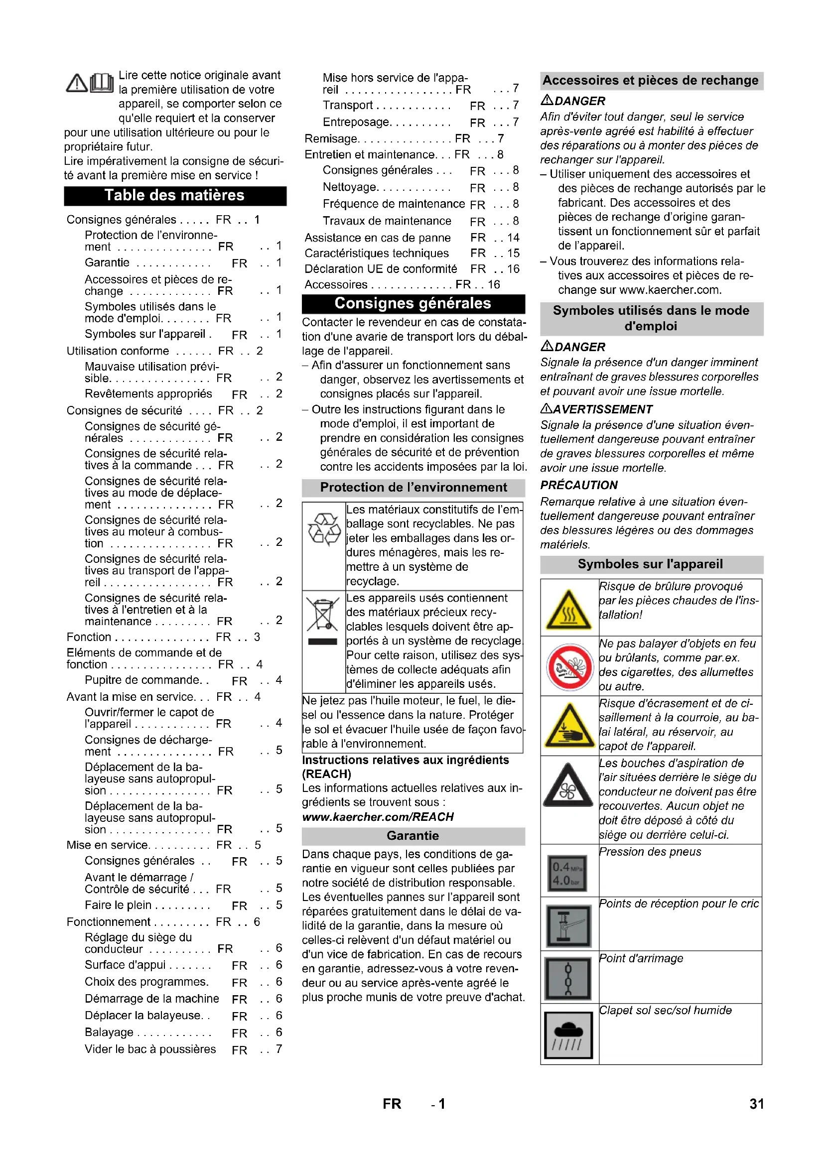 • Applied conformity evaluation method 2000/14/EC: Appendix V Sound power level dB(A) Measured: 94 Guaranteed: 97 Chairman of the Board of Management Director Regulatory Affairs & Certification Accessories Side brushes, stand- ard 6.906-132.0 For cleaning of indoor and outdoor areas. Hard side-brushes 6.905-625.0 For removing stubborn dirt in the external area; resistant to moisture. Side-brushes, soft 6.905-626.0 Especially for sweeping fine dust on even floors. Roller brush, standard 4.762-430.0 Resistant of wear and moisture. Universal bristles for inside and outside cleaning. Roller-brush, soft 4.762-442.0 With natural bristles especially for fine dust sweeping on smooth indoor floors. Not re- sistant to wetness; not for abrasive surfac- es. Roller-brush, hard 4.762-443.0 For removing stubborn dirt in the external area; resistant to moisture. Dust filter 6.414-576.0 Roller brush, antistatic 4.762-441.0 Upgrade kit solid rub- ber tyres 2.641-129.0 Upgrade kit side brush left 2.644-268.0 Attachment set: over- all lamp 2.643-887.0 Set holder brush homebase 4.035-523.0 Set coarse dirt pliers homebase 4.035-524.0 30 ENRegister your product and benet from many advantages. Registrieren Sie Ihr Produkt und protieren Sie von vielen Vorteilen. Enregistrez votre produit et bénécier de nombreux avantages. Registre su producto y aproveche de muchas ventajas. Bewerten Sie Ihr Produkt und sagen Sie uns Ihre Meinung. Rate your product and tell us your opinion. Évaluer votre produit et dites-nous votre opinion. Reseñe su producto y díganos su opinión. www.kaercher.com/welcome www.kaercher.com/dealersearch Alfred Kärcher SE & Co. KGAlfred-Kärcher-Str. 28-4071364 Winnenden (Germany)Tel.: +49 7195 14-0Fax: +49 7195 14-2212 DANKE! THANK YOU! MERCI! GRACIAS! !- 1 Lire cette notice originale avant la première utilisation de votre appareil, se comporter selon ce qu'elle requiert et la conserver pour une utilisation ultérieure ou pour le propriétaire futur. Lire impérativement la consigne de sécuri- té avant la première mise en service ! Contacter le revendeur en cas de constata- tion d'une avarie de transport lors du débal- lage de l'appareil. – Afin d'assurer un fonctionnement sans danger, observez les avertissements et consignes placés sur l'appareil. – Outre les instructions figurant dans le mode d'emploi, il est important de prendre en considération les consignes générales de sécurité et de prévention contre les accidents imposées par la loi. Instructions relatives aux ingrédients (REACH) Les informations actuelles relatives aux in- grédients se trouvent sous : www.kaercher.com/REACH Dans chaque pays, les conditions de ga- rantie en vigueur sont celles publiées par notre société de distribution responsable. Les éventuelles pannes sur l’appareil sont réparées gratuitement dans le délai de va- lidité de la garantie, dans la mesure où celles-ci relèvent d'un défaut matériel ou d'un vice de fabrication. En cas de recours en garantie, adressez-vous à votre reven- deur ou au service après-vente agréé le plus proche munis de votre preuve d'achat. DANGER Afin d'éviter tout danger, seul le service après-vente agréé est habilité à effectuer des réparations ou à monter des pièces de rechanger sur l'appareil. – Utiliser uniquement des accessoires et des pièces de rechange autorisés par le fabricant. Des accessoires et des pièces de rechange d’origine garan- tissent un fonctionnement sûr et parfait de l’appareil. – Vous trouverez des informations rela- tives aux accessoires et pièces de re- change sur www.kaercher.com. DANGER Signale la présence d'un danger imminent entraînant de graves blessures corporelles et pouvant avoir une issue mortelle. 몇 AVERTISSEMENT Signale la présence d'une situation éven- tuellement dangereuse pouvant entraîner de graves blessures corporelles et même avoir une issue mortelle. PRÉCAUTION Remarque relative à une situation éven- tuellement dangereuse pouvant entraîner des blessures légères ou des dommages matériels. Table des matières Consignes générales