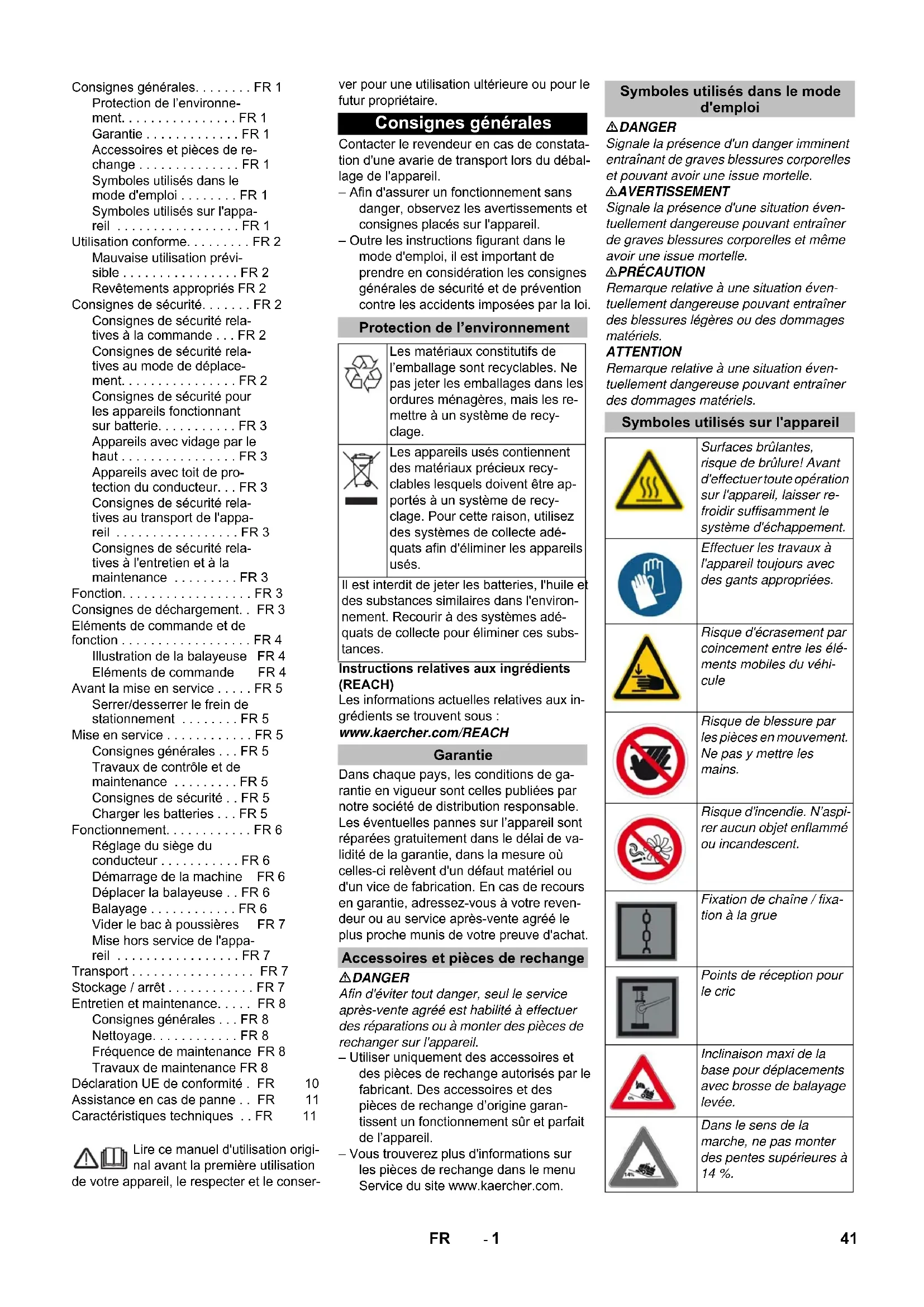 Dimensions and weights Length x width x height mm 1847 x 1065 x 1388 1847 x 1065 x 1388 Right turning radius mm 2470 2470 Left turning radius mm 2470 2470 Unladen weight (with/ without battery) kg 560/860 560/860 Permissible overall weight kg 1224 1224 Permissible front axle load kg 734 734 Permissible rear axle load kg 490 490 Subject to technical modifications! 40 EN- 1 Lire ce manuel d'utilisation origi- nal avant la première utilisation de votre appareil, le respecter et le conser- ver pour une utilisation ultérieure ou pour le futur propriétaire. Contacter le revendeur en cas de constata- tion d'une avarie de transport lors du débal- lage de l'appareil. – Afin d'assurer un fonctionnement sans danger, observez les avertissements et consignes placés sur l'appareil. – Outre les instructions figurant dans le mode d'emploi, il est important de prendre en considération les consignes générales de sécurité et de prévention contre les accidents imposées par la loi. Instructions relatives aux ingrédients (REACH) Les informations actuelles relatives aux in- grédients se trouvent sous : www.kaercher.com/REACH Dans chaque pays, les conditions de ga- rantie en vigueur sont celles publiées par notre société de distribution responsable. Les éventuelles pannes sur l’appareil sont réparées gratuitement dans le délai de va- lidité de la garantie, dans la mesure où celles-ci relèvent d'un défaut matériel ou d'un vice de fabrication. En cas de recours en garantie, adressez-vous à votre reven- deur ou au service après-vente agréé le plus proche munis de votre preuve d'achat. DANGER Afin d'éviter tout danger, seul le service après-vente agréé est habilité à effectuer des réparations ou à monter des pièces de rechanger sur l'appareil. – Utiliser uniquement des accessoires et des pièces de rechange autorisés par le fabricant. Des accessoires et des pièces de rechange d’origine garan- tissent un fonctionnement sûr et parfait de l’appareil. – Vous trouverez plus d'informations sur les pièces de rechange dans le menu Service du site www.kaercher.com. DANGER Signale la présence d'un danger imminent entraînant de graves blessures corporelles et pouvant avoir une issue mortelle. 몇 AVERTISSEMENT Signale la présence d'une situation éven- tuellement dangereuse pouvant entraîner de graves blessures corporelles et même avoir une issue mortelle. 몇 PRÉCAUTION Remarque relative à une situation éven- tuellement dangereuse pouvant entraîner des blessures légères ou des dommages matériels. ATTENTION Remarque relative à une situation éven- tuellement dangereuse pouvant entraîner des dommages matériels. Consignes générales. . . . . . . . FR 1 Protection de l’environne- ment. . . . . . . . . . . . . . . . FR 1 Garantie . . . . . . . . . . . . . FR 1 Accessoires et pièces de re- change . . . . . . . . . . . . . . FR 1 Symboles utilisés dans le mode d'emploi . . . . . . . . FR 1 Symboles utilisés sur l'appa- reil . . . . . . . . . . . . . . . . . FR 1 Utilisation conforme. . . . . . . . . FR 2 Mauvaise utilisation prévi- sible . . . . . . . . . . . . . . . . FR 2 Revêtements appropriés FR 2 Consignes de sécurité. . . . . . . FR 2 Consignes de sécurité rela- tives à la commande . . . FR 2 Consignes de sécurité rela- tives au mode de déplace- ment. . . . . . . . . . . . . . . . FR 2 Consignes de sécurité pour les appareils fonctionnant sur batterie. . . . . . . . . . . FR 3 Appareils avec vidage par le haut . . . . . . . . . . . . . . . . FR 3 Appareils avec toit de pro- tection du conducteur. . . FR 3 Consignes de sécurité rela- tives au transport de l'appa- reil . . . . . . . . . . . . . . . . . FR 3 Consignes de sécurité rela- tives à l'entretien et à la maintenance . . . . . . . . . FR 3 Fonction. . . . . . . . . . . . . . . . . . FR 3 Consignes de déchargement. . FR 3 Eléments de commande et de fonction . . . . . . . . . . . . . . . . . . FR 4 Illustration de la balayeuse FR 4 Eléments de commande FR 4 Avant la mise en service . . . . . FR 5 Serrer/desserrer le frein de stationnement . . . . . . . . FR 5 Mise en service . . . . . . . . . . . . FR 5 Consignes générales . . . FR 5 Travaux de contrôle et de maintenance . . . . . . . . . FR 5 Consignes de sécurité . . FR 5 Charger les batteries . . . FR 5 Fonctionnement. . . . . . . . . . . . FR 6 Réglage du siège du conducteur . . . . . . . . . . . FR 6 Démarrage de la machine FR 6 Déplacer la balayeuse . . FR 6 Balayage . . . . . . . . . . . . FR 6 Vider le bac à poussières FR 7 Mise hors service de l'appa- reil . . . . . . . . . . . . . . . . . FR 7 Transport . . . . . . . . . . . . . . . . . FR 7 Stockage / arrêt . . . . . . . . . . . . FR 7 Entretien et maintenance. . . . . FR 8 Consignes générales . . . FR 8 Nettoyage. . . . . . . . . . . . FR 8 Fréquence de maintenance FR 8 Travaux de maintenance FR 8 Déclaration UE de conformité . FR 10 Assistance en cas de panne . . FR 11 Caractéristiques techniques . . FR 11 Consignes générales Protection de l’environnement Les matériaux constitutifs de l’emballage sont recyclables. Ne pas jeter les emballages dans les ordures ménagères, mais les re- mettre à un système de recy- clage. Les appareils usés contiennent des matériaux précieux recy- clables lesquels doivent être ap- portés à un système de recy- clage. Pour cette raison, utilisez des systèmes de collecte adé- quats afin d'éliminer les appareils usés. Il est interdit de jeter les batteries, l'huile et des substances similaires dans l'environ- nement. Recourir à des systèmes adé- quats de collecte pour éliminer ces subs- tances. Garantie Accessoires et pièces de rechange Symboles utilisés dans le mode d'emploi Symboles utilisés sur l'appareil Surfaces brûlantes, risque de brûlure! Avant d'effectuer toute opération sur l'appareil, laisser re- froidir suffisamment le système d'échappement. Effectuer les travaux à l'appare
