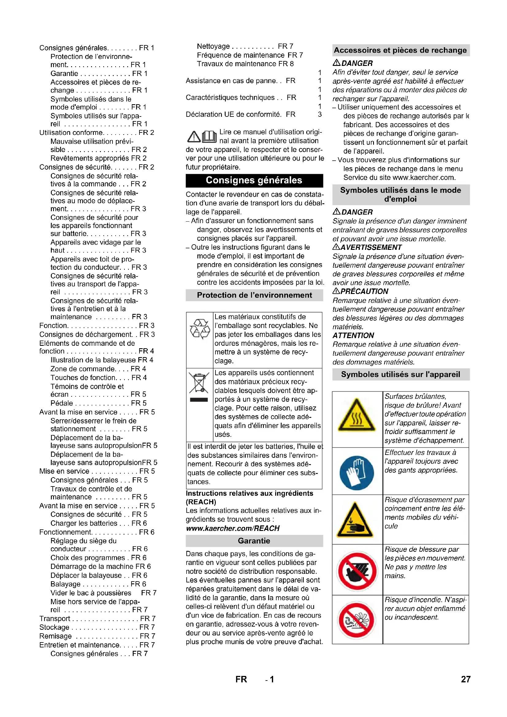 0,1 Dimensions and weights Length x width x height mm 2442x1570x1640 Right turning radius mm 1515 Left turning radius mm 1600 Unladen weight (with/ without battery) kg 1398/2690 Permissible overall weight kg 3089 Permissible front axle load kg 1417 Permissible rear axle load kg 1672 Subject to technical modifications! 25EN- 12 We hereby declare that the machine de- scribed below complies with the relevant basic safety and health requirements of the EU Directives, both in its basic design and construction as well as in the version put into circulation by us. This declaration shall cease to be valid if the machine is modified without our prior approval. The signatories act on behalf of and with the authority of the company management. Documentation supervisor: S. Reiser Alfred Kärcher SE & Co. KG Alfred-Kärcher-Straße 28-40 71364 Winnenden (Germany) Tel.: +49 7195 14-0 Fax: +49 7195 14-2212 Winnenden, 2018/09/01 EU Declaration of Conformity Product: Sweeper Type: 1.186-xxx Relevant EU Directives 2006/42/EC (+2009/127/EC) 2014/30/EU 2000/14/EC Applied harmonized standards EN 60335–1 EN 60335–2–72 EN 55012: 2007 + A1: 2009 EN 61000–6–2: 2005 EN 62233: 2008 Applied conformity evaluation method 2000/14/EC: Appendix V Sound power level dB(A) Measured: 94 Guaranteed: 97 Chairman of the Board of Management Director Regulatory Affairs & Certification 26 EN- 1 Lire ce manuel d'utilisation origi- nal avant la première utilisation de votre appareil, le respecter et le conser- ver pour une utilisation ultérieure ou pour le futur propriétaire. Contacter le revendeur en cas de constata- tion d'une avarie de transport lors du débal- lage de l'appareil. – Afin d'assurer un fonctionnement sans danger, observez les avertissements et consignes placés sur l'appareil. – Outre les instructions figurant dans le mode d'emploi, il est important de prendre en considération les consignes générales de sécurité et de prévention contre les accidents imposées par la loi. Instructions relatives aux ingrédients (REACH) Les informations actuelles relatives aux in- grédients se trouvent sous : www.kaercher.com/REACH Dans chaque pays, les conditions de ga- rantie en vigueur sont celles publiées par notre société de distribution responsable. Les éventuelles pannes sur l’appareil sont réparées gratuitement dans le délai de va- lidité de la garantie, dans la mesure où celles-ci relèvent d'un défaut matériel ou d'un vice de fabrication. En cas de recours en garantie, adressez-vous à votre reven- deur ou au service après-vente agréé le plus proche munis de votre preuve d'achat. DANGER Afin d'éviter tout danger, seul le service après-vente agréé est habilité à effectuer des réparations ou à monter des pièces de rechanger sur l'appareil. – Utiliser uniquement des accessoires et des pièces de rechange autorisés par le fabricant. Des accessoires et des pièces de rechange d’origine garan- tissent un fonctionnement sûr et parfait de l’appareil. – Vous trouverez plus d'informations sur les pièces de rechange dans le menu Service du site www.kaercher.com. DANGER Signale la présence d'un danger imminent entraînant de graves blessures corporelles et pouvant avoir une issue mortelle. 몇 AVERTISSEMENT Signale la présence d'une situation éven- tuellement dangereuse pouvant entraîner de graves blessures corporelles et même avoir une issue mortelle. 몇 PRÉCAUTION Remarque relative à une situation éven- tuellement dangereuse pouvant entraîner des blessures légères ou des dommages matériels. ATTENTION Remarque relative à une situation éven- tuellement dangereuse pouvant entraîner des dommages matériels. Consignes générales. . . . . . . . FR 1 Protection de l’environne- ment. . . . . . . . . . . . . . . . FR 1 Garantie . . . . . . . . . . . . . FR 1 Accessoires et pièces de re- change . . . . . . . . . . . . . . FR 1 Symboles utilisés dans le mode d'emploi . . . . . . . . FR 1 Symboles utilisés sur l'appa- reil . . . . . . . . . . . . . . . . . FR 1 Utilisation conforme. . . . . . . . . FR 2 Mauvaise utilisation prévi- sible . . . . . . . . . . . . . . . . FR 2 Revêtements appropriés FR 2 Consignes de sécurité. . . . . . . FR 2 Consignes de sécurité rela- tives à la commande . . . FR 2 Consignes de sécurité rela- tives au mode de déplace- ment. . . . . . . . . . . . . . . . FR 3 Consignes de sécurité pour les appareils fonctionnant sur batterie. . . . . . . . . . . FR 3 Appareils avec vidage par le haut . . . . . . . . . . . . . . . . FR 3 Appareils avec toit de pro- tection du conducteur. . . FR 3 Consignes de sécurité rela- tives au transport de l'appa- reil . . . . . . . . . . . . . . . . . FR 3 Consignes de sécurité rela- tives à l'entretien et à la maintenance . . . . . . . . . FR 3 Fonction. . . . . . . . . . . . . . . . . . FR 3 Consignes de déchargement. . FR 3 Eléments de commande et de fonction . . . . . . . . . . . . . . . . . . FR 4 Illustration de la balayeuse FR 4 Zone de commande. . . . FR 4 Touches de fonction. . . . FR 4 Témoins de contrôle et écran . . . . . . . . . . . . . . . FR 5 Pédale . . . . . . . . . . . . . . FR 5 Avant la mise en service . . . . . FR 5 Serrer/desserrer le frein de stationnement . . . . . . . . FR 5 Déplacement de la ba- layeuse sans autopropulsionFR 5 Déplacement de la ba- layeuse sans autopropulsionFR 5 Mise en service . . . . . . . . . . . . FR 5 Consignes générales . . . FR 5 Travaux de contrôle et de maintenance . . . . . . . . . FR 5 Avant la mise en service . . . . . FR 5 Consignes de sécurité . . FR 5 Charger les batteries . . . FR 6 Fonctionnement. . . . . . . . . . . . FR 6 Réglage du siège du conducteur . . . . . . . . . . . FR 6 Choix des programmes . FR 6 Démarrage de la machine FR 6 Déplacer la balayeuse . . FR 6 Balayage . . . . . . . . . . . . FR 6 Vider le bac à poussières FR 7 Mise hors service de l'appa- reil . . . . . . . . . . . . . . . . . FR 7 Transp