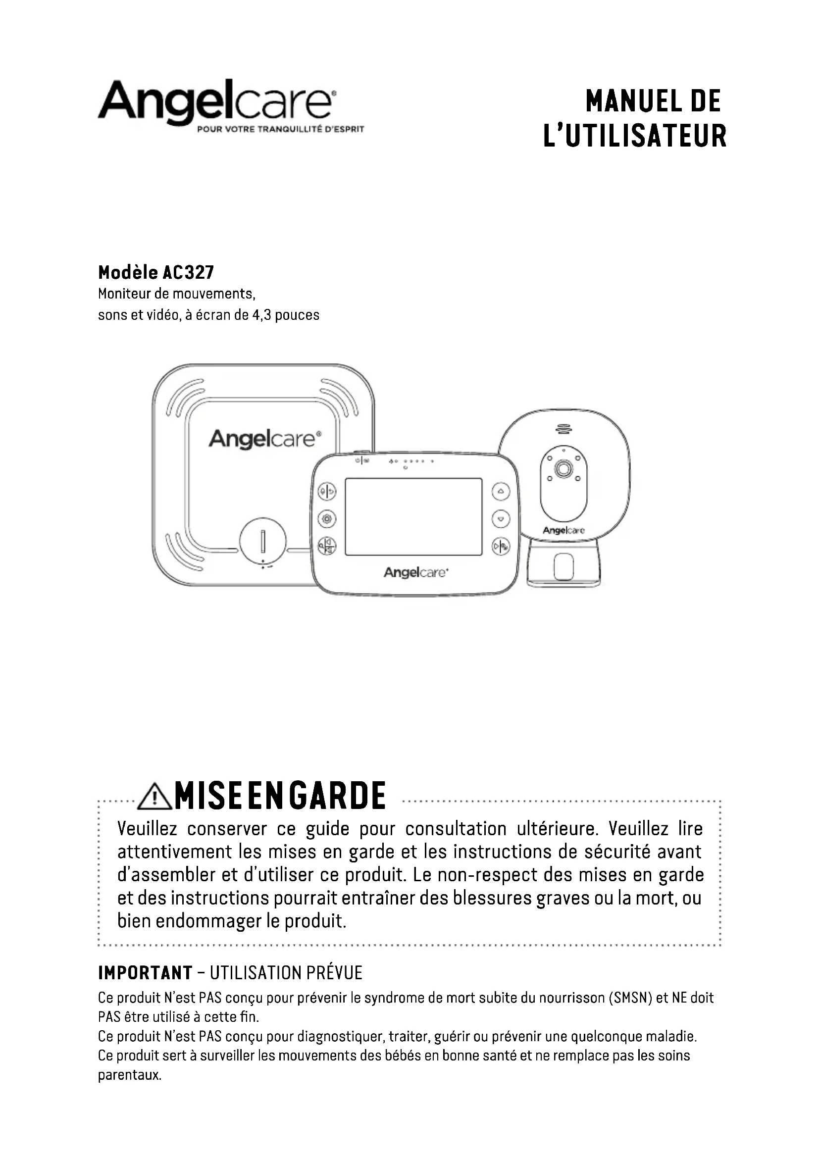 Ce produit N’est PAS conçu pour prévenir le syndrome de mort subite du nourrisson (SMSN) et NE doit PAS être utilisé à cette fin. Ce produit N’est PAS conçu pour diagnostiquer, traiter, guérir ou prévenir une quelconque maladie. Ce produit sert à surveiller les mouvements des bébés en bonne santé et ne remplace pas les soins parentaux. Modèle AC327 Moniteur de mouvements, sons et vidéo, à écran de 4,3 pouces3. N’utilisez PAS un mobile ou d’autres accessoires qui pourraient produire des mouvements ou des vibrations.4. Les ventilateurs (y compris les ventilateurs de plafond), les machines à laver, les systèmes de chauffage central et la musique forte génèrent tous des mouvements et des vibrations qui peuvent être détectés par le détecteur de mouvements et perturber son fonctionnement.5. Si une unité du nourrisson supplémentaire est ajoutée, elle doit être installée à au moins 2 mètres de l’unité du nourrisson 1 et du détecteur de mouvements, car elle peut nuire à leur fonctionnement.6. NE placez PAS le lit du bébé de façon à ce qu’il touche celui du parent ou du surveillant, car le détecteur de mouvements détectera leurs mouvements.7. NE placez PAS le lit contre un mur ou une plinthe, car les vibrations pourraient être détectées.8. Après le retrait du bébé du lit, il est possible que des mouvements continuent d’être détectés et que l’alarme ne sonne pas en raison du fait que le matelas reprend progressivement sa forme initiale.9. Assurez-vous que le lit est stable afin d’éliminer tout mouvement.10. Le lit ne doit pas être placé à proximité d’un autre lit.11. N’utilisez PAS d’autres appareils sans fil dans la pièce où le moniteur se trouve (p. ex. téléphones cellulaires, micro-ondes, etc.). Ils peuvent perturber le signal et nuire au fonctionnement de l’appareil.12. Le détecteur de mouvements est fait de plastique et ne permet pas à l’air de circuler. De la moisissure peut donc se former sous le matelas, dans la zone du détecteur de mouvements. Afin de prévenir l’apparition de moisissure, nous vous suggérons de retourner le matelas régulièrement. N’EXPOSEZ PAS L’APPAREIL À L’HUMIDITÉ. Nettoyez ou essuyez l’appareil avec un linge sec et non pelucheux.13. Le détecteur de mouvements ne doit pas être utilisé pour des enfants de plus de 24 mois.14. Ce produit ne remplace pas la supervision d’un adulte responsable.