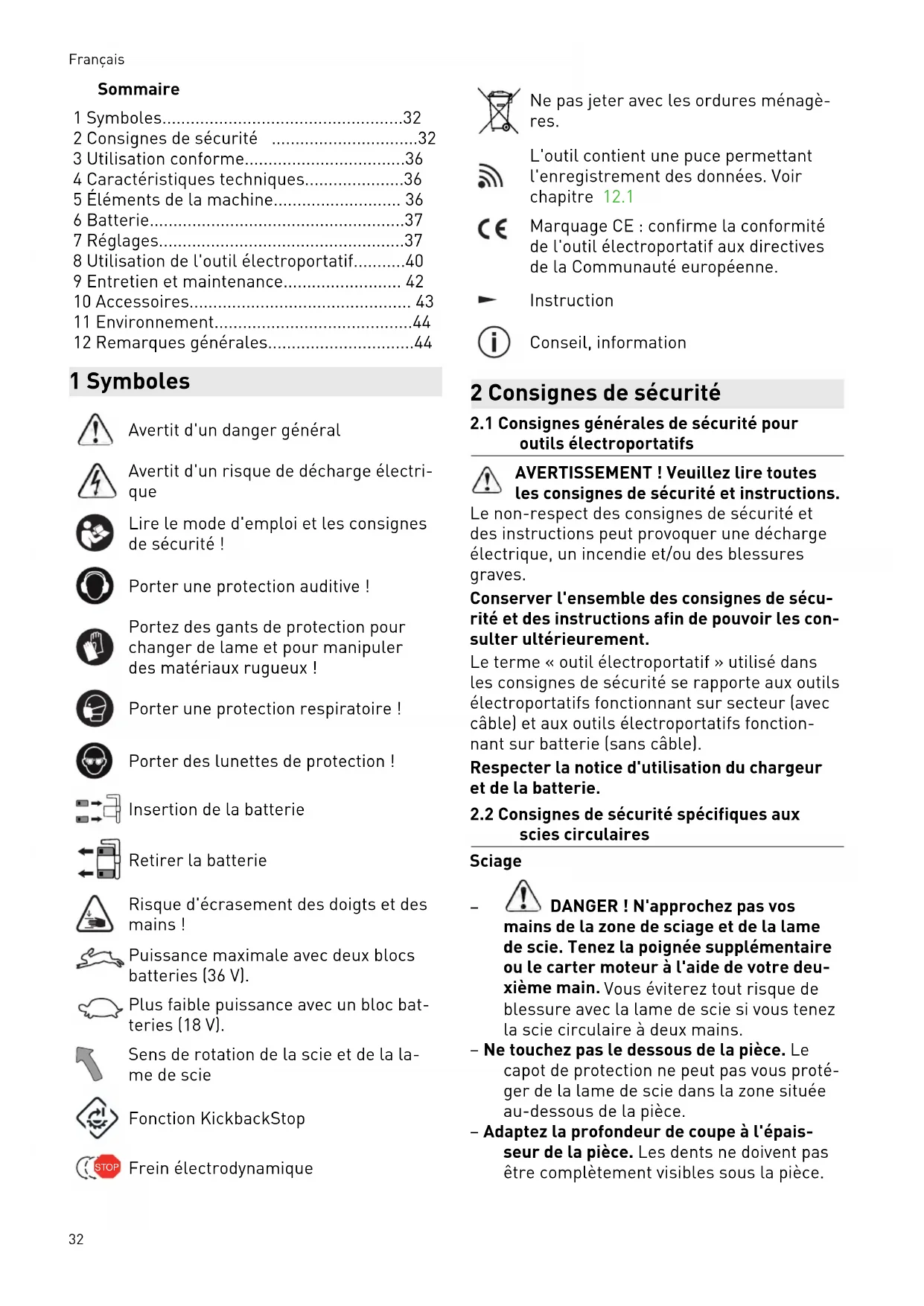 - 12 Remarques générales 1 Symboles Avertit d'un danger général Avertit d'un risque de décharge électri que Lire le mode d'emploi et les consignes de sécurité ! Porter une protection auditive ! Portez des gants de protection pour changer de lame et pour manipuler des matériaux rugueux ! Porter une protection respiratoire ! Porter des lunettes de protection ! Insertion de la batterie Retirer la batterie Risque d'écrasement des doigts et des mains ! Puissance maximale avec deux blocs batteries (36 V). Plus faible puissance avec un bloc bat teries (18 V). Sens de rotation de la scie et de la la me de scie Fonction KickbackStop STOP Frein électrodynamique Ne pas jeter avec les ordures ménagè res. L'outil contient une puce permettant l'enregistrement des données. Voir chapitre p. 44