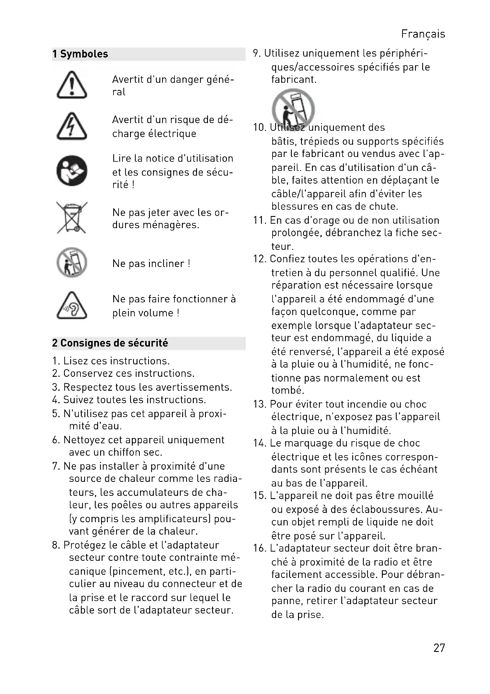 ché à proximité de la radio et être facilement accessible. Pour débran cher la radio du courant en cas de panne, retirer l'adaptateur secteur de la prise. Français 2717. Si l'adaptateur secteur ou la prise de l'appareil doit être utilisée pour la mise hors service, celui/celle-ci doit rester accessible.