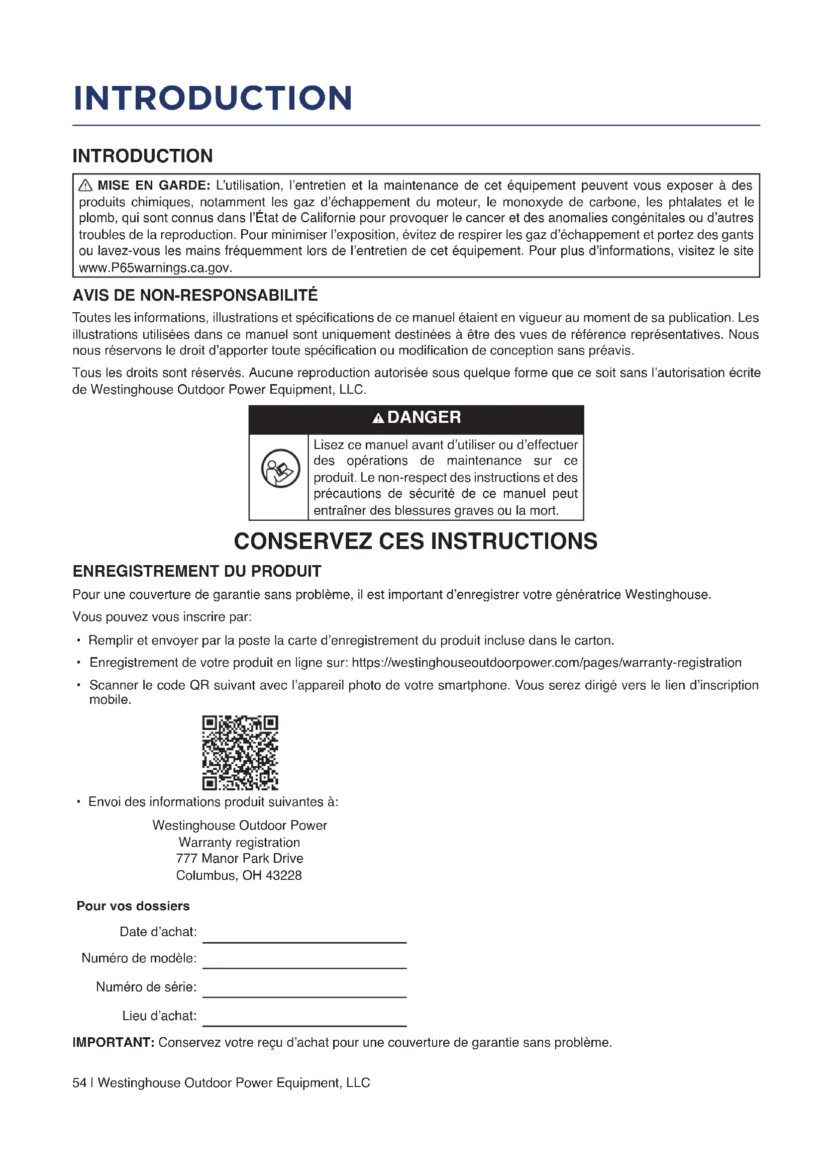 REMARQUER ........................................................................76 DÉPANNAGE .........................................................................7754 | Westinghouse Outdoor Power Equipment, LLC INTRODUCTION INTRODUCTION MISE EN GARDE: L’utilisation, l’entretien et la maintenance de cet équipement peuvent vous exposer à des produits chimiques, notamment les gaz d’échappement du moteur, le monoxyde de carbone, les phtalates et le plomb, qui sont connus dans l’État de Californie pour provoquer le cancer et des anomalies congénitales ou d’autres troubles de la reproduction. Pour minimiser l’exposition, évitez de respirer les gaz d’échappement et portez des gants ou lavez-vous les mains fréquemment lors de l’entretien de cet équipement. Pour plus d’informations, visitez le site www.P65warnings.ca.gov.