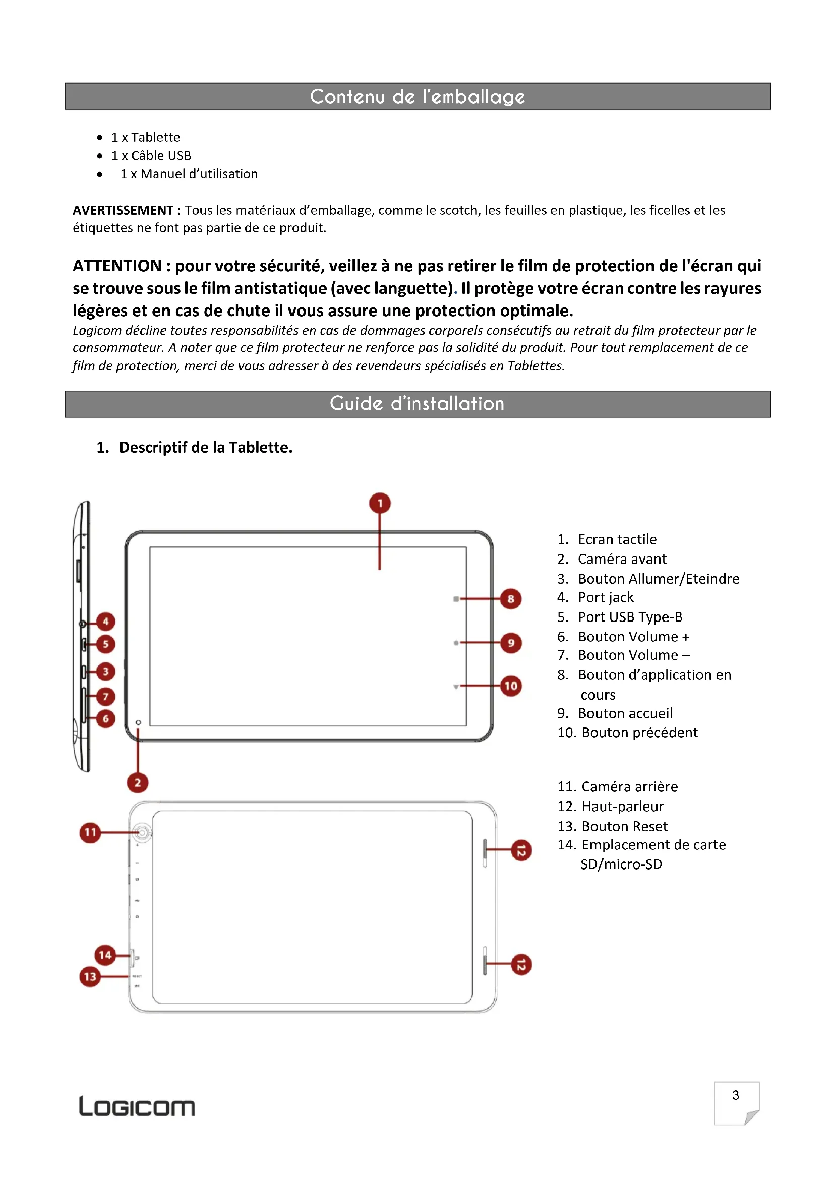 étiquettes ne font pas partie de ce produit. ATTENTION : pour votre sécurité, veillez à ne pas retirer le film de protection de l'écran qui se trouve sous le film antistatique (avec languette). Il protège votre écran contre les rayures légères et en cas de chute il vous assure une protection optimale. Logicom décline toutes responsabilités en cas de dommages corporels consécutifs au retrait du film protecteur par le consommateur. A noter que ce film protecteur ne renforce pas la solidité du produit. Pour tout remplacement de ce film de protection, merci de vous adresser à des revendeurs spécialisés en Tablettes. Guide d’installation