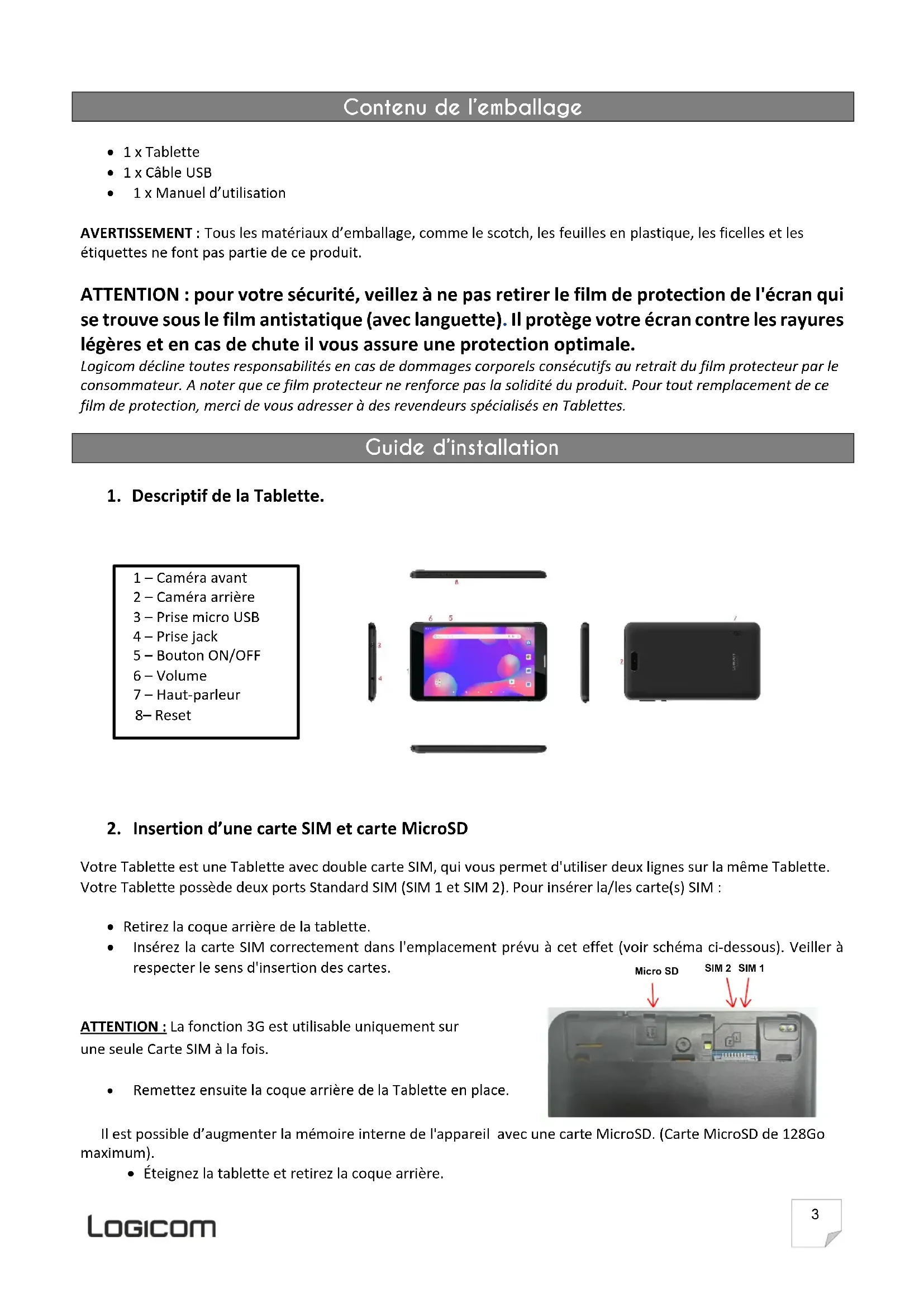 étiquettes ne font pas partie de ce produit. ATTENTION : pour votre sécurité, veillez à ne pas retirer le film de protection de l'écran qui se trouve sous le film antistatique (avec languette). Il protège votre écran contre les rayures légères et en cas de chute il vous assure une protection optimale. Logicom décline toutes responsabilités en cas de dommages corporels consécutifs au retrait du film protecteur par le consommateur. A noter que ce film protecteur ne renforce pas la solidité du produit. Pour tout remplacement de ce film de protection, merci de vous adresser à des revendeurs spécialisés en Tablettes. Guide d’installation
