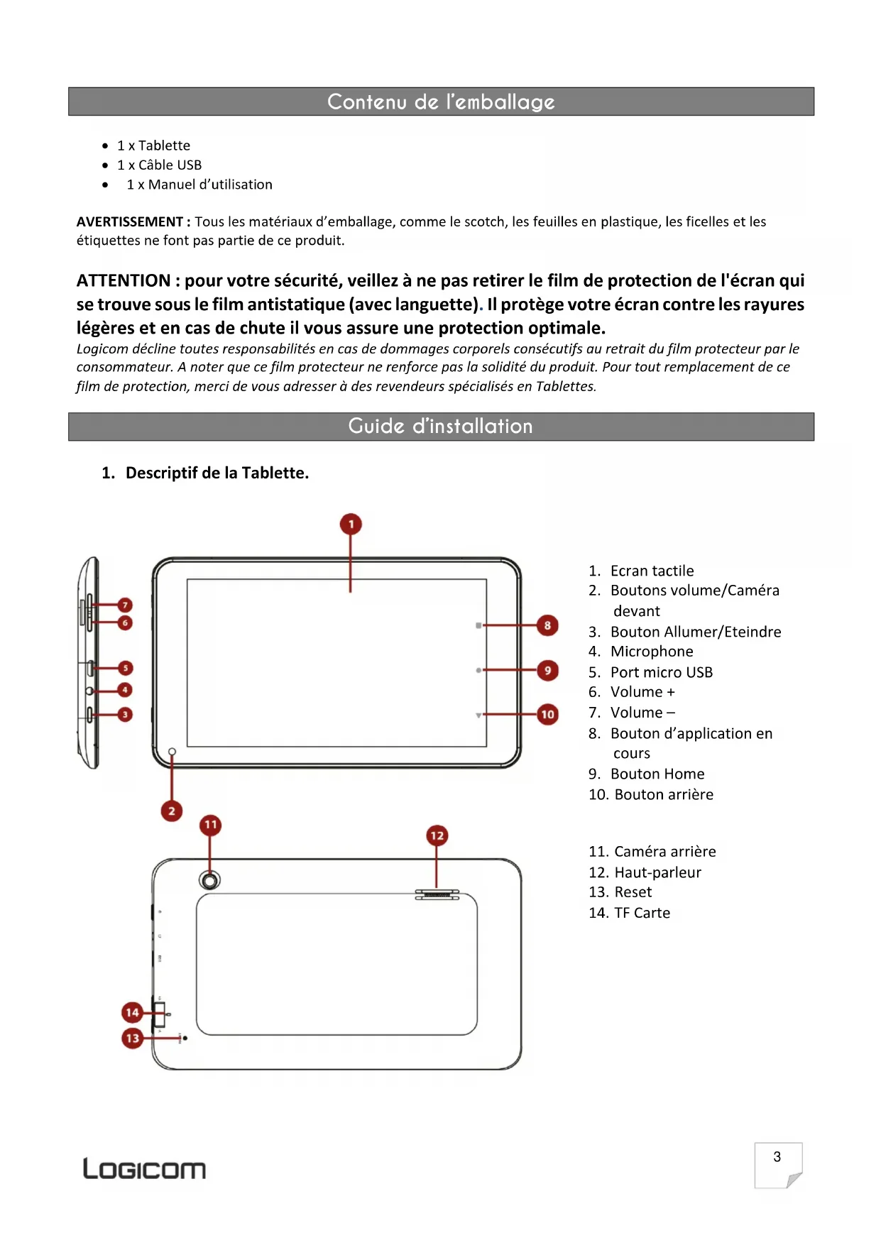 étiquettes ne font pas partie de ce produit. ATTENTION : pour votre sécurité, veillez à ne pas retirer le film de protection de l'écran qui se trouve sous le film antistatique (avec languette). Il protège votre écran contre les rayures légères et en cas de chute il vous assure une protection optimale. Logicom décline toutes responsabilités en cas de dommages corporels consécutifs au retrait du film protecteur par le consommateur. A noter que ce film protecteur ne renforce pas la solidité du produit. Pour tout remplacement de ce film de protection, merci de vous adresser à des revendeurs spécialisés en Tablettes. Guide d’installation