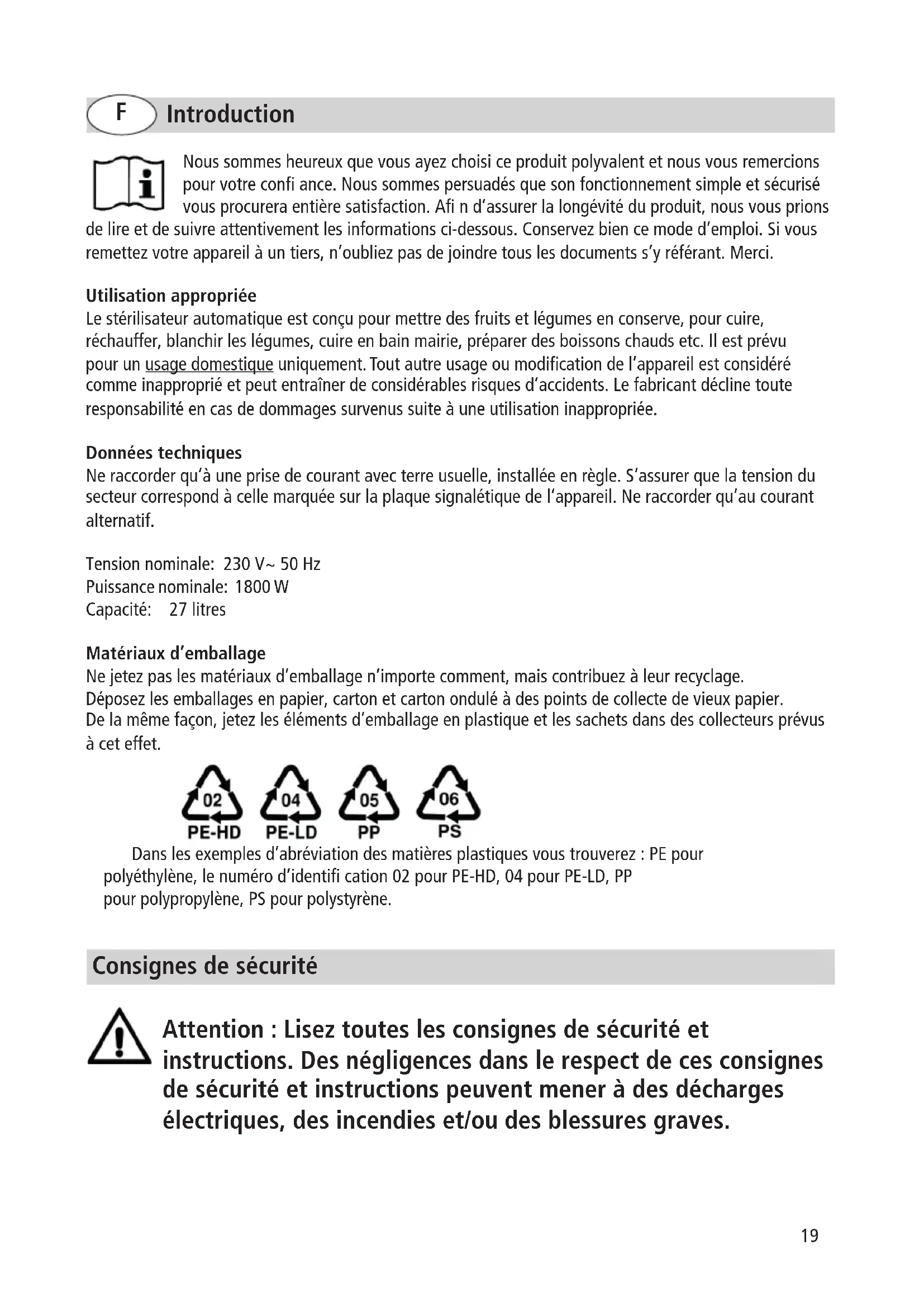 - Donotdiscardthecookingwateruntilithascooled,thiswillhelptopreventtheenamelledpots’ surfaces from damage. Special accessory: Juice-extraction top Withthejuice-extractiontop(modelEA1803)youcaneasilychangeyourauto-preservingcookeranytime intoajuicemaker.Ifyourretailerdoesnothaveajuice-extractiontopinstock,pleasegetindirecttouch withus(seerearpageforaddressdetails).19 Introduction Noussommesheureuxquevousayezchoisiceproduitpolyvalentetnousvousremercions pourvotreconance.Noussommespersuadésquesonfonctionnementsimpleetsécurisé vous procurera entière satisfaction. Afi n d’assurer la longévité du produit, nous vous prions de lire et de suivre attentivement les informations ci-dessous. Conservez bien ce mode d’emploi. Si vous remettezvotreappareilàuntiers,n’oubliezpasdejoindretouslesdocumentss’yréférant.Merci. Utilisation appropriée Lestérilisateurautomatiqueestconçupourmettredesfruitsetlégumesenconserve,pourcuire, réchauffer, blanchir les légumes, cuire en bain mairie, préparer des boissons chauds etc. Il est prévu pour un usagedomestiqueuniquement.Toutautreusageoumodicationdel’appareilestconsidéré commeinappropriéetpeutentraînerdeconsidérablesrisquesd’accidents.Lefabricantdéclinetoute responsabilité en cas de dommages survenus suite à une utilisation inappropriée. Données techniques Neraccorderqu’àuneprisedecourantavecterreusuelle,installéeenrègle.S‘assurerquelatensiondu secteurcorrespondàcellemarquéesurlaplaquesignalétiquedel‘appareil.Neraccorderqu’aucourant alternatif. Tension nominale: 230 V~ 50 Hz Puissance nominale: 1800 W Capacité: 27 litres Matériaux d’emballage Nejetezpaslesmatériauxd’emballagen’importecomment,maiscontribuezàleurrecyclage. Déposezlesemballagesenpapier,cartonetcartononduléàdespointsdecollectedevieuxpapier. Delamêmefaçon,jetezlesélémentsd’emballageenplastiqueetlessachetsdansdescollecteursprévus à cet effet. Danslesexemplesd’abréviationdesmatièresplastiquesvoustrouverez:PEpour polyéthylène, le numéro d’identifi cation 02 pour PE-HD, 04 pour PE-LD, PP pour polypropylène, PS pour polystyrène.