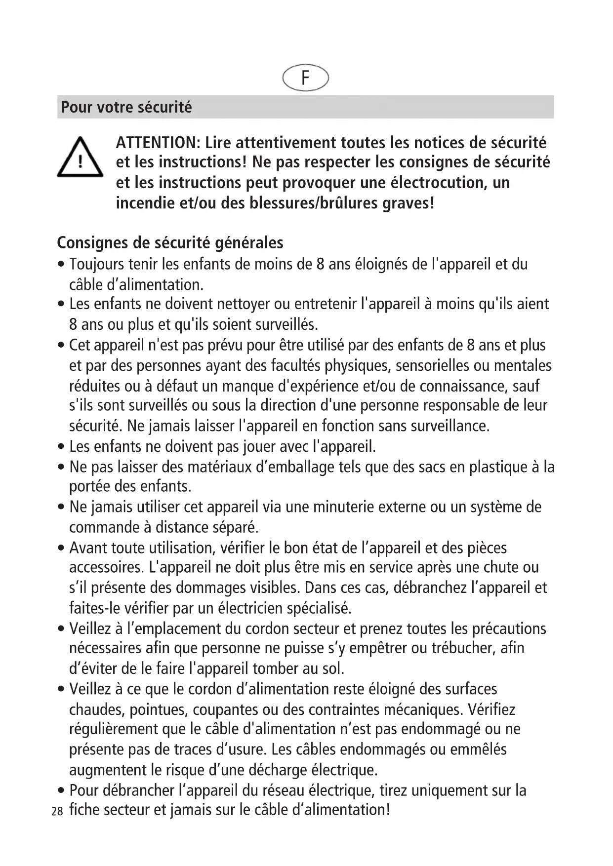 - Pour débrancher l’appareil du réseau électrique, tirez uniquement sur la fiche secteur et jamais sur le câble d’alimentation! Pour votre sécurité F29