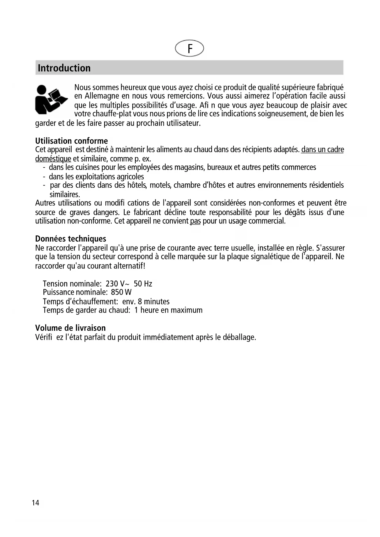 consumption. The protective effect in case of impacts or shocks is usually better. Disposal information According to the Waste Electrical and Electronic Equipment Directive (2012/19/EU), this product may not be disposed of with other household waste at the end of its service life. Therefore please submit it e.g. at a municipal collection point (e.g. recycling center) according to the laws of your country of residence for the recycling of electrical and electronic appliances. Your municipality or city administration will inform you about the disposal options. Tip: Give appliances that are no longer required but still functional to a charitable purpose (e.g. as a donation). This does not only improve the environmental balance and ensures more sustainability, but also testifi es to a welcome social commitment. Rommelsbacher ElektroHausgeräte GmbH is a member of the German "Elektro- Altgeräte Register" (EAR) foundation, which is responsible for ensuring that the German electrical and electronic equipment law is implemented. The foundation is entrusted by the German Federal Environment Agency with the task of ensuring that old appliances are properly recycled and negative effects on the environment are avoided. Better environmental compatibility through professional disposal and recycling of valuable resources is also part of the focus - this underlines our commitment for extensive sustainability.14 Nous sommes heureux que vous ayez choisi ce produit de qualité supérieure fabriqué en Allemagne en nous vous remercions. Vous aussi aimerez l’opération facile aussi que les multiples possibilités d’usage. Afi n que vous ayez beaucoup de plaisir avec votre chauffe-plat vous nous prions de lire ces indications soigneusement, de bien les garder et de les faire passer au prochain utilisateur. Utilisation conforme Cet appareil est destiné à maintenir les aliments au chaud dans des récipients adaptés. dans un cadre doméstique et similaire, comme p. ex. - dans les cuisines pour les employées des magasins, bureaux et autres petits commerces - dans les exploitations agricoles - par des clients dans des hôtels, motels, chambre d’hôtes et autres environnements résidentiels similaires. Autres utilisations ou modifi cations de l'appareil sont considérées non-conformes et peuvent être source de graves dangers. Le fabricant décline toute responsabilité pour les dégâts issus d'une utilisation non-conforme. Cet appareil ne convient pas pour un usage commercial. Données techniques Ne raccorder l'appareil qu'à une prise de courante avec terre usuelle, installée en règle. S'assurer que la tension du secteur correspond à celle marquée sur la plaque signalétique de l'appareil. Ne raccorder qu'au courant alternatif! Tension nominale: 230 V~ 50 Hz Puissance nominale: 850 W Temps d’échauffement: env. 8 minutes Temps de garder au chaud: 1 heure en maximum Volume de livraison Vérifi ez l'état parfait du produit immédiatement après le déballage. Introduction F15 Consignes de sécurité Attention : Lire attentivement les notices de sécurité ! Ne pas respecter les consignes de sécurité et les instructions peut provoquer une électrocution, un incendie et/ou des blessures graves ! Attention : Il y a des surfaces chaudes pendant l‘utilisation. Donc risque de brûlure ou blessure ! Veillez à ce que le câble d’alimentation reste éloigné des surfaces chaudes ! Consignes de sécurité générales