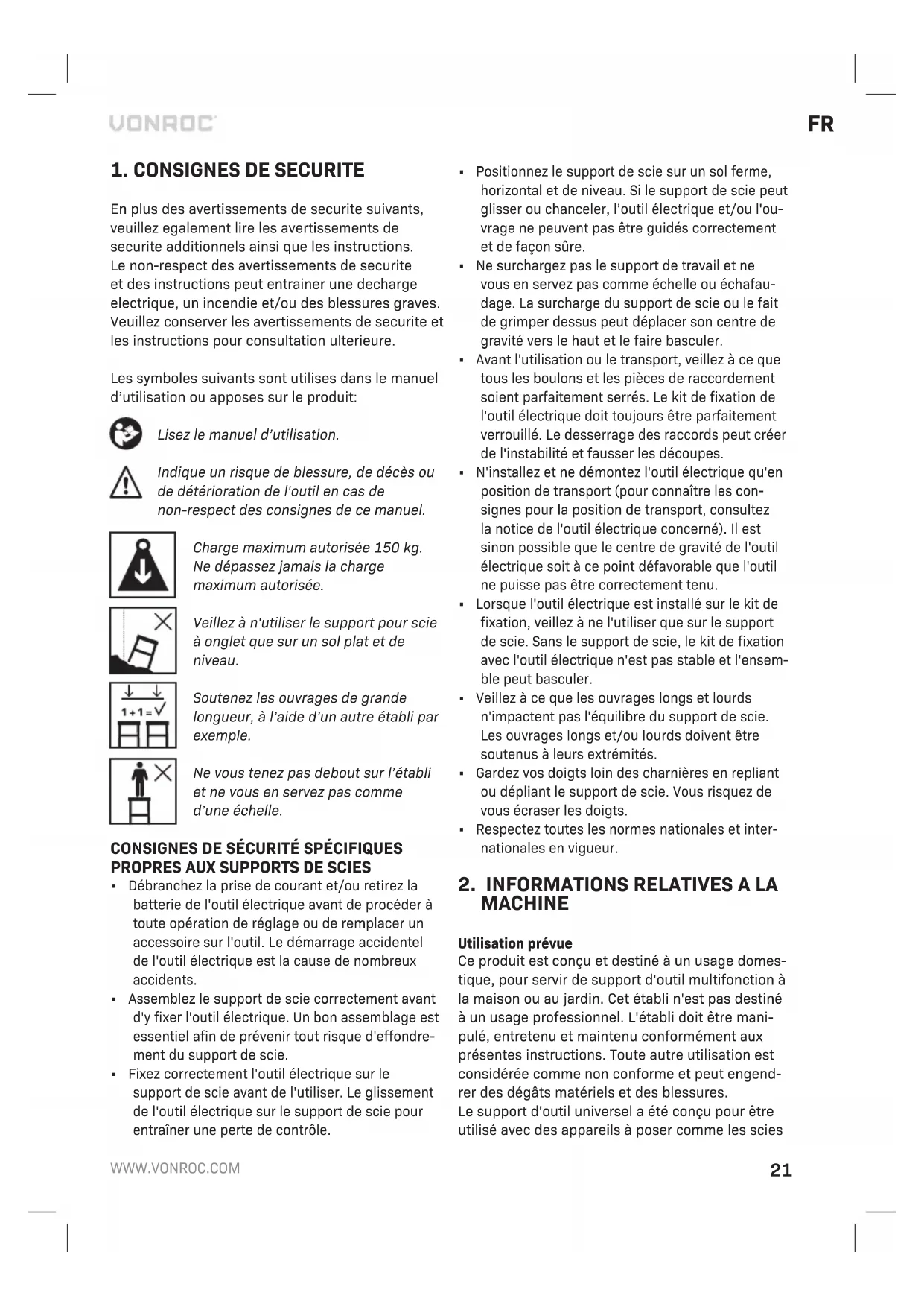 Le support de scie à onglet est conçu pour fonctionner de façon irréprochable pendant longtemps et avec un minimum d'entretien. Vous pouvez prolonger sa durée de vie en le nettoyant régulièrement et en le manipulant correctement. Nettoyage Nettoyez régulièrement le support de scie à onglet et de préférence après chaque utilisation. Net- toyez-le avec un produit d'entretien ménager adapté et un chiffon doux et sec. Ne plongez sous aucun prétexte votre support de scie à onglet dans l'eau ou dans tout autre liquide. N'utilisez pas de solvants (essence, alcool, ammoniaque, etc.) car ces sub- stances endommageraient les pièces en plastique. Maintenance N'utilisez jamais le support de scie à onglet s'il est endommagé ou cassé. Les réparations temporaires sont interdites. Vérifiez les pieds en plastique du support de scie à onglet avant et après chaque utilisation. N'utilisez pas le support de scie à onglet sans ses pieds en plastique ou si ces derniers sont usés. Procédez toujours à un contrôle visuel du support de scie à onglet avant et après chaque utilisation. Les réparations et la maintenance doivent être effectuées par une personne compétente avec des pièces de rechange adaptées. Les pièces d'autres société, non approuvées sont déconseillées et elles annulent votre garantie. GARANTIE Les produits VONROC sont développés aux plus hauts standards de qualité et ils sont garantis contre les défauts de pièces et de main d’oeuvre pendant la durée légale stipulée à partir de la date d’achat d’origine du produit. En cas d’une quelconque panne du produit pendant cette durée qui serait due à un défaut matériel et/ou de main d’oeuvre, contactez directement VONROC. Les circonstances suivantes ne sont pas prises en charge par la garantie: