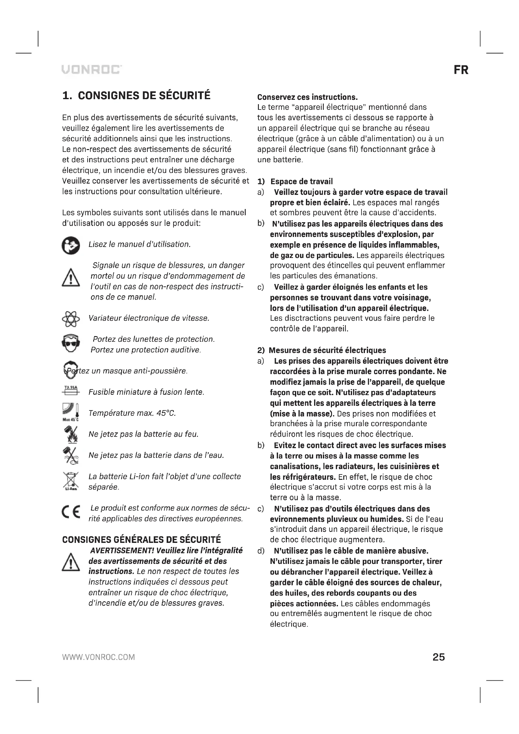 En plus des avertissements de sécurité suivants, veuillez également lire les avertissements de sécurité additionnels ainsi que les instructions. Le non-respect des avertissements de sécurité et des instructions peut entraîner une décharge électrique, un incendie et/ou des blessures graves. Veuillez conserver les avertissements de sécurité et les instructions pour consultation ultérieure. Les symboles suivants sont utilisés dans le manuel d’utilisation ou apposés sur le produit: Lisez le manuel d’utilisation. Signale un risque de blessures, un danger mortel ou un risque d’endommagement de l’outil en cas de non-respect des instructi- ons de ce manuel. Variateur électronique de vitesse. Portez des lunettes de protection. Portez une protection auditive. Portez un masque anti-poussière. Fusible miniature à fusion lente. Température max. 45°C. Ne jetez pas la batterie au feu. Ne jetez pas la batterie dans de l’eau. La batterie Li-ion fait l’objet d’une collecte séparée. Le produit est conforme aux normes de sécu- rité applicables des directives européennes. CONSIGNES GÉNÉRALES DE SÉCURITÉ AVERTISSEMENT! Veuillez lire l’intégralité des avertissements de sécurité et des instructions. Le non respect de toutes les instructions indiquées ci dessous peut entraîner un risque de choc électrique, d’incendie et/ou de blessures graves. Conservez ces instructions. Le terme “appareil électrique” mentionné dans tous les avertissements ci dessous se rapporte à un appareil électrique qui se branche au réseau électrique (grâce à un câble d’alimentation) ou à un appareil électrique (sans fil) fonctionnant grâce à une batterie.