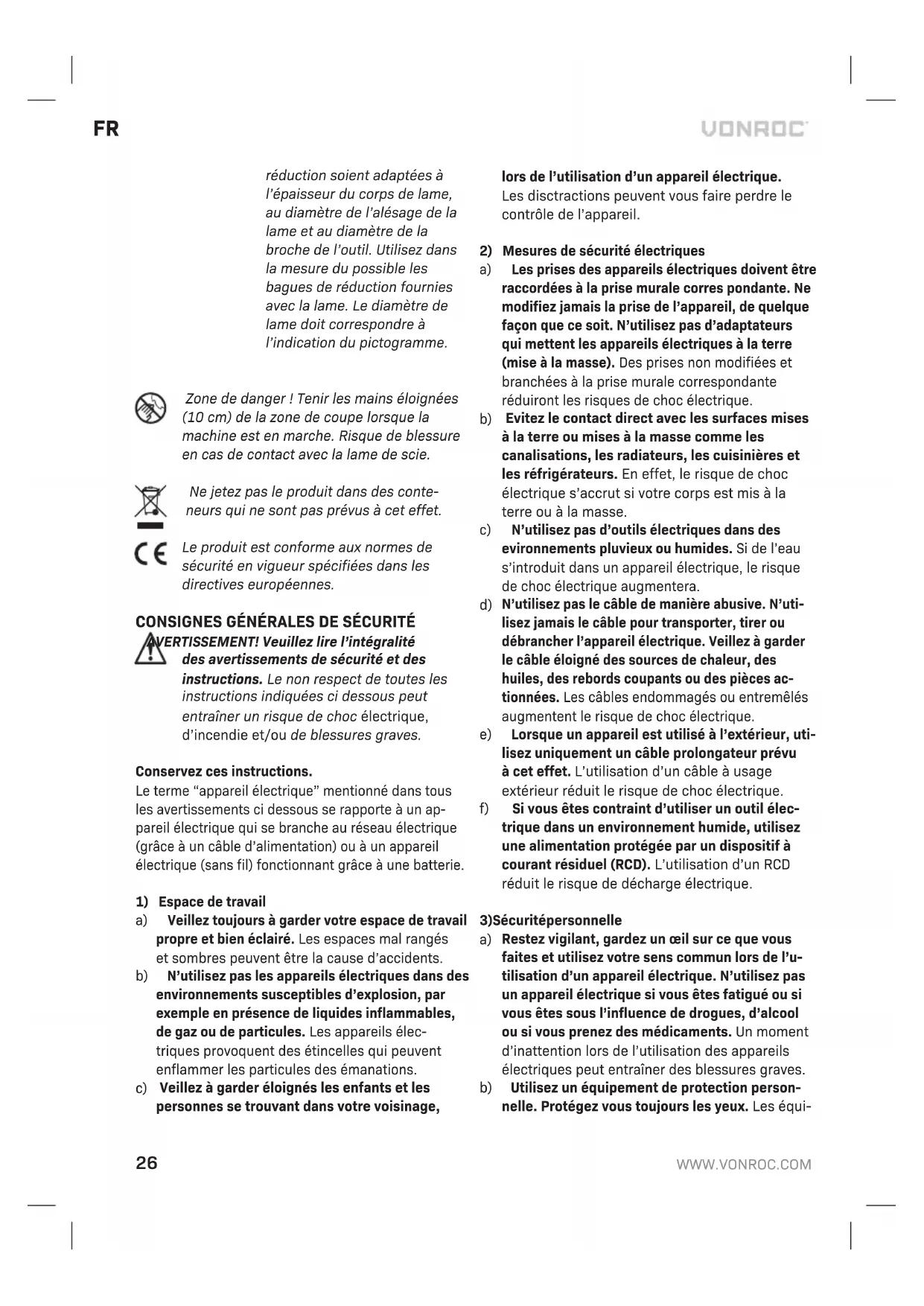 réduction soient adaptées à l’épaisseur du corps de lame, au diamètre de l’alésage de la lame et au diamètre de la broche de l’outil. Utilisez dans la mesure du possible les bagues de réduction fournies avec la lame. Le diamètre de lame doit correspondre à l’indication du pictogramme. Zone de danger ! Tenir les mains éloignées (10 cm) de la zone de coupe lorsque la machine est en marche. Risque de blessure en cas de contact avec la lame de scie. Ne jetez pas le produit dans des conte- neurs qui ne sont pas prévus à cet effet. Le produit est conforme aux normes de sécurité en vigueur spécifiées dans les directives européennes. CONSIGNES GÉNÉRALES DE SÉCURITÉ AVERTISSEMENT! Veuillez lire l’intégralité des avertissements de sécurité et des instructions. Le non respect de toutes les instructions indiquées ci dessous peut entraîner un risque de choc électrique, d’incendie et/ou de blessures graves. Conservez ces instructions. Le terme “appareil électrique” mentionné dans tous les avertissements ci dessous se rapporte à un ap- pareil électrique qui se branche au réseau électrique (grâce à un câble d’alimentation) ou à un appareil électrique (sans fil) fonctionnant grâce à une batterie.