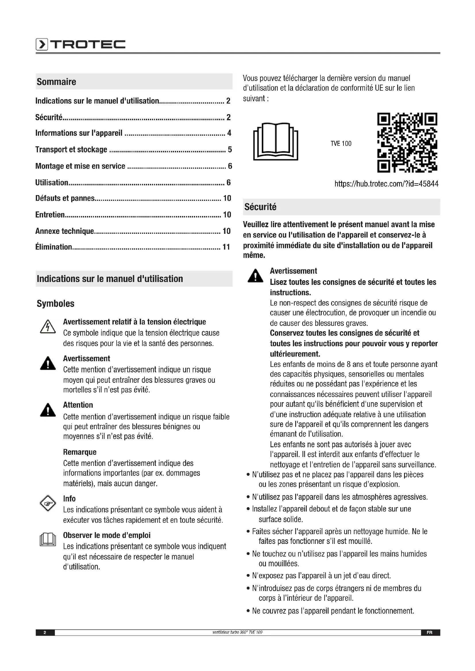 - Élimination Indications sur le manuel d'utilisation Symboles Avertissement relatif à la tension électrique Ce symbole indique que la tension électrique cause des risques pour la vie et la santé des personnes. Avertissement Cette mention d’avertissement indique un risque moyen qui peut entraîner des blessures graves ou mortelles s’il n’est pas évité. Attention Cette mention d’avertissement indique un risque faible qui peut entraîner des blessures bénignes ou moyennes s’il n’est pas évité. Remarque Cette mention d’avertissement indique des informations importantes (par ex. dommages matériels), mais aucun danger. Info Les indications présentant ce symbole vous aident à exécuter vos tâches rapidement et en toute sécurité. Observer le mode d’emploi Les indications présentant ce symbole vous indiquent qu’il est nécessaire de respecter le manuel d'utilisation. Vous pouvez télécharger la dernière version du manuel d’utilisation et la déclaration de conformité UE sur le lien suivant: TVE 100 https://hub.trotec.com/?id=45844 Sécurité Veuillez lire attentivement le présent manuel avant la mise en service ou l'utilisation de l'appareil et conservez-le à proximité immédiate du site d'installation ou de l'appareil même. Avertissement Lisez toutes les consignes de sécurité et toutes les instructions. Le non-respect des consignes de sécurité risque de causer une électrocution, de provoquer un incendie ou de causer des blessures graves. Conservez toutes les consignes de sécurité et toutes les instructions pour pouvoir vous y reporter ultérieurement. Les enfants de moins de 8 ans et toute personne ayant des capacités physiques, sensorielles ou mentales réduites ou ne possédant pas l'expérience et les connaissances nécessaires peuvent utiliser l'appareil pour autant qu'ils bénéficient d'une supervision et d’une instruction adéquate relative à une utilisation sure de l'appareil et qu'ils comprennent les dangers émanant de l’utilisation. Les enfants ne sont pas autorisés à jouer avec l'appareil. Il est interdit aux enfants d'effectuer le nettoyage et l'entretien de l’appareil sans surveillance. p. 11