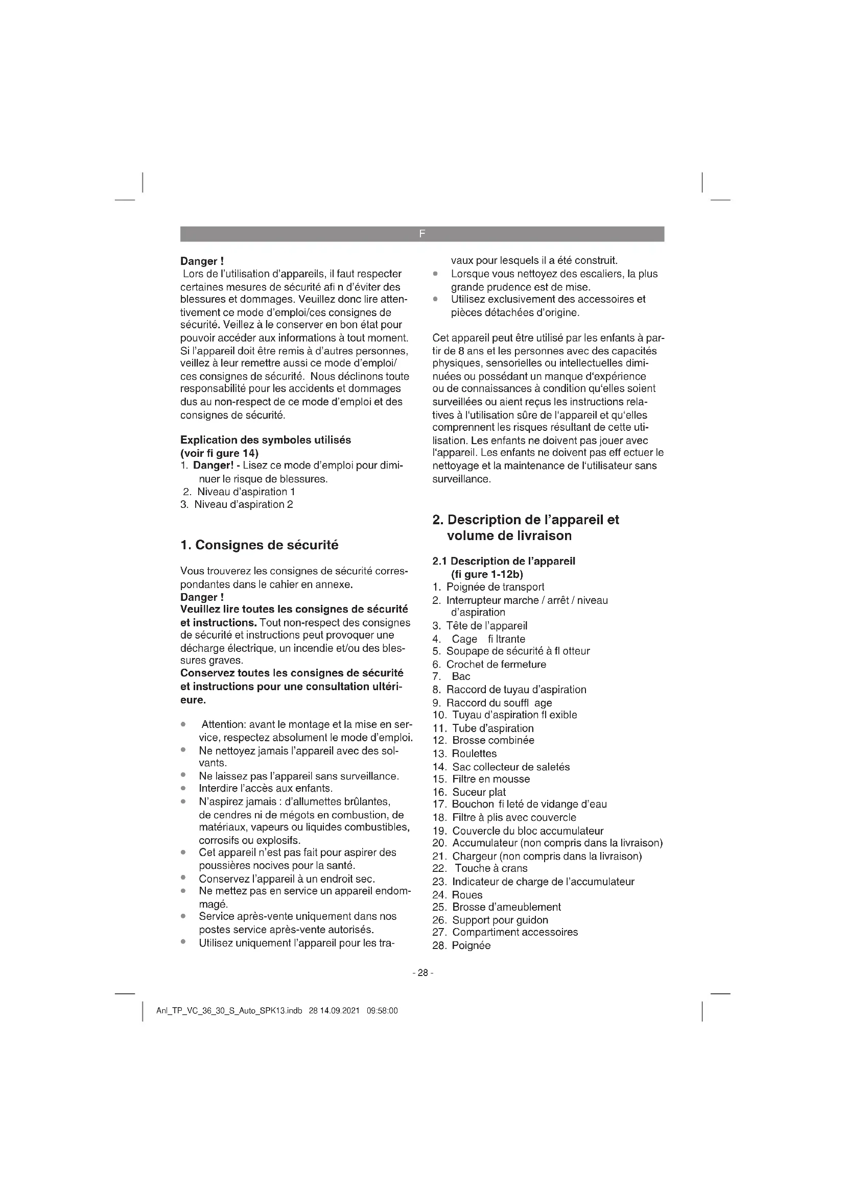 et le bloc accumulateur à notre service après-vente. Pour un envoi correct, nous vous prions de contacter notre service après-vente ou le point de vente où vous avez acheté l’appareil. Veillez à ce que, lors de l’envoi ou de la mise au rebut, les accumulateurs ou les appareils sans fi l soit emballés séparément dans des sacs en plastique afi n d’éviter les courts- circuits ou un incendie ! Dans l‘intérêt d‘une longue durée de fonctionne- ment du bloc accumulateur, vous devez prendre soin de recharger le bloc accumulateur en temps voulu. Ceci est dans tous les cas indispensable lorsque vous constatez une diminution de la puissance de l‘appareil. Ne déchargez jamais complètement le bloc accumulateur. Ceci cause l‘endommagement du bloc accumulateur ! Remarque ! Vous obtiendrez toujours les meilleurs résul- tats en termes d’endurance et de puissance d’aspiration en utilisant des accumulateurs de même capacité à partir de 3,0 Ah. Remarque ! Utilisez exclusivement des accumulateurs avec le même niveau de charge, ne combinez jamais un accumulateur plein avec un accumulateur partiellement déchargé. Mettez toujours les deux accumulateurs à charger simultanément. L’accumulateur le moins chargé déterminera la durée de fonctionnement de l’appareil. Les deux accumulateurs doivent toujours être com- plètement chargés avant utilisation. Fermez le couvercle du bloc accumulateur en le rabattant et vérifi ez que le verrouillage est bien emboîté. Montage de l’accumulateur (fi g. 8) Relevez le couvercle du bloc accumulateur (19) comme indiqué dans la fi gure 8. Insérez ensuite les deux accumulateurs (20) dans les logements. Indicateur de charge de l‘accumulateur (fi gure 12b/23) Appuyez sur l‘interrupteur pour l‘indicateur de charge de l‘accumulateur (a). L‘indicateur de charge de l‘accumulateur (23) vous indique l‘état d‘autonomie de l‘accumulateur à l‘aide de trois voyants LED colorés. Les 3 voyants LED sont allumés : L’accumulateur est complètement rechargé. 2 ou 1 voyant LED est (sont) allumé(s) L‘accumulateur dispose encore d‘un résidu de charge suffi sant. 1 voyant LED clignote : L’accumulateur est vide, il faut le recharger. Tous les voyants LED clignotent : La température de l’accumulateur est trop faible. Retirez l’accumulateur de l’appareil et laissez-le reposer pendant un jour à température ambiante. Si l’erreur survient à nouveau, cela signifi e que l’accumulateur est en décharge profonde et dé- fectueux. Retirez l’accumulateur de l’appareil. Un accumulateur défectueux ne doit plus être utilisé ou chargé.