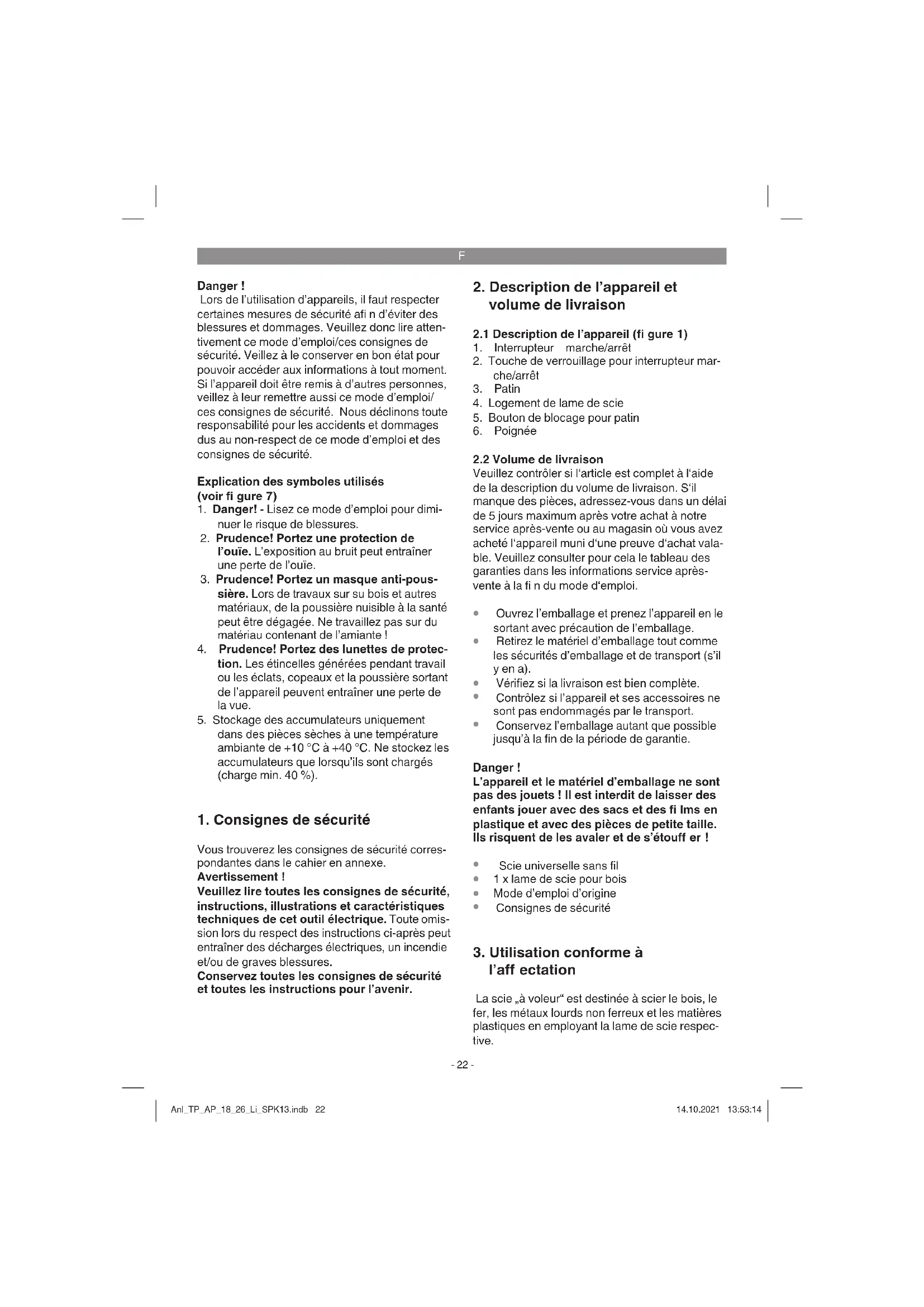 l’aff ectation La scie „à voleur“ est destinée à scier le bois, le fer, les métaux lourds non ferreux et les matières plastiques en employant la lame de scie respec- tive. Anl_TP_AP_18_26_Li_SPK13.indb 22Anl_TP_AP_18_26_Li_SPK13.indb 22 14.10.2021 13:53:1414.10.2021 13:53:14F