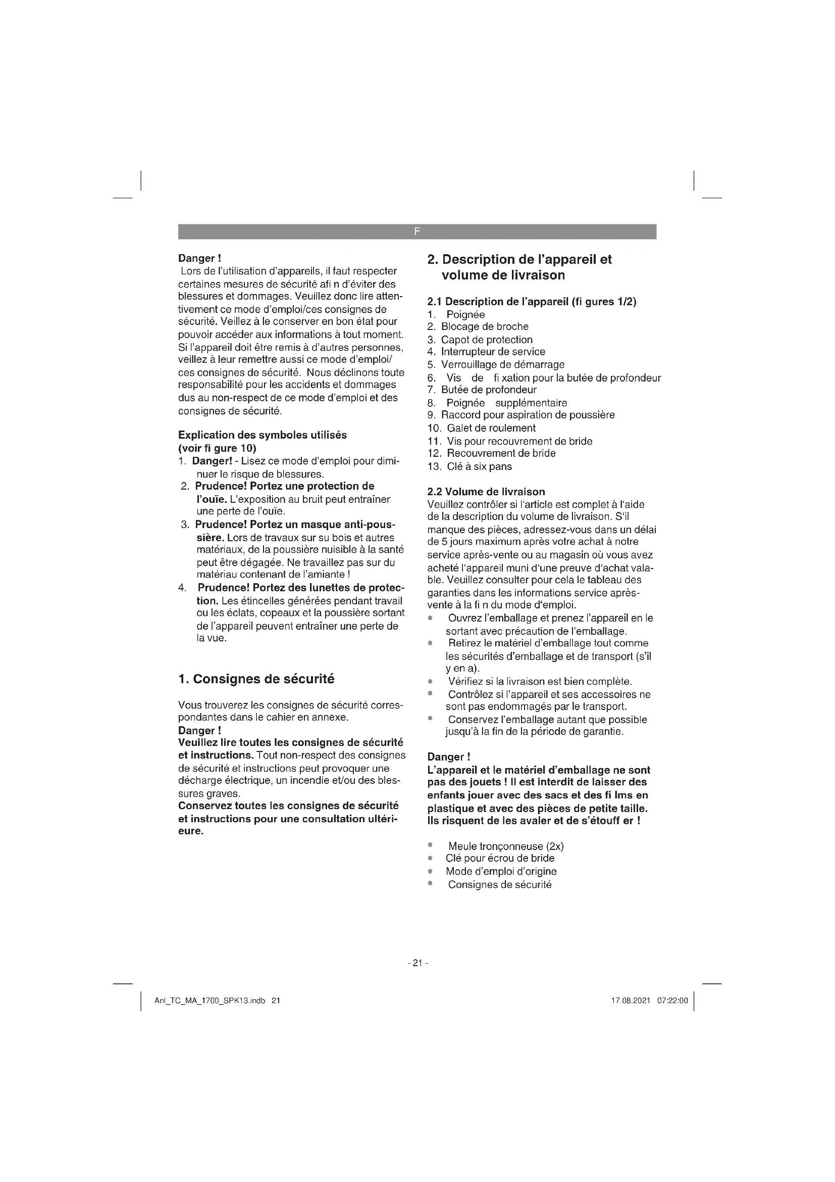 main-bras, si l’appareil est utilisé pendant une longue période ou s’il n’a pas été employé ou entretenu dans les règles de l’art. Anl_TC_MA_1700_SPK13.indb 22Anl_TC_MA_1700_SPK13.indb 22 17.08.2021 07:22:0017.08.2021 07:22:00F