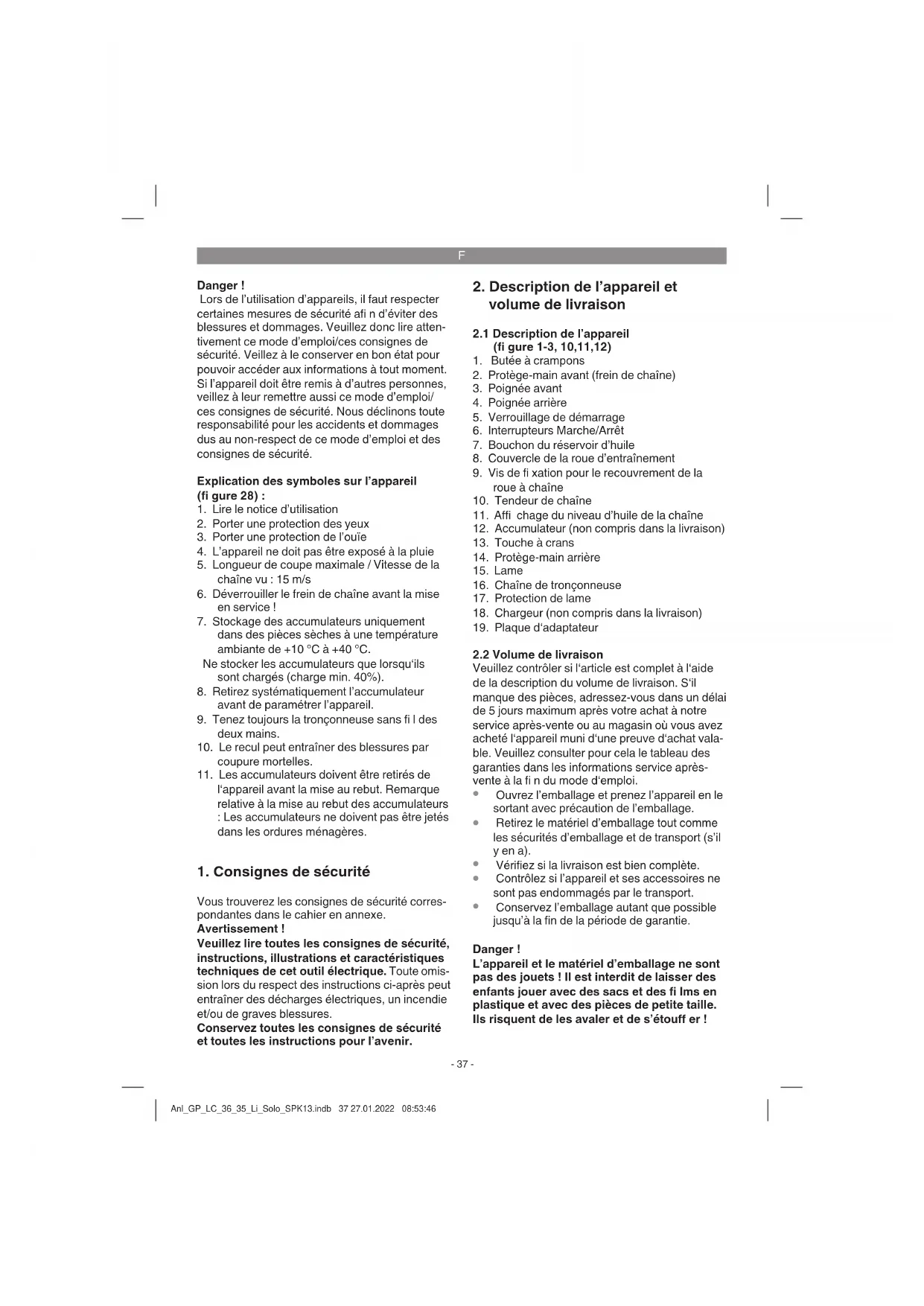 Conservez l’emballage autant que possible jusqu’à la fin de la période de garantie. Danger ! L’appareil et le matériel d’emballage ne sont pas des jouets ! Il est interdit de laisser des enfants jouer avec des sacs et des fi lms en plastique et avec des pièces de petite taille. Ils risquent de les avaler et de s’étouff er ! Anl_GP_LC_36_35_Li_Solo_SPK13.indb 37 27.01.2022 08:53:46F
