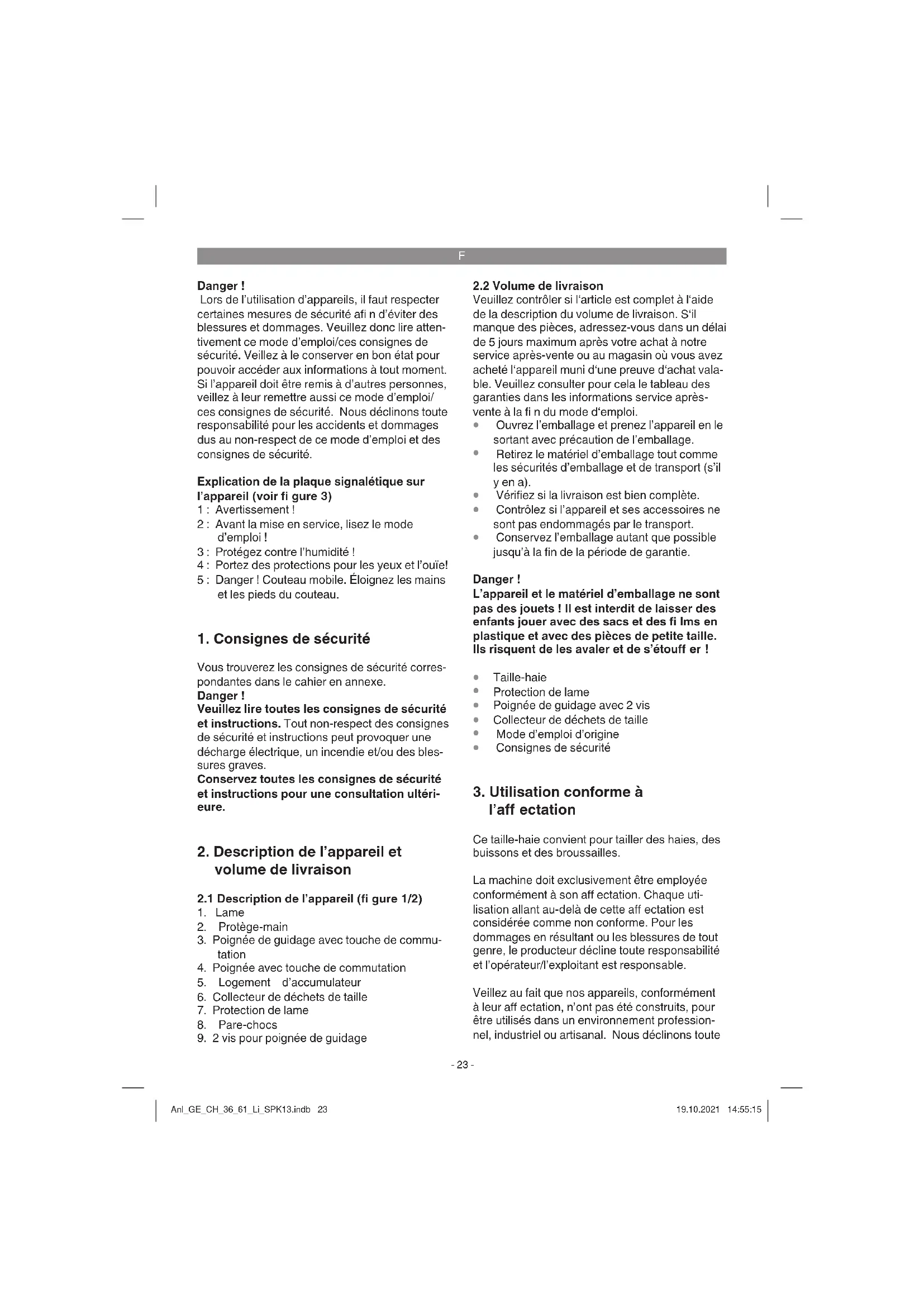 l’aff ectation Ce taille-haie convient pour tailler des haies, des buissons et des broussailles. La machine doit exclusivement être employée conformément à son aff ectation. Chaque uti- lisation allant au-delà de cette aff ectation est considérée comme non conforme. Pour les dommages en résultant ou les blessures de tout genre, le producteur décline toute responsabilité et l’opérateur/l’exploitant est responsable. Veillez au fait que nos appareils, conformément à leur aff ectation, n’ont pas été construits, pour être utilisés dans un environnement profession- nel, industriel ou artisanal. Nous déclinons toute Anl_GE_CH_36_61_Li_SPK13.indb 23Anl_GE_CH_36_61_Li_SPK13.indb 23 19.10.2021 14:55:1519.10.2021 14:55:15F