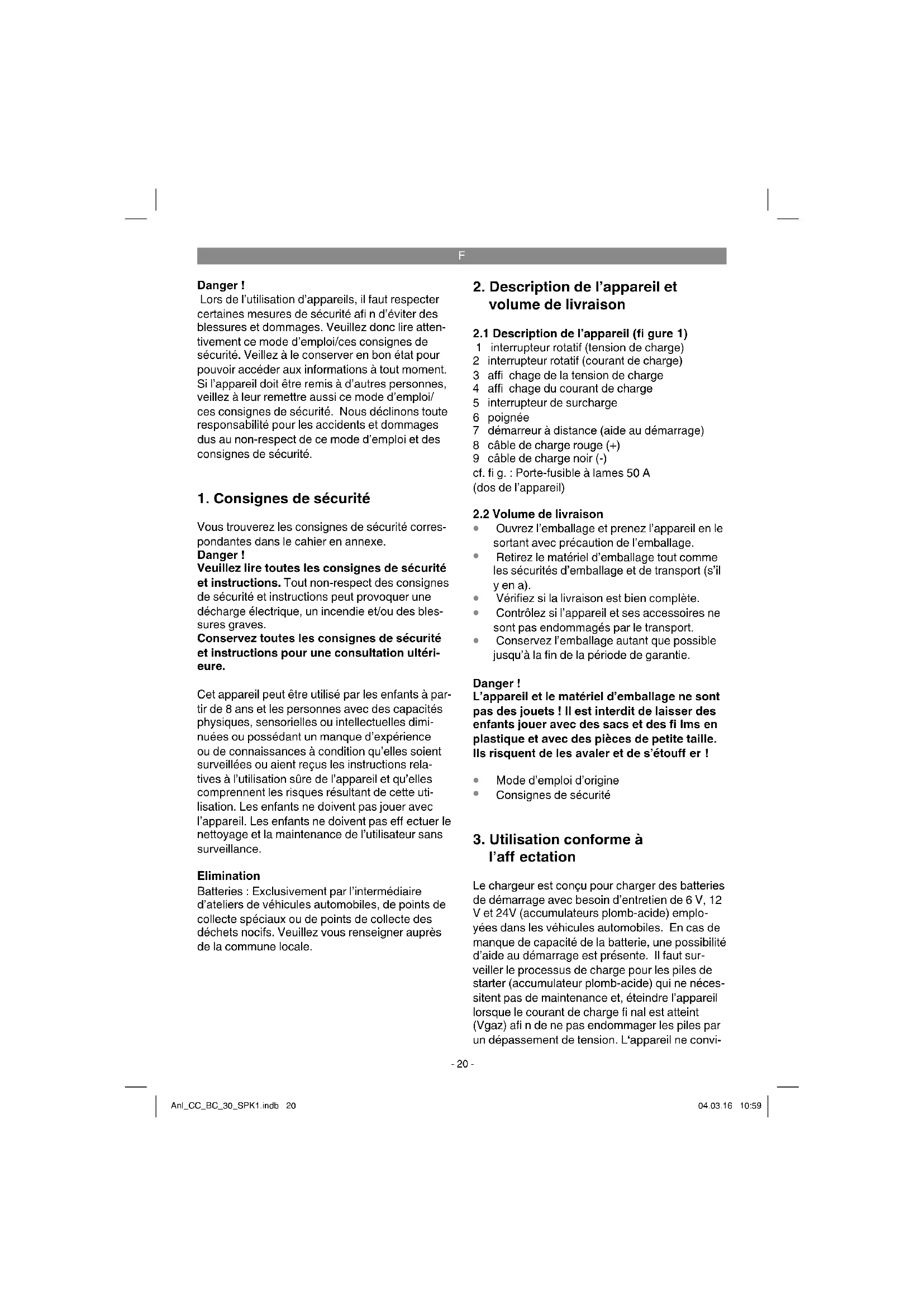 l’aff ectation Le chargeur est conçu pour charger des batteries de démarrage avec besoin d’entretien de 6 V, 12 V et 24V (accumulateurs plomb-acide) emplo- yées dans les véhicules automobiles. En cas de manque de capacité de la batterie, une possibilité d’aide au démarrage est présente. Il faut sur- veiller le processus de charge pour les piles de starter (accumulateur plomb-acide) qui ne néces- sitent pas de maintenance et, éteindre l’appareil lorsque le courant de charge fi nal est atteint (Vgaz) afi n de ne pas endommager les piles par un dépassement de tension. L‘appareil ne convi- Anl_CC_BC_30_SPK1.indb 20Anl_CC_BC_30_SPK1.indb 20 04.03.16 10:5904.03.16 10:59F