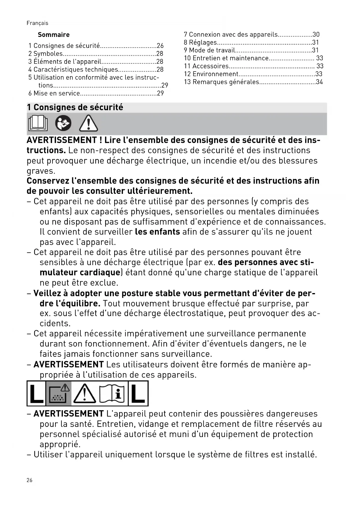 - 13 Remarques générales 1 Consignes de sécurité AVERTISSEMENT! Lire l'ensemble des consignes de sécurité et des ins tructions. Le non-respect des consignes de sécurité et des instructions peut provoquer une décharge électrique, un incendie et/ou des blessures graves. Conservez l'ensemble des consignes de sécurité et des instructions afin de pouvoir les consulter ultérieurement. – Cet appareil ne doit pas être utilisé par des personnes (y compris des enfants) aux capacités physiques, sensorielles ou mentales diminuées ou ne disposant pas de suffisamment d'expérience et de connaissances. Il convient de surveiller les enfants afin de s'assurer qu'ils ne jouent pas avec l'appareil. – Cet appareil ne doit pas être utilisé par des personnes pouvant être sensibles à une décharge électrique (par ex. des personnes avec sti mulateur cardiaque) étant donné qu'une charge statique de l'appareil ne peut être exclue. – Veillez à adopter une posture stable vous permettant d'éviter de per dre l'équilibre. Tout mouvement brusque effectué par surprise, par ex. sous l'effet d'une décharge électrostatique, peut provoquer des ac cidents. – Cet appareil nécessite impérativement une surveillance permanente durant son fonctionnement. Afin d'éviter d'éventuels dangers, ne le faites jamais fonctionner sans surveillance. – AVERTISSEMENT Les utilisateurs doivent être formés de manière ap propriée à l'utilisation de ces appareils. – AVERTISSEMENT L'appareil peut contenir des poussières dangereuses pour la santé. Entretien, vidange et remplacement de filtre réservés au personnel spécialisé autorisé et muni d'un équipement de protection approprié. – Utiliser l'appareil uniquement lorsque le système de filtres est installé. Français 26– Utiliser l'appareil uniquement avec un équipement de protection appro prié. – Travailler dans un environnement sec, après avoir reçu les instructions nécessaires, et uniquement après avoir effectué un contrôle visuel pour s'assurer que l'appareil est en bon état. – Risque d'explosion et d'incendie! Ne pas aspirer: – les étincelles, les fragments incandescents ou les poussières chau des; – les substances inflammables ou explosives (par ex. magnésium, alu minium, essence, diluants); – les substances agressives (par ex. acides, solutions alcalines, sol vants); – les substances chimiques réactives entraînant un dégagement de chaleur ou la formation d'acides/bases, de gaz, etc. (par ex. bi-maté riaux réactifs, aluminium et eau). – Respecter les règlements de sécurité en vigueur dans le pays d'utilisa tion ainsi que les consignes du fabricant du matériau. p. 34