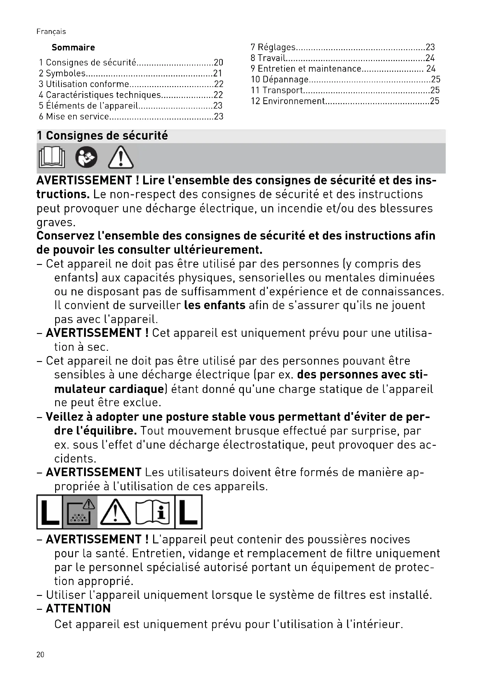 - 12 Environnement 1 Consignes de sécurité AVERTISSEMENT! Lire l'ensemble des consignes de sécurité et des ins tructions. Le non-respect des consignes de sécurité et des instructions peut provoquer une décharge électrique, un incendie et/ou des blessures graves. Conservez l'ensemble des consignes de sécurité et des instructions afin de pouvoir les consulter ultérieurement. – Cet appareil ne doit pas être utilisé par des personnes (y compris des enfants) aux capacités physiques, sensorielles ou mentales diminuées ou ne disposant pas de suffisamment d'expérience et de connaissances. Il convient de surveiller les enfants afin de s'assurer qu'ils ne jouent pas avec l'appareil. – AVERTISSEMENT! Cet appareil est uniquement prévu pour une utilisa tion à sec. – Cet appareil ne doit pas être utilisé par des personnes pouvant être sensibles à une décharge électrique (par ex. des personnes avec sti mulateur cardiaque) étant donné qu'une charge statique de l'appareil ne peut être exclue. – Veillez à adopter une posture stable vous permettant d'éviter de per dre l'équilibre. Tout mouvement brusque effectué par surprise, par ex. sous l'effet d'une décharge électrostatique, peut provoquer des ac cidents. – AVERTISSEMENT Les utilisateurs doivent être formés de manière ap propriée à l'utilisation de ces appareils. – AVERTISSEMENT! L'appareil peut contenir des poussières nocives pour la santé. Entretien, vidange et remplacement de filtre uniquement par le personnel spécialisé autorisé portant un équipement de protec tion approprié. – Utiliser l'appareil uniquement lorsque le système de filtres est installé. – ATTENTION Cet appareil est uniquement prévu pour l'utilisation à l'intérieur. Français 20Cet appareil ne peut être stocké qu'à l'intérieur. – Utiliser l'appareil uniquement avec un équipement de protection appro prié. – Travailler dans un environnement sec, après avoir reçu les instructions nécessaires, et uniquement après avoir effectué un contrôle visuel pour s'assurer que l'appareil est en bon état. – Risque d'explosion et d'incendie! Ne pas aspirer: – les étincelles, les fragments incandescents ou les poussières chau des; – les substances inflammables ou explosives (par ex. magnésium, alu minium, essence, diluants); – les substances agressives (par ex. acides, solutions alcalines, sol vants); – les substances chimiques réactives entraînant un dégagement de chaleur ou la formation d'acides/bases, de gaz, etc. (par ex. bi-maté riaux réactifs, aluminium et eau). – Respecter les règlements de sécurité en vigueur dans le pays d'utilisa tion ainsi que les consignes du fabricant du matériau. p. 25