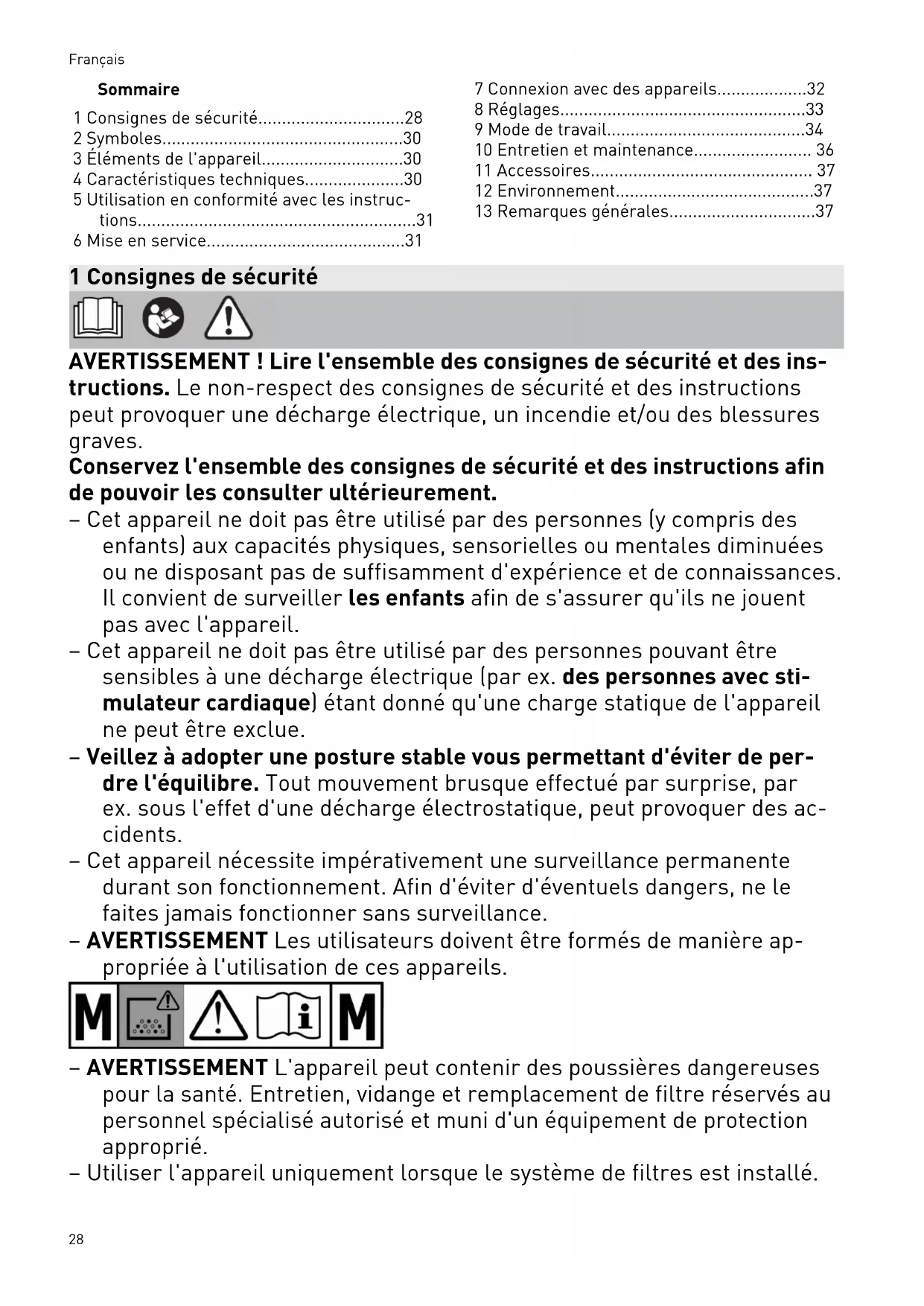 - 13 Remarques générales 1 Consignes de sécurité AVERTISSEMENT! Lire l'ensemble des consignes de sécurité et des ins tructions. Le non-respect des consignes de sécurité et des instructions peut provoquer une décharge électrique, un incendie et/ou des blessures graves. Conservez l'ensemble des consignes de sécurité et des instructions afin de pouvoir les consulter ultérieurement. – Cet appareil ne doit pas être utilisé par des personnes (y compris des enfants) aux capacités physiques, sensorielles ou mentales diminuées ou ne disposant pas de suffisamment d'expérience et de connaissances. Il convient de surveiller les enfants afin de s'assurer qu'ils ne jouent pas avec l'appareil. – Cet appareil ne doit pas être utilisé par des personnes pouvant être sensibles à une décharge électrique (par ex. des personnes avec sti mulateur cardiaque) étant donné qu'une charge statique de l'appareil ne peut être exclue. – Veillez à adopter une posture stable vous permettant d'éviter de per dre l'équilibre. Tout mouvement brusque effectué par surprise, par ex. sous l'effet d'une décharge électrostatique, peut provoquer des ac cidents. – Cet appareil nécessite impérativement une surveillance permanente durant son fonctionnement. Afin d'éviter d'éventuels dangers, ne le faites jamais fonctionner sans surveillance. – AVERTISSEMENT Les utilisateurs doivent être formés de manière ap propriée à l'utilisation de ces appareils. – AVERTISSEMENT L'appareil peut contenir des poussières dangereuses pour la santé. Entretien, vidange et remplacement de filtre réservés au personnel spécialisé autorisé et muni d'un équipement de protection approprié. – Utiliser l'appareil uniquement lorsque le système de filtres est installé. Français 28– Utiliser l'appareil uniquement avec un équipement de protection appro prié. – Travailler dans un environnement sec, après avoir reçu les instructions nécessaires, et uniquement après avoir effectué un contrôle visuel pour s'assurer que l'appareil est en bon état. – Risque d'explosion et d'incendie! Ne pas aspirer: – les étincelles, les fragments incandescents ou les poussières chau des; – les substances inflammables ou explosives (par ex. magnésium, alu minium, essence, diluants); – les substances agressives (par ex. acides, solutions alcalines, sol vants); – les substances chimiques réactives entraînant un dégagement de chaleur ou la formation d'acides/bases, de gaz, etc. (par ex. bi-maté riaux réactifs, aluminium et eau). – Respecter les règlements de sécurité en vigueur dans le pays d'utilisa tion ainsi que les consignes du fabricant du matériau. p. 37